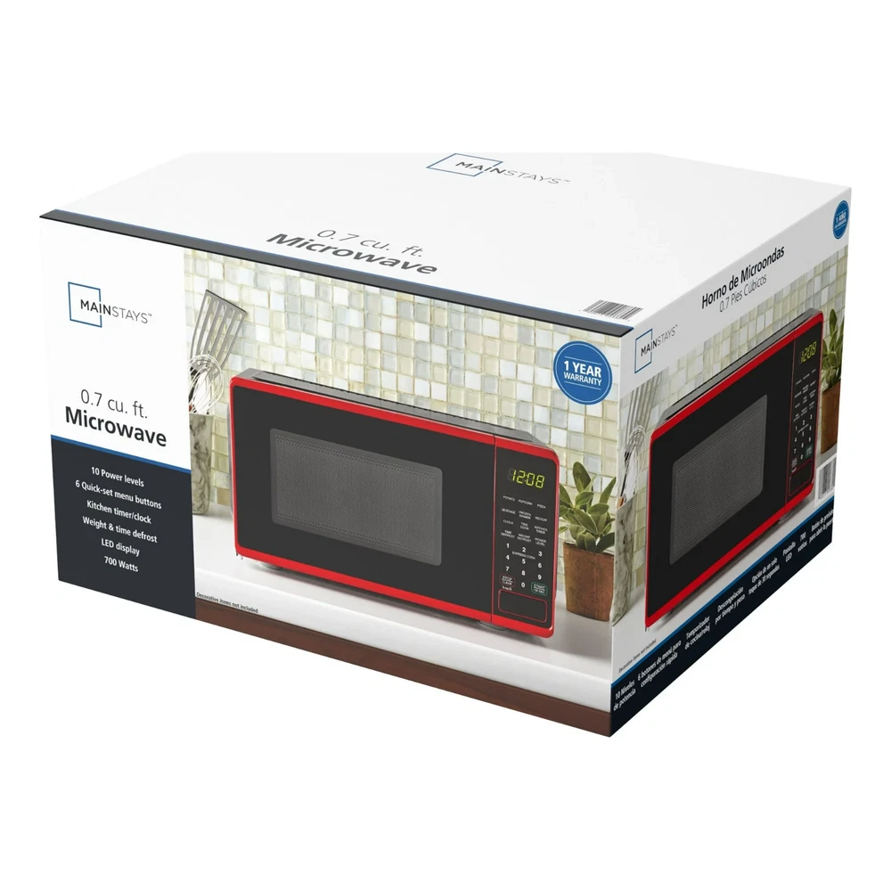 0.7 Cu ft Countertop Microwave Oven, 700 Watts, Red New - Free Shipping Mainstays 0.7 Cu ft 700-Watt Compact Countertop Microwave Oven is available in 3 colors including Black, Red or White. Each color is designed to complement your kitchen, dorm room, office or rec room. Features include LED display, kitchen timer & clock, 10 different power levels for cooking a variety of foods, weight & time defrost, 6 convenient quick-set menu buttons, 30 second one-touch option, child safety lockout and a push-button door. The Mainstays 0.7 Cu ft 700-Watt Compact Countertop Microwave Oven is the perfect addition to any home. Condition: New, Stock Number: MS8436127995-02 Capacity 0.7 Cu ft LED display Kitchen timer & clock Weight & time defrost Child-safe lockout 700-Watt Power Push-button door opening 30 Second one-touch option Condition: New 10 Power levels 6 Quick-set menu buttons Stock Number: MS8436127995-02