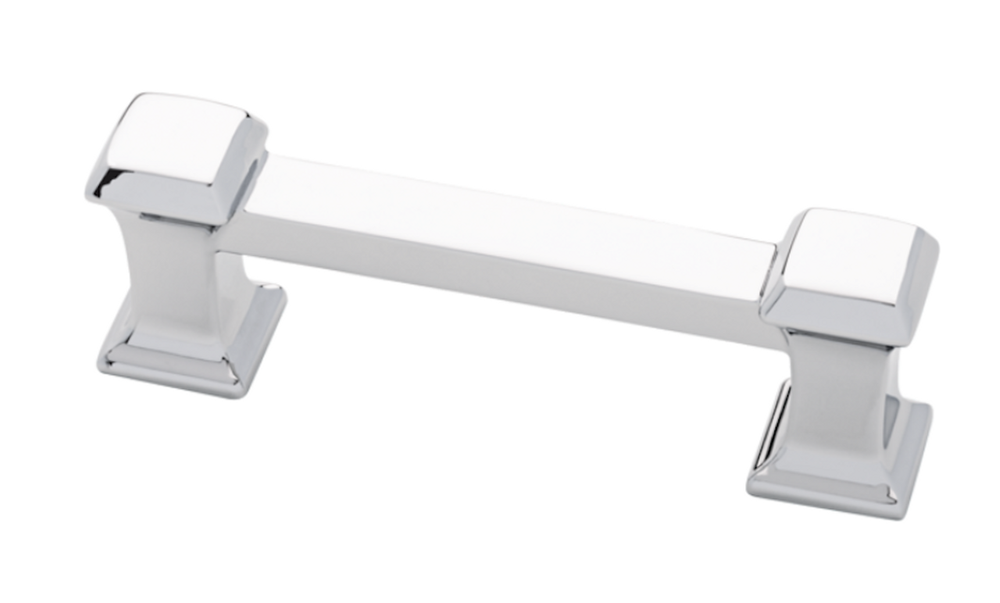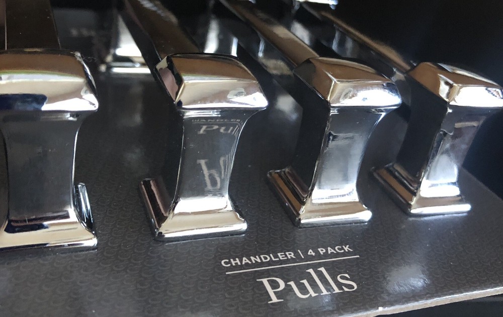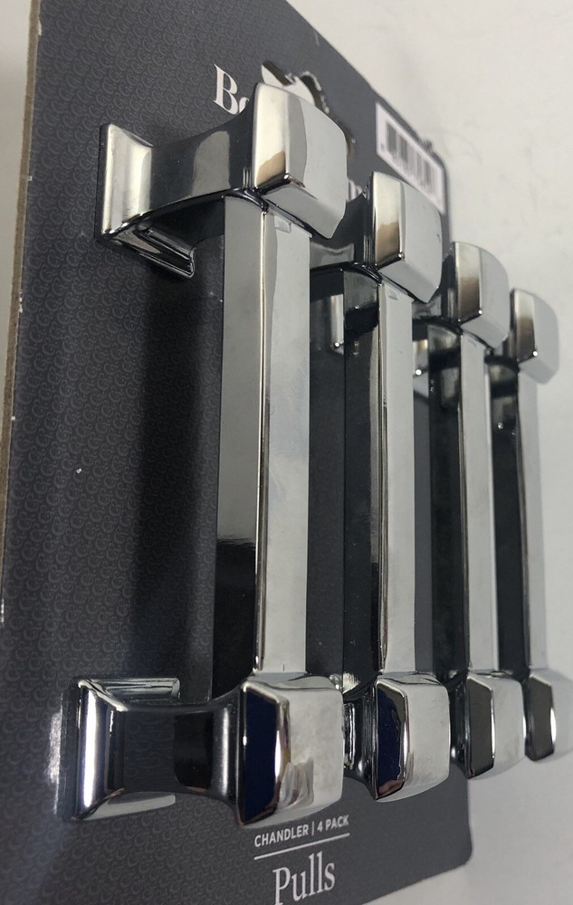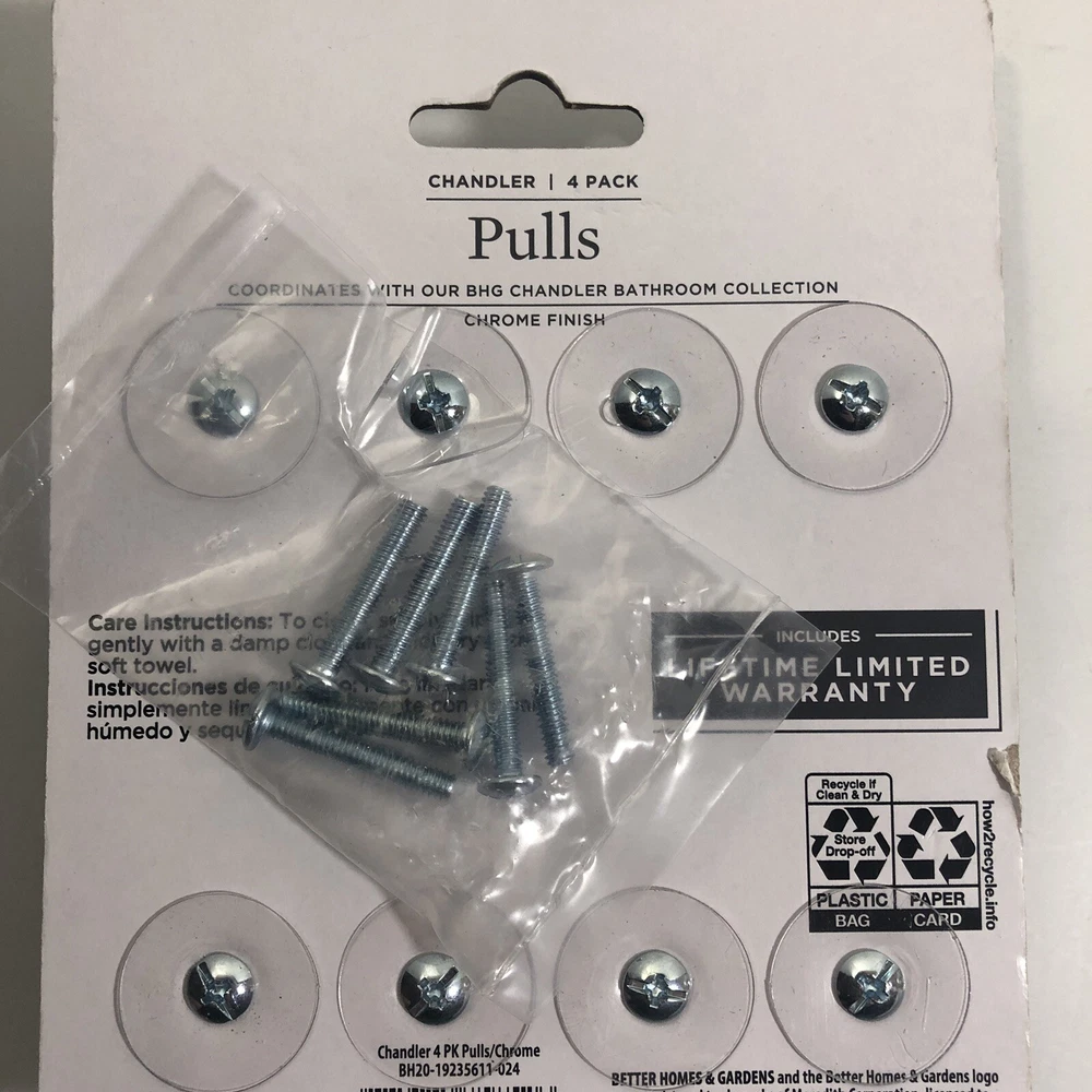 Better Homes & Gardens Chandler Cabinet & Drawer Pull 1 pack=4 pulls With a stylish and classic design, the Chandler Collection instantly upgrades any space. This cabinet pull is made of sturdy and durable materials so it can stand the test of time. Each package includes all items required for installation. DETAILS Polished Chrome Finish 1 pack contains 4 Pulls High quality, upscale design will give a beautiful update to any cabinetry Durable metal construction Screw holes are 3" center to center Chandler Model Measures approx. 3 3/4 long x 5/8". They come with a set of screws needed for installation. The packaging is dinged up and damaged on the corners. Pull handles may have minor to light scuffing.