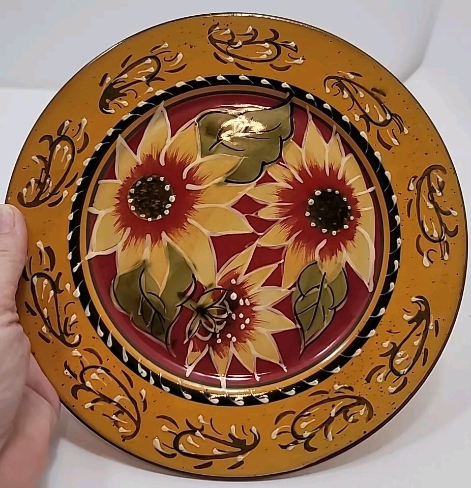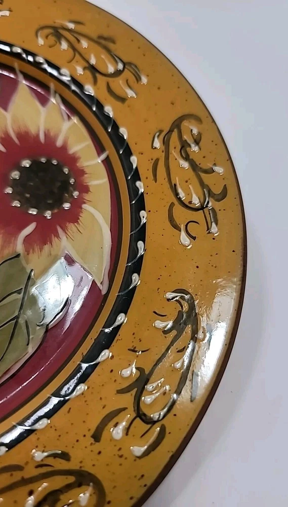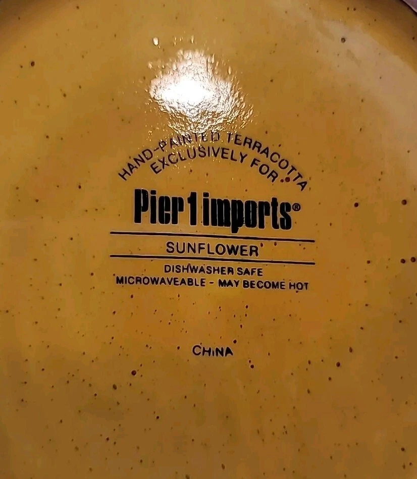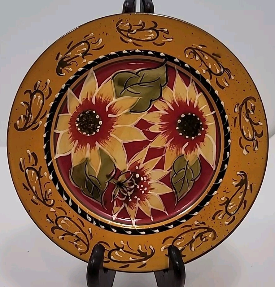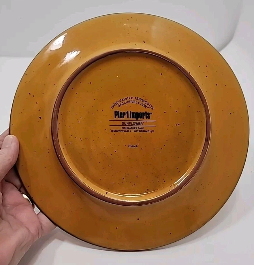 Add a touch of elegance to your dining table with this beautiful terracotta salad dessert plate from Pier 1 Imports. The plate features a stunning hand-painted sunflower design on a round shape, perfect for all occasions. This original 21st-century piece is made of earthenware and has a glossy finish, making it both decorative and functional. The plate is 8 1/8" in diameter, weighs 14 oz, and is dishwasher safe for easy cleaning. It is a perfect addition to any collection and is printed with the brand's backstamp. This original piece from China is sure to impress your guests and add a touch of flower-themed charm to your home.