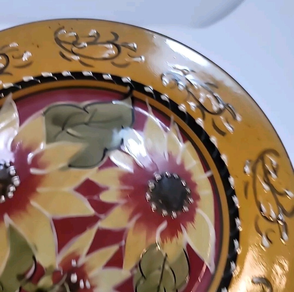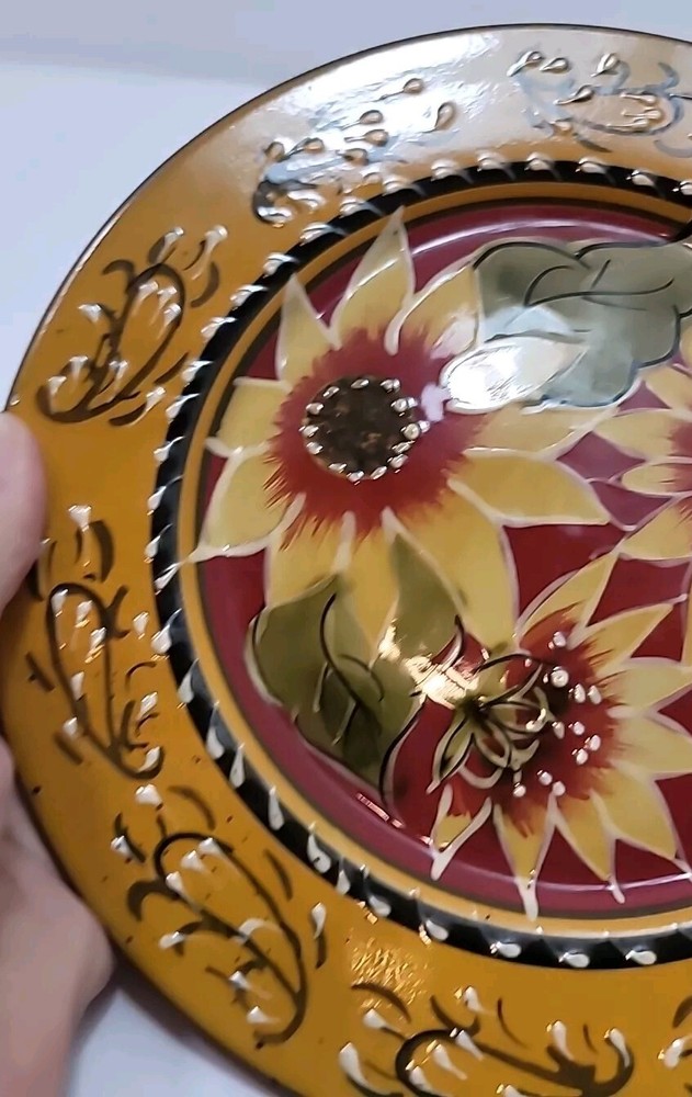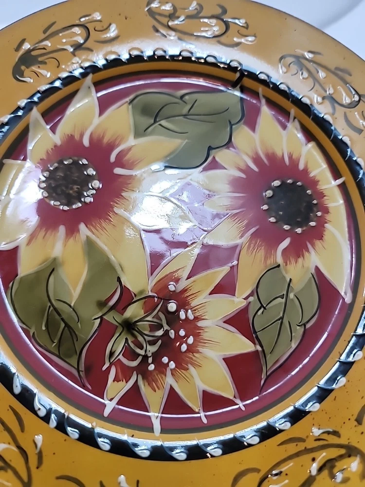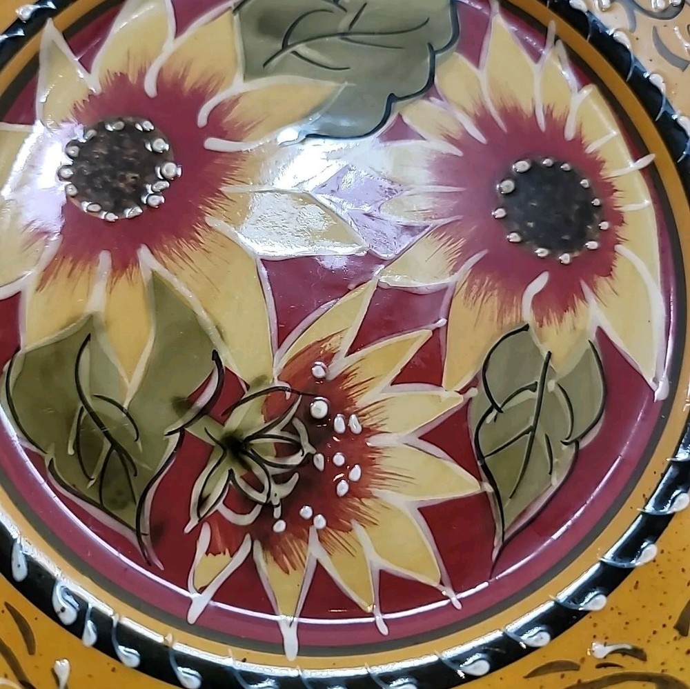Add a touch of elegance to your dining table with this beautiful terracotta salad dessert plate from Pier 1 Imports. The plate features a stunning hand-painted sunflower design on a round shape, perfect for all occasions. This original 21st-century piece is made of earthenware and has a glossy finish, making it both decorative and functional. The plate is 8 1/8" in diameter, weighs 14 oz, and is dishwasher safe for easy cleaning. It is a perfect addition to any collection and is printed with the brand's backstamp. This original piece from China is sure to impress your guests and add a touch of flower-themed charm to your home.