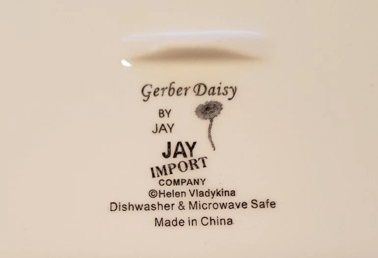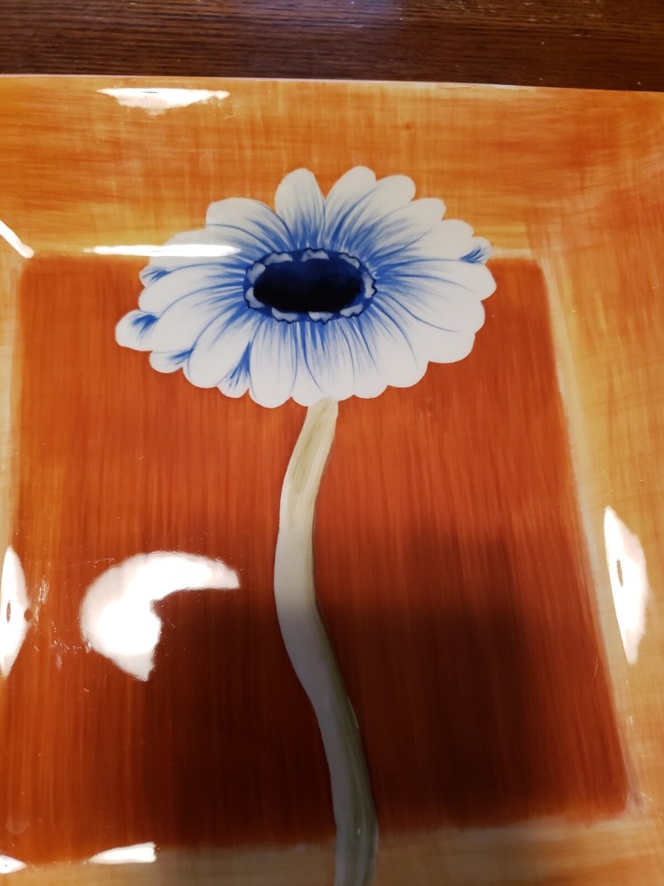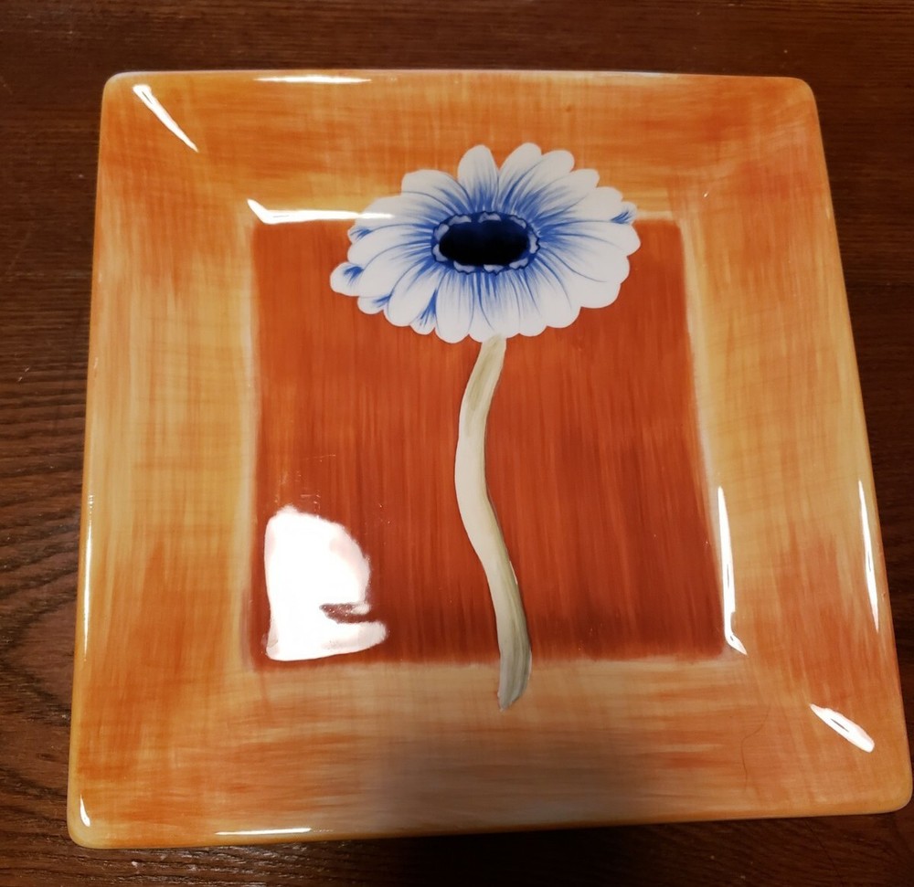 This vintage square plate by Jay Imports features a colorful Gerber Daisy pattern, perfect for any occasion. The plate is made of ceramic material with a glossy finish and measures 8 inches in length and width, and 8 inches in height. This decorative salad plate is an original and licensed reproduction, and is perfect for adding a touch of flower-themed decor to your home. The backstamp is printed and the plate is not antique or handmade. The plate may have some clear crazing or a few minute fleabit chips,, but I don't see any.. please see pictures.. Set includes one plate.