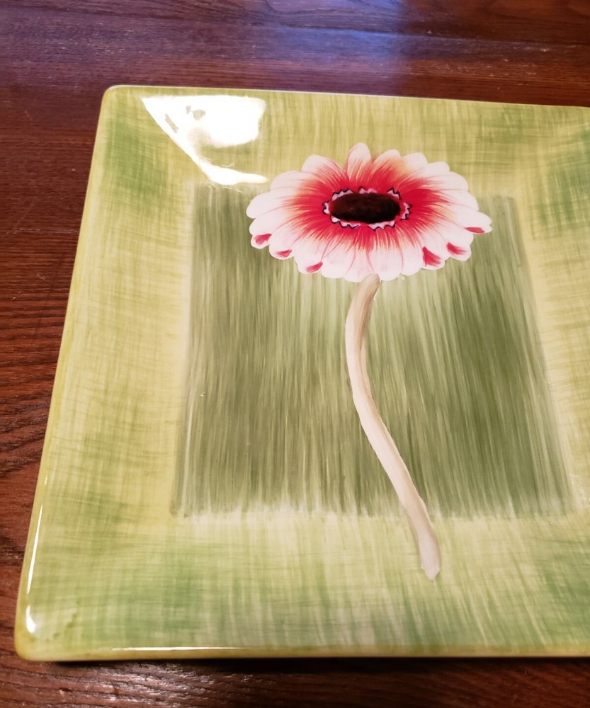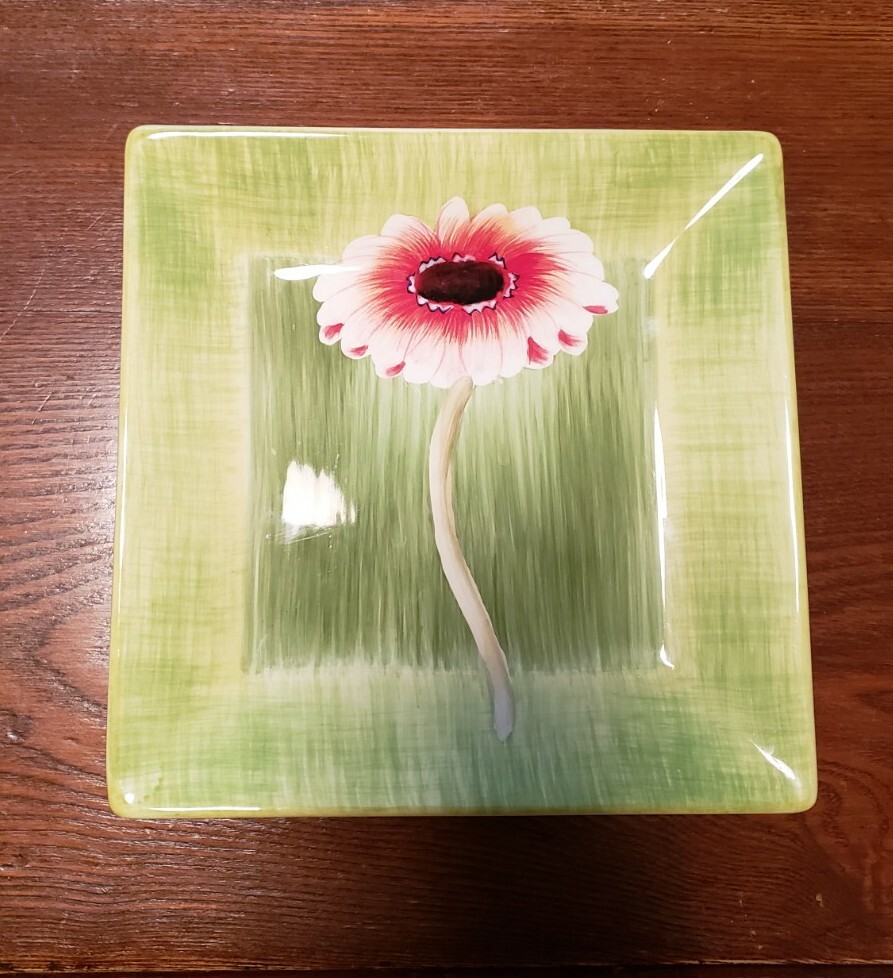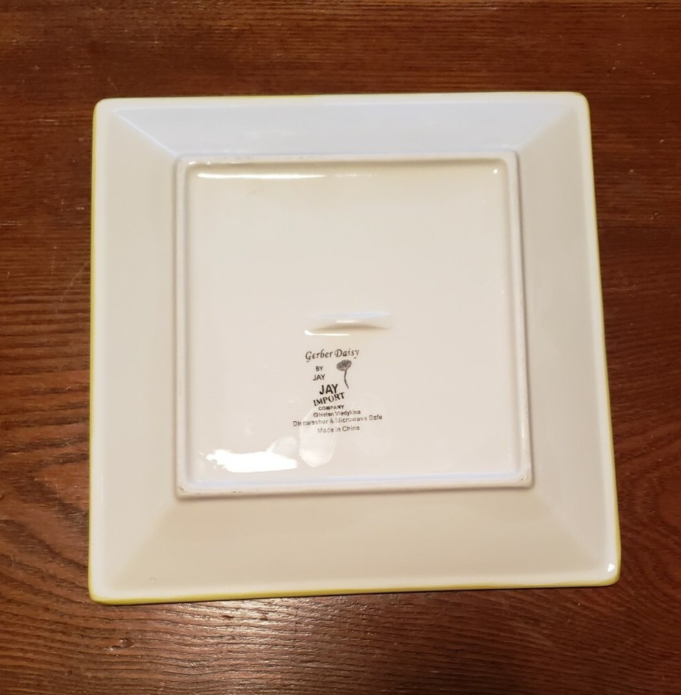 This vintage square plate by Jay Imports features a colorful Gerber Daisy pattern, perfect for any occasion. The plate is made of ceramic material with a glossy finish and measures 8 inches in length and width, and 8 inches in height. This decorative salad plate is an original and licensed reproduction, and is perfect for adding a touch of flower-themed decor to your home. The backstamp is printed and the plate is not antique or handmade. The plate may have some clear crazing or a few minute fleabit chips,, but I don't see any.. please see pictures.. Set includes one plate.