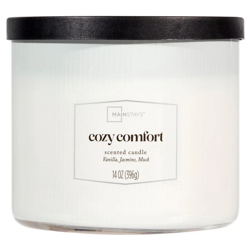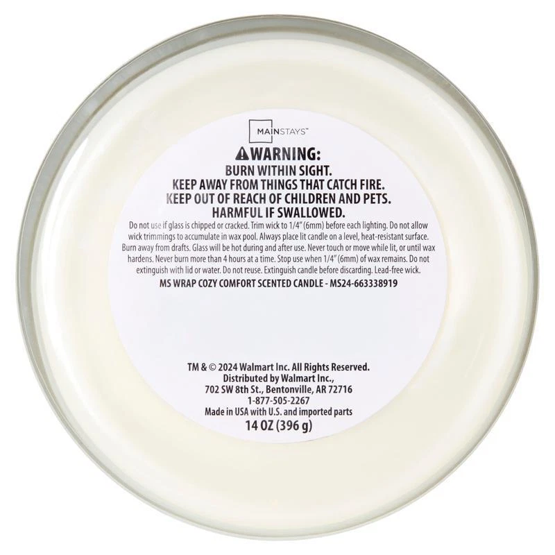 Introduce a soothing aroma into your living space with the Mainstays 3-Wick Textured Wrapped Cozy Comfort Scented Candle. Mainstays scented candles are highly fragranced and provide a clean and even burn that will fill your home with beautiful and enticing seasonal aromas. Place this candle in the kitchen, living room or dining room where you can enjoy it when entertaining guests or anytime you want to relax. Trim the wick periodically to promote even burning. Mainstays offers a wide selection of candle scents to explore and enjoy. Shop all of our Mainstays scents online and in-store. Treat yourself to the enticing scent of the Mainstays 3-Wick Textured Wrapped Cozy Comfort Scented Candle. Mainstays 3-Wick Textured Wrapped Cozy Comfort Scented Candle, 14 oz Consistent and smooth burn 3-wick with decorative wrap and attractive metal lid Highly fragranced candle Vanilla, jasmine, and musk scent notes Follow these tips for the perfect burn: Always trim wick to ¼ inch before lighting and keep debris out of wax pool Do not burn more than 3 hours at one use, and allow wax to harden before relighting, touching or moving. Set candle on a heat-resistant surface and keep out of drafts. Always burn within sight and extinguish before leaving room. Do not burn near things that can catch fire, and keep away from children and pets. Do not extinguish with water. No assembly required Perfect for any room in your home Recyclable vessel Great for gift giving or keep for yourself