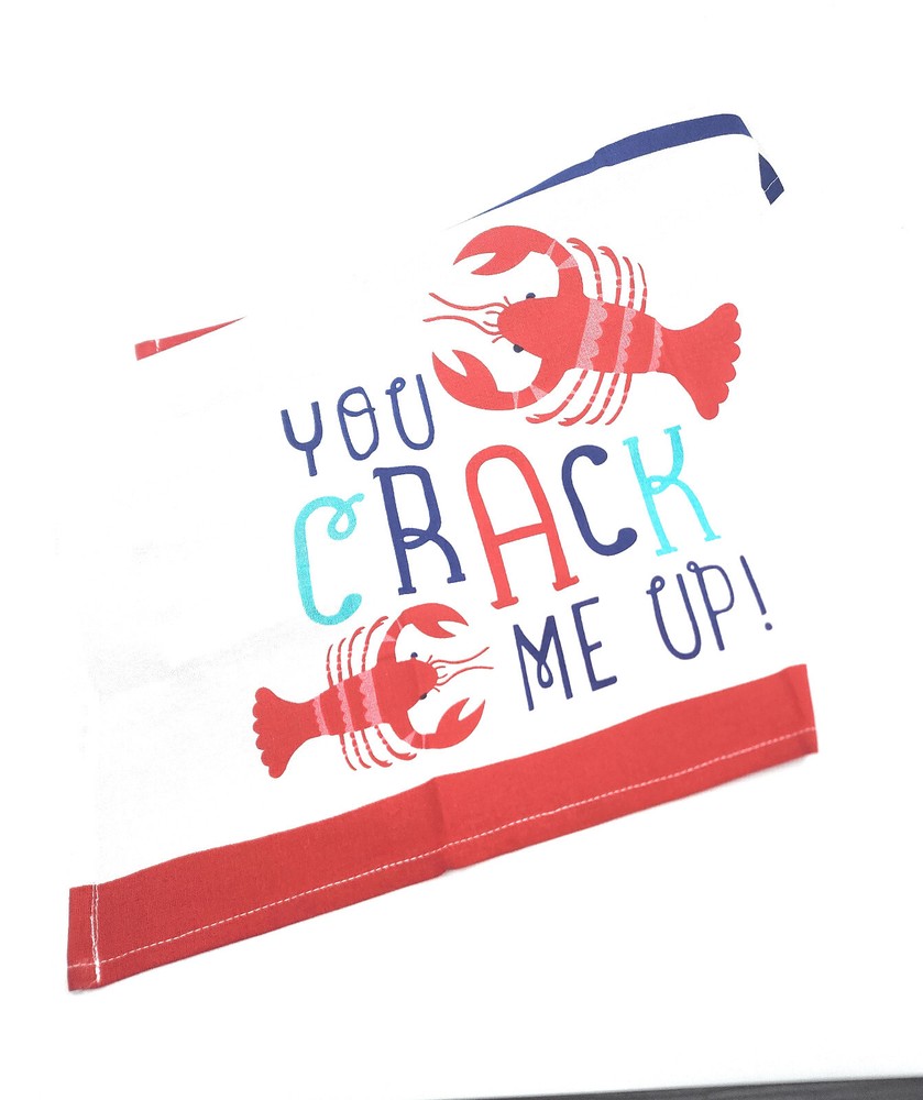 100% Cotton Kitchen Towels Printed with Funny Sayings (Lobster - You Crack Me Up) This is a 100% Cotton Kitchen Towel or Tea Towel, made in India Size: 16" x 28" It is decorated in Red White and Blue, with photos of lobsters, and the saying "You Crack Me UP". Cute for a summer barbecue or Lobster Boil! Care instructions: Machine wash on cold. This is a nice Hostess gift, or buy it to add a cute touch to your own kitchen that reflects the summertime spirit.