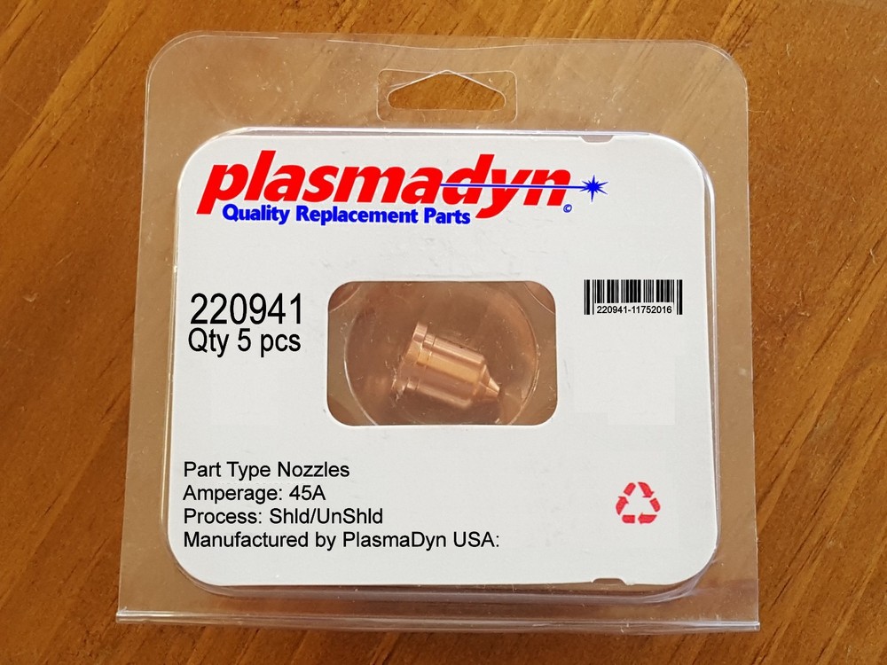 PlasmaDyn © Plasma Cutter Replacement Parts Experts in Plasma Cutting Parts, Service & Repair for over 10 Years Manufactured by PlasmaDyn USA - Genuine PlasmaDyn Includes: 10 x 220941 - 45A Cutting Nozzles - Mfg by PlasmaDyn ® - skip the EL-CHEAPO knock off JUNK - used with the following: Matching Electrodes Available HERE - Mfg by American Torch Tip ® 220930 Fine Cut Nozzles Available HERE 120931 Fine Cut Shield Available HERE 220941 45A Nozzles Available HERE 220819 65A Nozzles Available HERE 220816 85A Nozzles Available HERE Also used with 220854 Retaining Caps Available HERE and 120979 Shields Available HERE (same as 220955) and 220992 Shields Available HERE and 220817 Shields Available HERE skip the EL-CHEAPO knock off JUNK - PlasmaDyn Parts - Better Quality - Better Service We are a FULL LINE Distributor of Plasma Cutter Parts