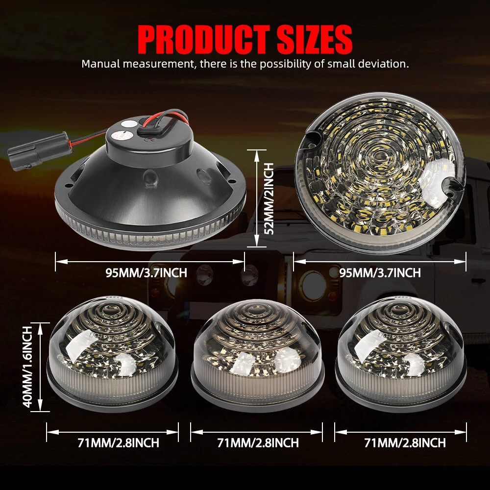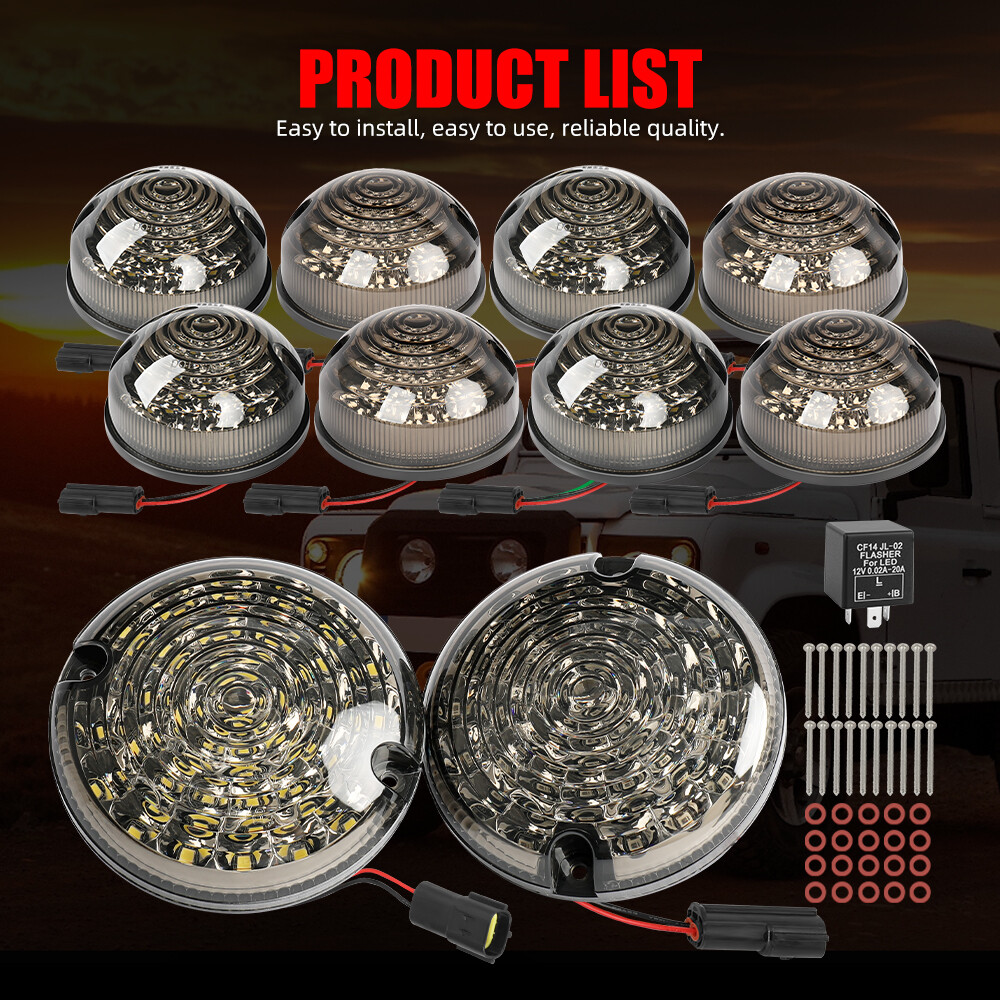 Features: 1.Smoked Lens 2.73MM diameter 3.Long life and low power consumption. 4.All Our Lighting Upgrades Come With One Year Manufactures Warranty 5.It is upgrade LED kits, not genuine OEM Kits. 6.Our items come with an Adjustable LED Flasher unit Specification: Lens Color: Smoked PMMA Lens Lights Color: Amber for front; Red for rear stop/ tail lights; White for side marker lights Diameter: 73MM Waterproof: IP67 Certification: E-mark (E4)/E approved/E sign/E documents 10pcs Complete LED Light Upgrade Kit Lamp For Land Rover Defender 1990-2016 2015 Features: Factory bolt-on OE fitment, professional installation recommended. Enhance visibility during night time, heavy rain, snow, or dense fog. Precision optics offers a highly controlled concentration of light to enhance visibility. Polycarbonate Lens with a superior UV protection and a high impact resistance. Heavy duty housing prevents moisture and dust from getting inside the housing. High quality OE grade materials to withstand the most rigorous weather conditions. Features: 1.Smoked Lens 2.73MM diameter 3.Long life and low power consumption. 4.All Our Lighting Upgrades Come With One Year Manufactures Warranty 5.It is upgrade LED kits, not genuine OEM Kits. 6.Our items come with an Adjustable LED Flasher unit Specification: Lens Color: Smoked PMMA Lens Lights Color: Amber for front; Red for rear stop/ tail lights; White for side marker lights Diameter: 73MM Waterproof: IP67 Certification: E-mark (E4)/E approved/E sign/E documents Package Include: 4x Standard size amber front indicator lights (73mm) 2x Standard size RED Rear stop/tail lights (73mm) 2x Standard size White Front side lights (73mm) 1x Adjustable LED Flasher unit 1X Large Reverse Light 1X Large Rear Fog Light 20X Screws + 20X Screws gaskets Note: If your installation need a plinth for mounting, you need to order individually, DOES NOT include in the kit. Suitable for all Land Rover Defenders-Pre 1994 models may require wiring modifications. Plug and Play for 90/110 1983-1990 and Defender 1990-2016. In order to ensure the item fit your vehicle properly, please check our fitting tab, pictures and your vehicle stock OEM part number information carefully and note model name and year on your order. Payment Delivery details Return and Warranty About us Contact us Payment We can only accept Paypal Payment Delivery details 1. We will ship within 1 Working Days after your clearly payment 2.Expected delivery time is 2-8 working days 3.Default ship method is Fedex Return and Warranty 1.We accept 30Days free Return 2. 5Years Warranty for all Items About us 1.Our goal is to make your choice easier and save your money. We serve customers world-wide by offering quality goods at unbeatable prices, all while maintaining a focus on superior customer service. 2.PLEASE FEEL FREE TO ASK ANY QUESTIONS YOU MAY HAVE VIA EBAY MESSAGING SYSTEM. All questions will be answered promptly (usually in less than 24 hours except weekends and holidays) Contact us 1.We will leave the positive feedback for you after your paying and hope you will do the same to us. 2.Please feel free to contact us before leaving any negative feedback and give us an opportunity to solve the problem. Leaving negative feedback doesn’t help you solve any problem. We will answer you as soon as possible and help you solve your problem. 3.Please do not open a return or case before contact us ,because it will have a bad effect on our seller performance,thanks for attention! On Apr 6, 2025 at 17:01:44 PDT, seller added the following information: