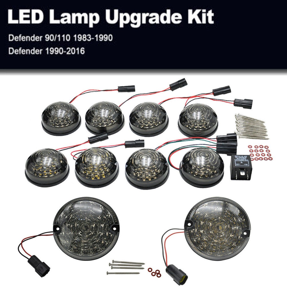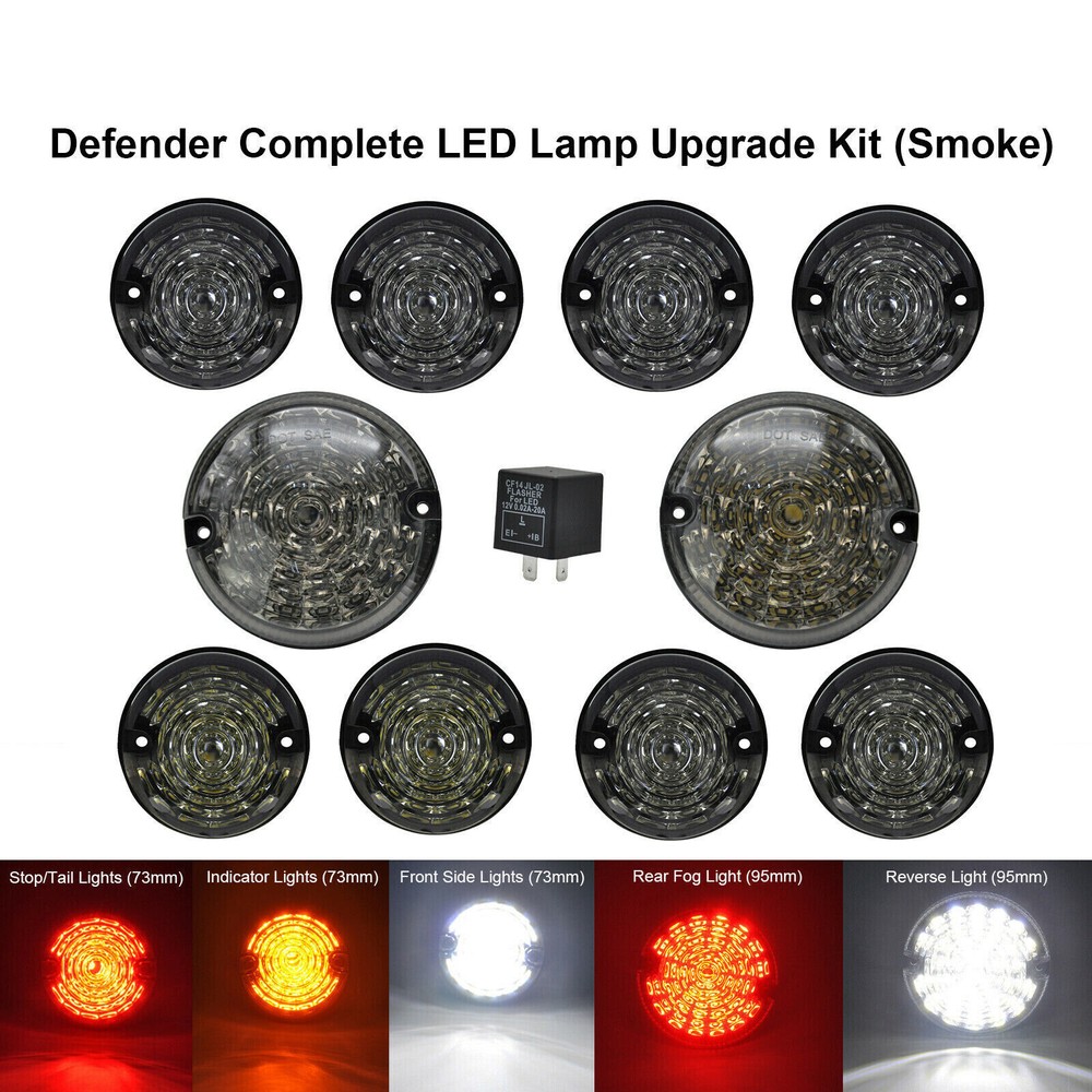 LAND ROVER DEFENDER 90 / 110 / 130 COMPLETE LED UPGRADE LAMP KIT 73MM & 95MM ALL SMOKED BRAND NEW QUALITY REPLACEMENT LED LAMP KIT PART High quality 73mm & 95mm LED style light lamps set Contents: Smoked 73mm front sidelight x 2 Smoked 73mm front indicator x 2 Smoked 73mm rear indicator x 2 Smoked 73mm stop/tail x 2 Smoked 95mm reverse light x 1 Smoked 95mm fog light x 1 12v LED flasher unit x 1 Features: - Multi-voltage 9 - 33V - 73mm & 95mm diameter - Waterproof - E Marked and SAE Approved - road legal in Europe & America - AMP type connectors fitted - plug & play, fit & forget - Comes complete with stainless steel screws