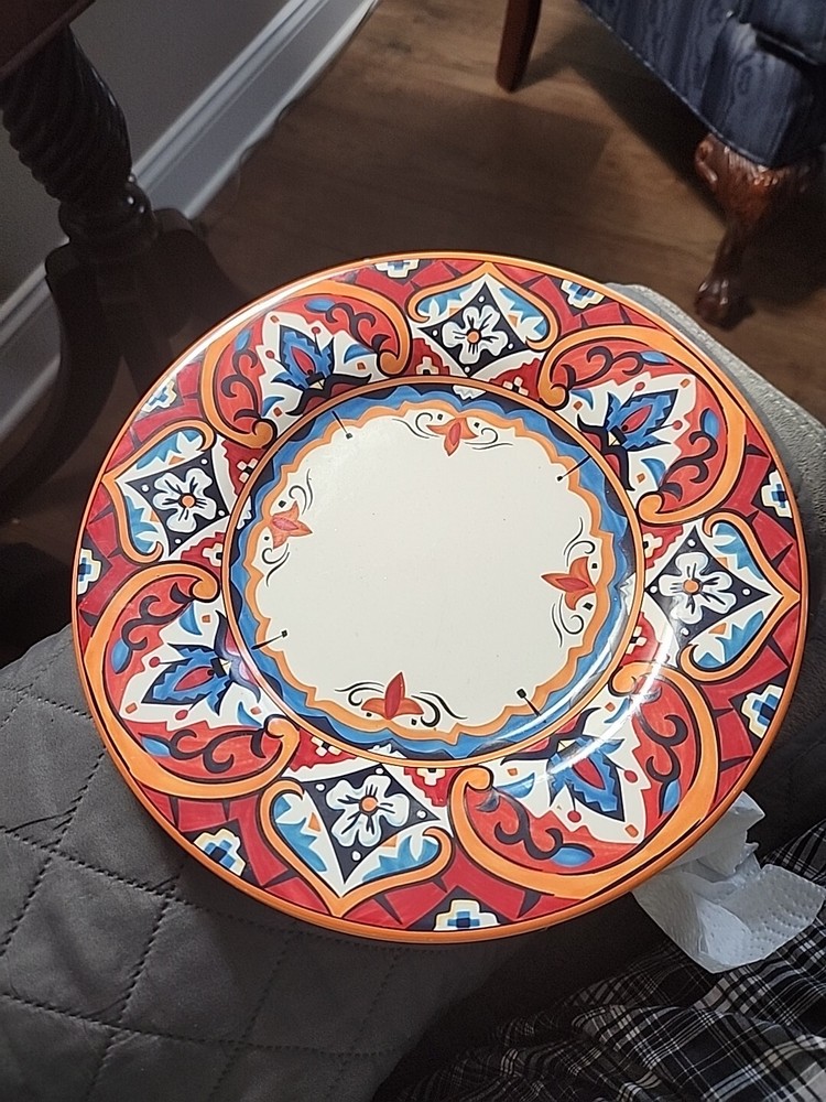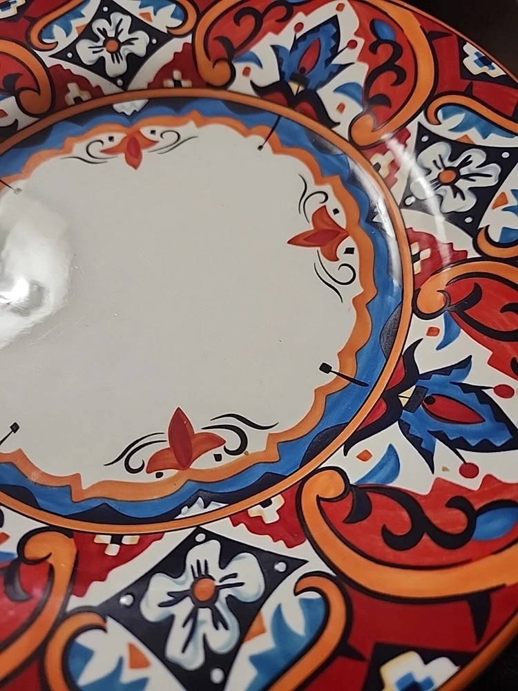 This beautiful 11" dinner plate from Pier 1 is a must-have addition to your table setting. The Karina Tile pattern, with its vibrant multicolor design, is sure to impress your guests. The round shape and glossy finish of the ceramic material make it a perfect choice for contemporary style dining. The plate is an original piece and has a printed backstamp. It is not vintage but has a unique design that will make your dining experience stand out. The set includes one dinner plate and it is perfect for any occasion. Add this Pier 1 Imports Karina Tile dinner plate to your collection today!