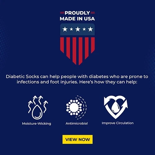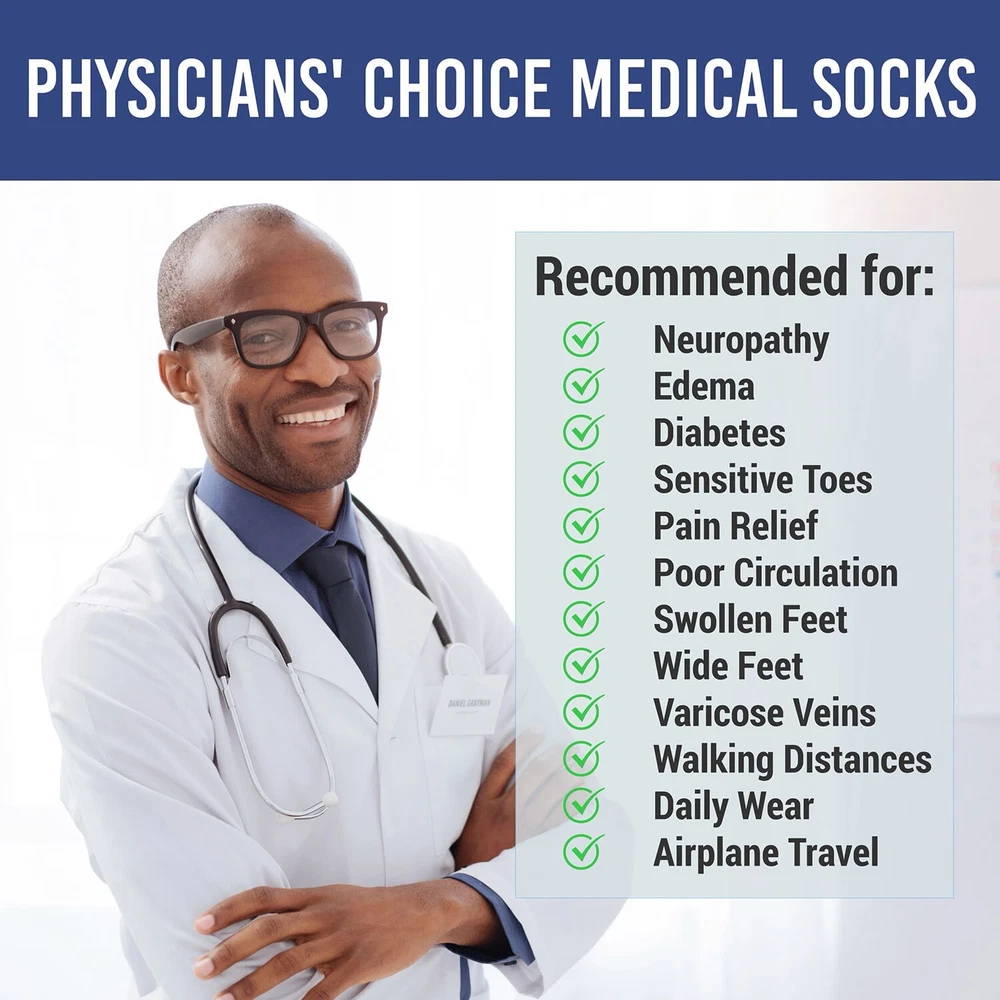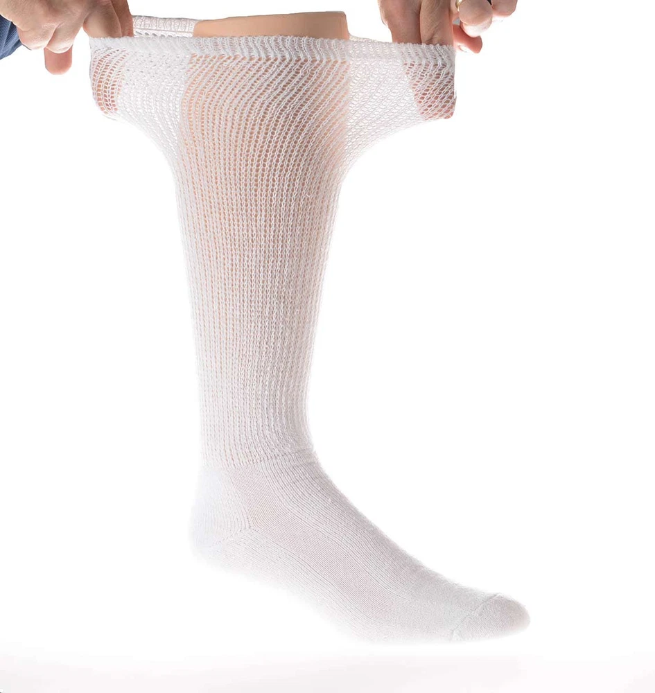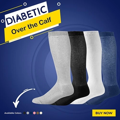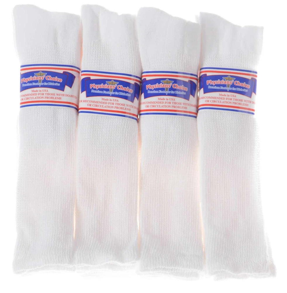 Physician’s Choice over the calf socks from doctors are ideal for diabetics and individuals searching for a cozy sock that will not restrict their blood flow. The poly-cotton mid-weight blend fabric keeps your feet warm and the loose-fit top enables maximum circulation while compression socks can make your feet cold due to the absence of blood circulation. These are high-quality men's and women's diabetic over the calf socks. The unique sock design is specifically tailored to be non-restrictive and promotes blood circulation, which makes for the perfect diabetic over the calf socks, edema socks, and neuropathy socks. Made in the USA, they use a breathable blend of cotton and polyester, which provides the perfect elasticity to give support but retains circulation. Benefits of Diabetic over the calf Socks: Diabetic over the calf socks can help people with diabetes who are prone to infections and foot injuries. Here's how they can help: 1- Moisture-wicking materials keep feet dry so that excess moisture doesn't form a breeding ground for fungal infections. 2- Antimicrobial features prevent bacterial and fungal growth. 3- Increases comfort and decreases swelling. 4- Keeping feet warm to improve circulation. 5- Practically Seamless socks reduce the risk of rubbing and blisters, which may ultimately lead to a foot ulcer in someone who has neuropathy or chronic hyperglycemia (high blood sugar). 6- Extra padding for sensitive areas, such as the soles of the feet, can help prevent foot injury. 7- White-soled socks can alert those with diabetes if they have a wound that is draining. Structure: These are mid-weight and loose-at-the-top structured socks with a terry-knit lining provides ultimate all-day comfort. These socks have a perfect balance of structure and stretch, made with 80% Cotton, 15% Polyester/Nylon and 5% Spandex to ensure softness and elasticity. Ultra-comfortable therapeutic knit-in vents manage moisture to evaporate and help keep feet dry, cool and healthy. The smooth toe technology and no feel seam; keep your toes happy, even in shoes. Antimicrobial characteristics fight the toughest odors at work and the strengthened sole offers additional protection in high-impact fields so that you can work them all out. Extra-wide foot, ankle, and leg for non-binding comfort Soft-cushioning helps safeguard the feet and offers additional shock absorption in high impact regions of the foot, the seamless toe eliminates pressure points. Specifications: Brand: Physicians Choice Length: Over the calf Material: Cotton Material content specs: Cotton Blend Application: Diabetic over the calf, Neuropathy, and Edema Patients Sizes: 1- Medium = 9-11 Fits shoe size 4-8 2- Large = 10-13 Fits shoe size 8-12 3- X-Large = 13-15 Fits shoe size 12-16 Colors: 1- White 2- Black Region of Manufacture: The socks are manufactured in the US according to our high-quality standards. We stand behind all the products we sell and guarantee your satisfaction. NOTE: If you have concerns about your health, seek help from a medical professional. Medical recommendation: Diabetic over the calf socks are specially designed socks that keep the feet dry, decrease the risk of a foot injury, and avoid preventing or slowing blood circulation. The socks are the perfect choice for people of all ages that are subject to medical conditions including Neuropathy, edema, and diabetic over the calves. The socks reduce edema by promoting better blood flow in your legs.