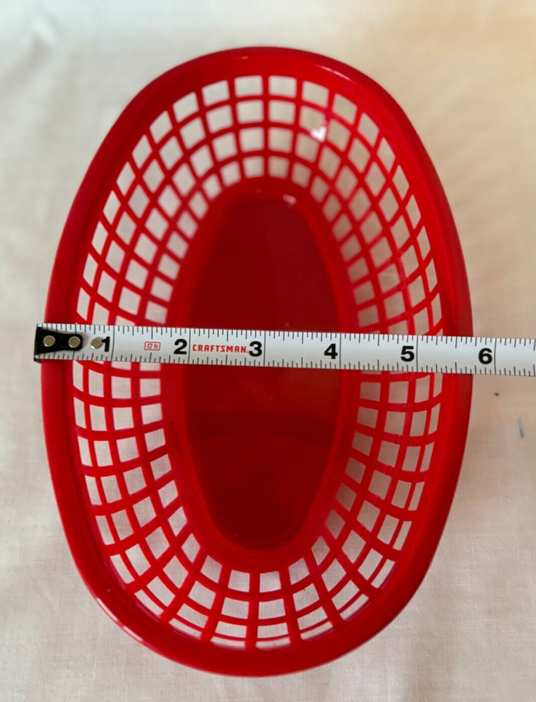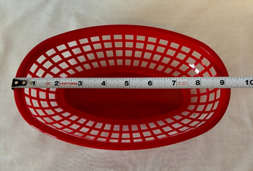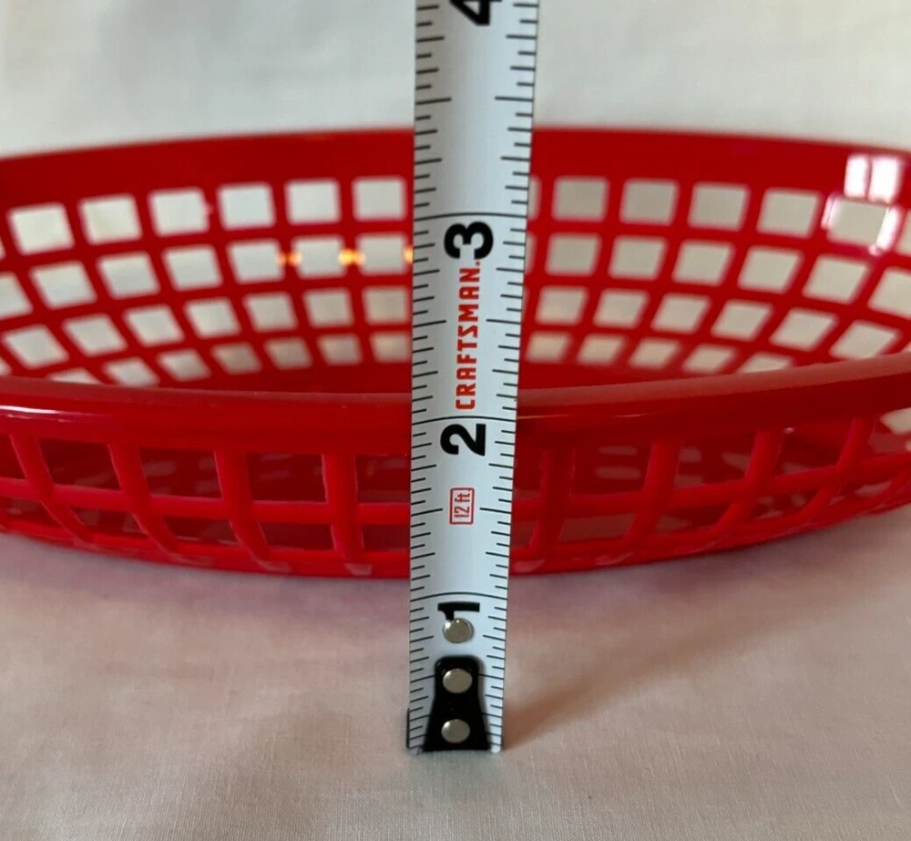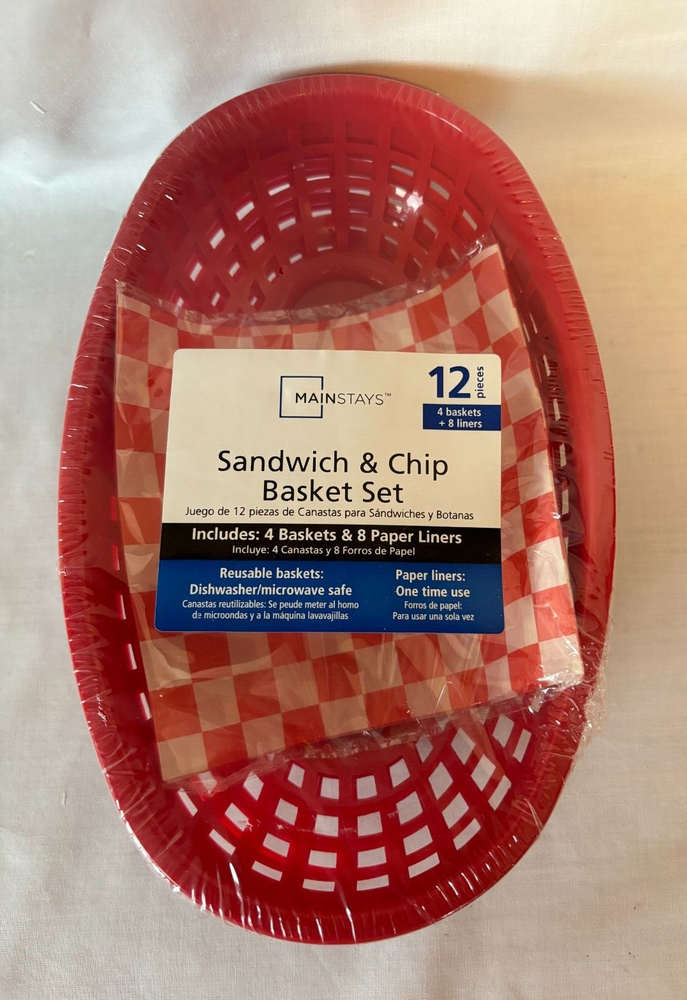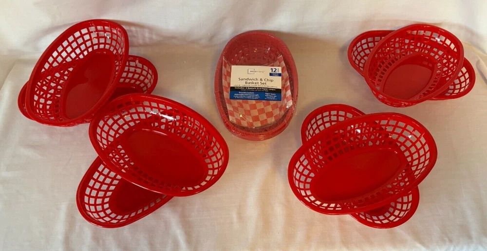 Twelve baskets for serving casual party food. Excellent condition. See photos for item details and measurements. These deli style baskets are great for sandwiches, chips, burgers, fries, hot dogs, snacks, picnic food. Four baskets are in unopened original packaging including paper liners. Label indicates Polypropylene material content and distribution from Wal-Mart. The other eight baskets are bright red shiny/glossy and show no signs of wear or use. Ships U.S. Mail, Ground Advantage. U.S. Only