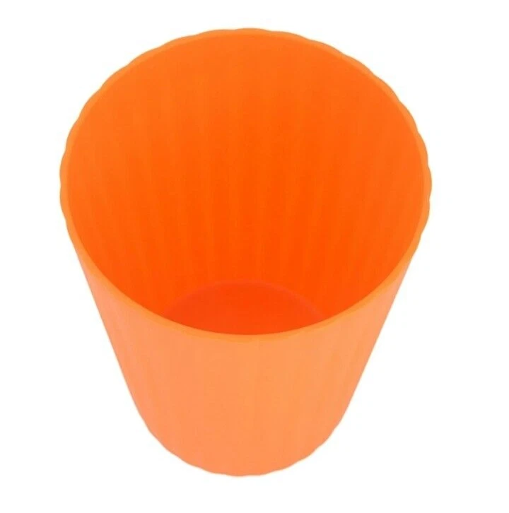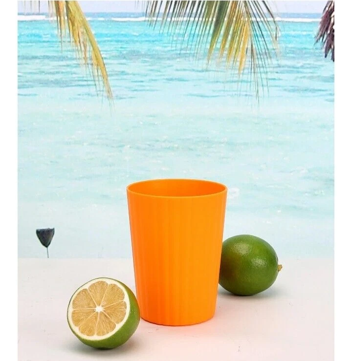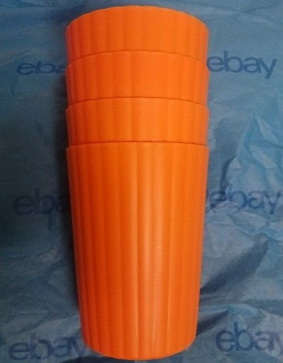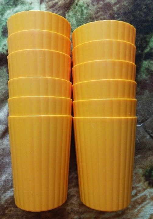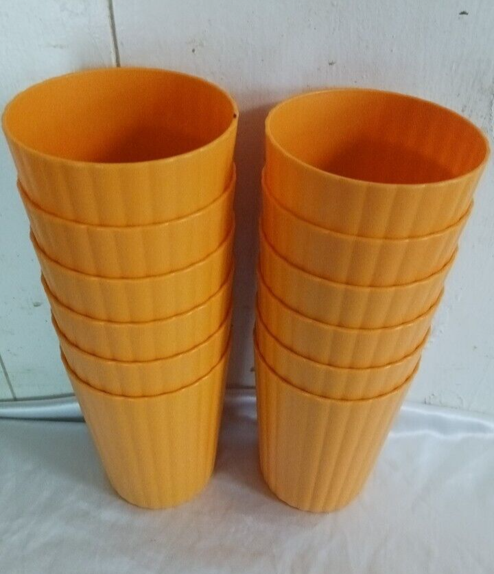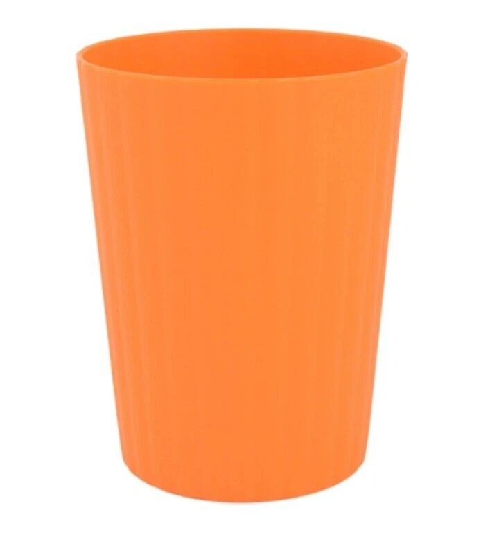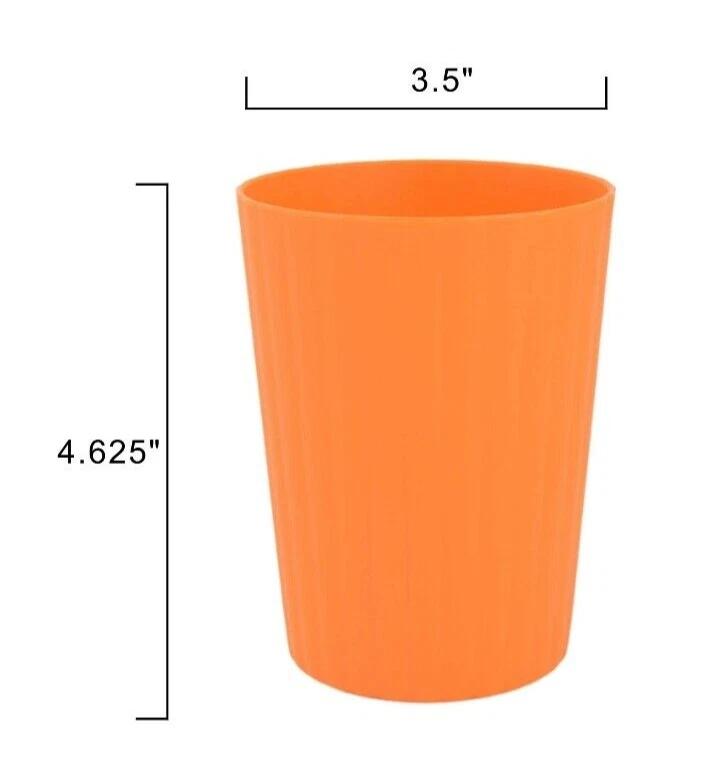 Mainstays Plastic ribbed Tumblers Set Of 12 )orange NEW! • Material content: Polypropylene Plastic • Featuring a smooth matte finish • BPA Free • Durable and suitable for everyday use • Perfect for entertaining • Suitable for Indoor or Outdoor use • Microwave and Dishwasher safe • (12) Tumblers 18 oz (3.50” Diameter by 4.75” Height) • Color: orange