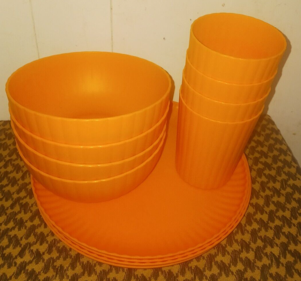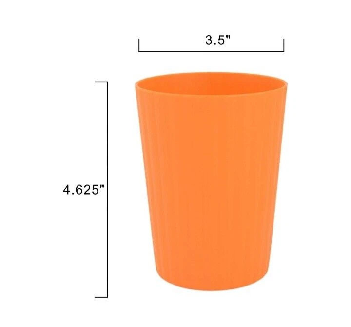 Mainstays Plastic ribbed Dinner Plates, Bowls & Tumblers Set Of 12, (4 Of Each) green NEW! • Material content: Polypropylene Plastic • Featuring a smooth matte finish • BPA Free • Durable and suitable for everyday use • Perfect for entertaining • Suitable for Indoor or Outdoor use • Microwave and Dishwasher safe • (4) Round Dinner Plates (10.5” Diameter) • (4) 38 oz Soup/Salad/Cereal Bowls (6.50” Diameter x 2.50” Height) • (4) Tumblers 18 oz (3.50” Diameter by 4.75” Height) • Color: orange
