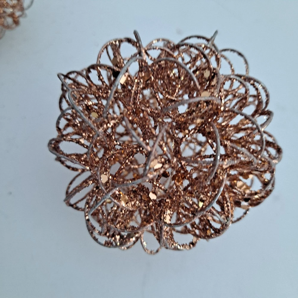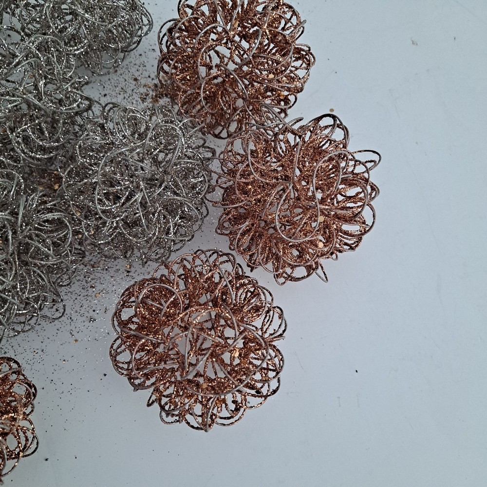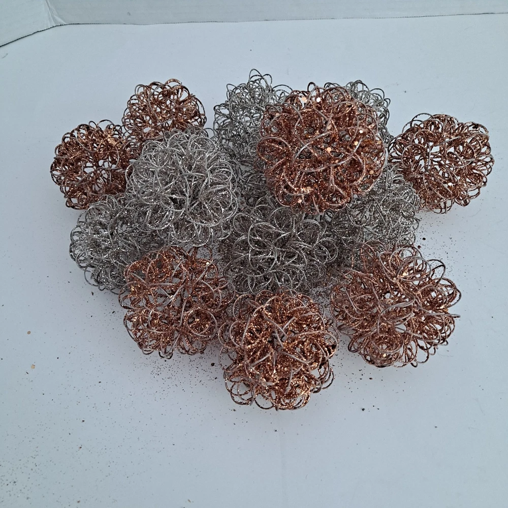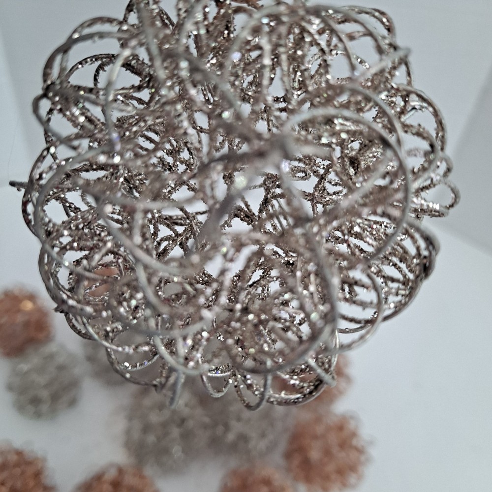 The Pier 1 Bronze/Silver Wire Glitter Home Decor Orbs/Ornaments are decorative items measuring 4 inches in length. Made of wire in a bronze gold and silver color, they are perfect for any room in your home. These orbs are from the Pier 1 brand and do not require any additional parts for display. With a stylish and elegant design, they add a touch of sparkle to your decor, making them ideal for multipurpose use. Pre-owned pieces that are in good condition with some glitter missing. Thank you for looking! S/H is $6.95