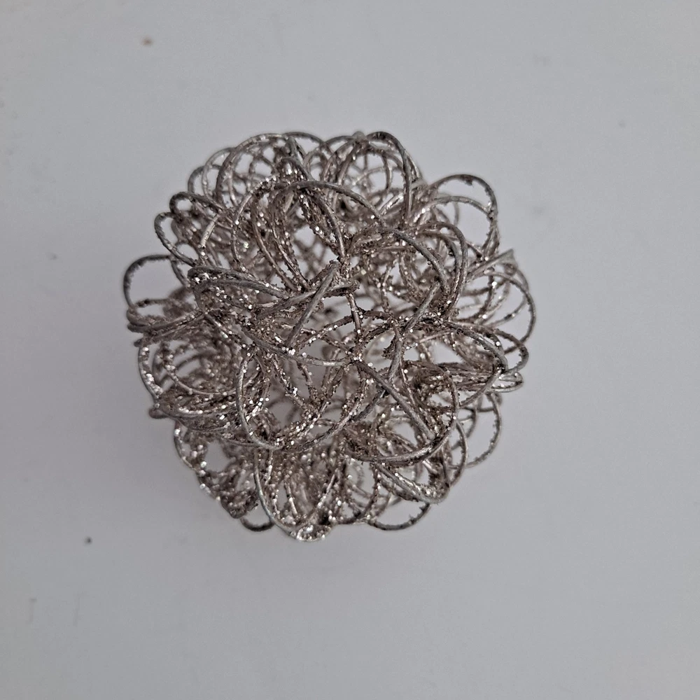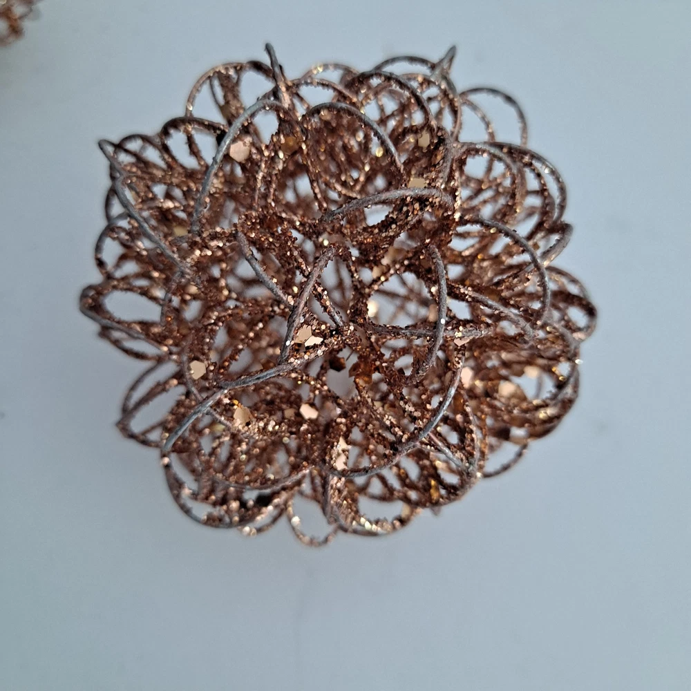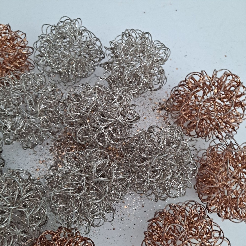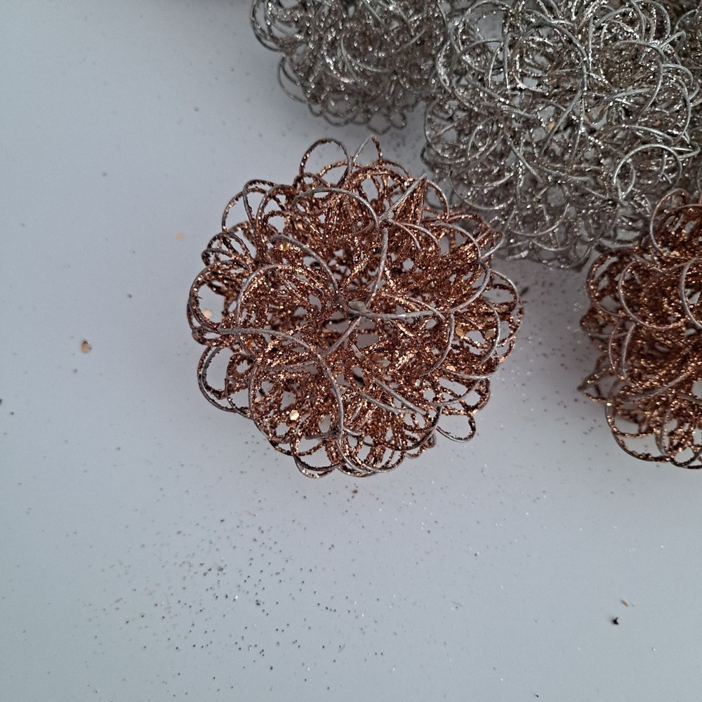 The Pier 1 Bronze/Silver Wire Glitter Home Decor Orbs/Ornaments are decorative items measuring 4 inches in length. Made of wire in a bronze gold and silver color, they are perfect for any room in your home. These orbs are from the Pier 1 brand and do not require any additional parts for display. With a stylish and elegant design, they add a touch of sparkle to your decor, making them ideal for multipurpose use. Pre-owned pieces that are in good condition with some glitter missing. Thank you for looking! S/H is $6.95