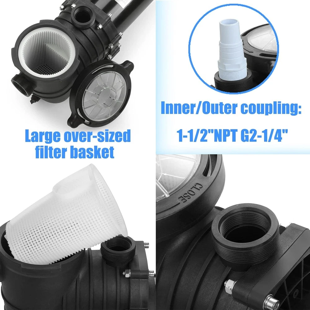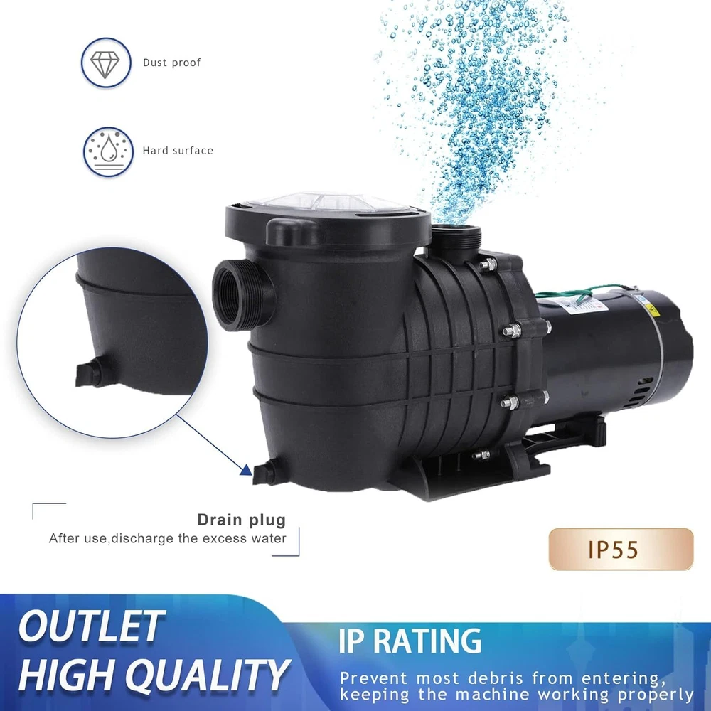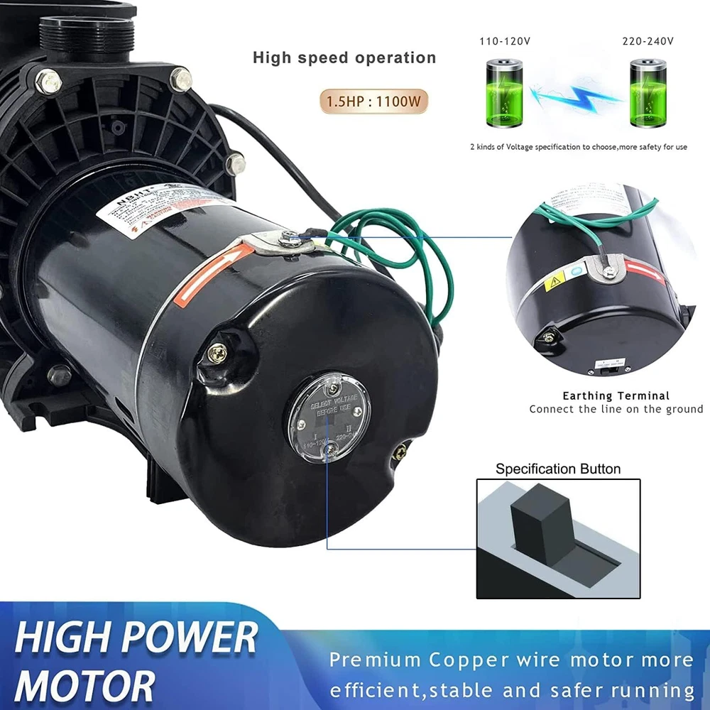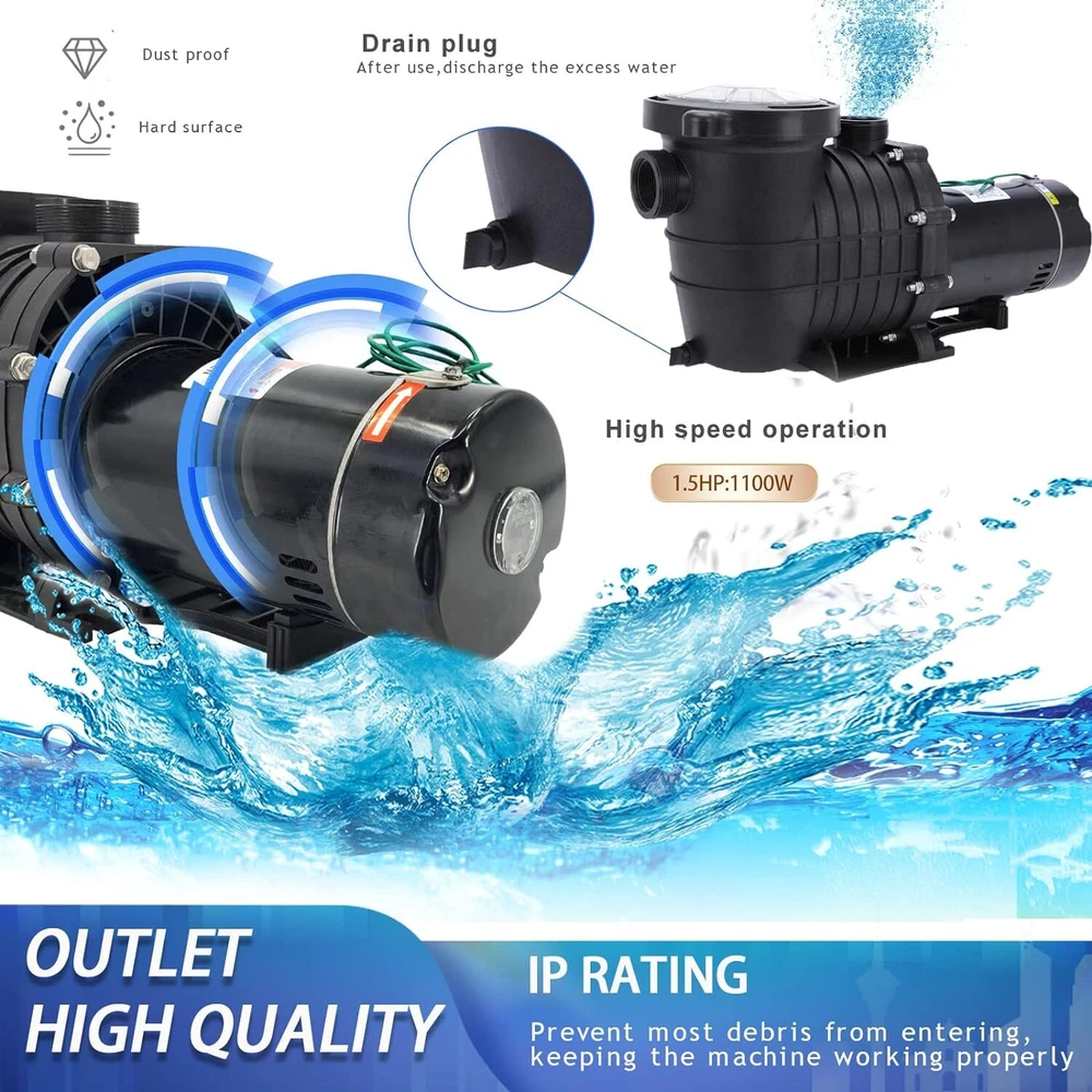Always pay attention before use!!! 1.Before use, please adjust to the corresponding voltage for home use, and then fill the water pump with water before using it, otherwise the motor will be damaged. 2.When adjusting the voltage, be sure to adjust after turning off the power. Otherwise the motor will be damaged. Product description: This swimming pool pump is made with heavy-duty, corrosion-proof construction. The stainless steel motor shaft is constructed with a reinforced thermoplastic body for longer life and durability. Advanced engineering provides high efficiency and minimal noise. This wonderful swimming pool pump will surely keep your above ground and inground pools clean. Please connect only to a grounding type receptacle protected by a ground-fault circuit-interrupter (GFCI). To reduce the risk of electric shock, install at least 10 feet from the inside walls of a pool. Do not use an extension cord. This pump is for use with permanently installed pools only-Do not use with storable pools. Features: Durable Corrosion -Stainless Steel 1.5 HP Shaft, the shaft is constructed with a reinforced thermoplastic body for longer life and durability.The sand filter is made of PPGF30 + PC, 100% drip proof, effective insulation and protection against pool chemicals, heat-resistant double-sized seal for long motor life. POOL PUMP -This self-priming heavy-duty pump delivers outstanding performance and reliability at a fantastic price and costs less than big name brands. The mighty force of this pump makes it efficient and an economical choice. Convenient - Large over-sized filter basket for less frequent maintanence and emptying of debris.It provides the efficient and easy usage, simple installation and operating system that will keep pool water crystal clear and sparkling. UL Certified - This Swimming Pool Pump has a UL Certification to ensure recognized Standards for Safety. Specifications: Style: Modern Type: Swimming Pool Pump Color: Black Motor Shaft Material: Stainless Steel Pump Housing Material: PPGF30 + PC (anti-Oxident) Rated Power: 1100W/1.5HP Voltage:110-120V/220-240V 60Hz Max Flowrate: 410L/min UL Approval: Yes Inner/Outer coupling: 1-1/2''NPT G2-1/4'' Package Content: 1 x Water Pump 2 x 1-1 / 2''NPT Inner coupling 2 x 48.5mm Inner coupling 1 x Manual