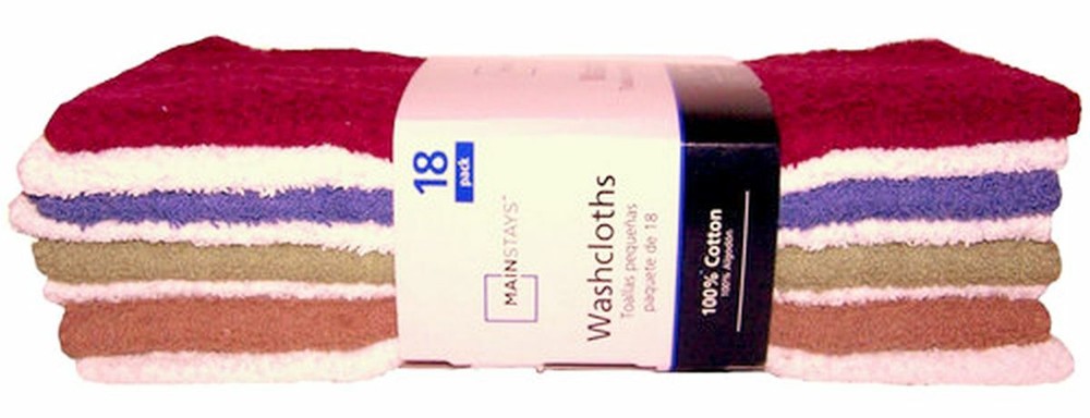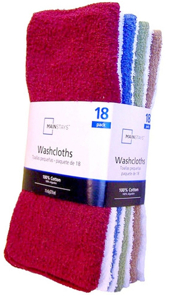 FOR SALE IS ONE (1) NEW PACKAGE OF 18 100% COTTON WASHCLOTHS FROM MAINSTAYS BRAND MPN MS11-004-003-02 UPC# 021368813057 . ALWAYS SOLD FACTORY FRESH, 18 COUNT TOTAL WASHCLOTHS PER PACKAGE, RED, WHITE, BLUE, GREEN AND BROWN, TOTAL WEIGHT OVER ONE POUND OF PURE COTTON WASHCLOTHS. STOCK YOUR BATHROOM WITH THESE SOFT, ALL COTTON 11" x 11" TERRY RED, WHITE, BLUE, GREEN AND BROWN WASHCLOTHS. LUXURIOUS AND LONG LASTING, MACHINE WASHABLE. THIS LOT OF 18 ALL COTTON WASHCLOTHS FROM MAINSTAYS BRAND ARE SIMPLE, CLASSIC, HOTEL STYLE, SOFT ABSORBENT ALL COTTON WASHCLOTHS. SHIPPED BY USPS PRIORITY MAIL..... BID AND BUY HERE IN IN ABSOLUTE CONFIDENCE SINCE I HAVE THOUSANDS OF POSITIVE FEEDBACK AND TEN+ YEARS EBAY EXPERIENCE. I SHIP WITHIN TWO DAYS OF RECEIPT OF PAYMENT, OFTEN THE NEXT DAY. $4.11 USPS PRIORITY GREEN SHIPPING USING RECYCLED PACKAGING MATERIALS AND ENVIRONMENTALLY FRIENDLY MATERIALS TO ANYWHERE USA. I DO NOT SHIP ANYWHERE ELSE. HAVE A GREAT DAY AND THANK YOU FOR STOPPING BY......