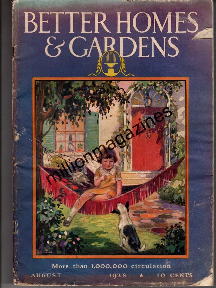Your browser does not support JavaScript. To view this page, enable JavaScript if it is disabled or upgrade your browser. Better Homes & Gardens August 1928 rare Complete issue Inside: The art of lawn making; Walt Mason in his garden; An old barn in Des Moines becomes a garden studio; Do youi point with pride to your town? What about electric refrigeration? Dress up the sleeping porch; ; Car ads. appliances, furniture and house items. Lots of features for houses of this era. If you own a house in this time period, then this is for you! Chosen Reflections/Million Magazines, Kaufman TX 75142 Over one Million Magazines in stock 1843-present. In the trade since 1976. Like, follow and communicate with us on FB