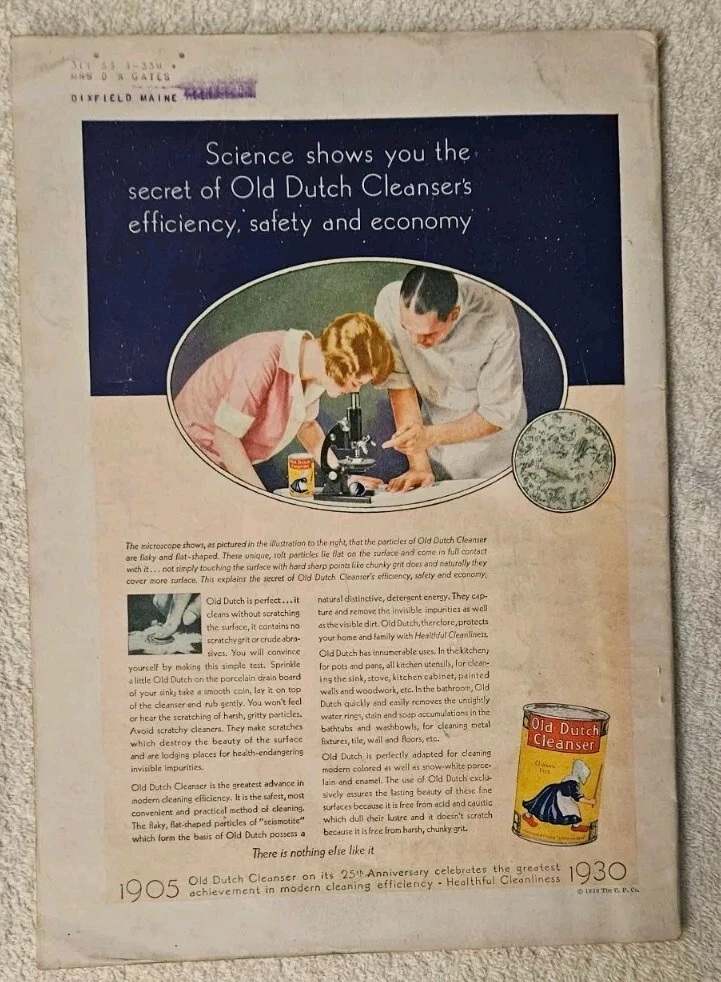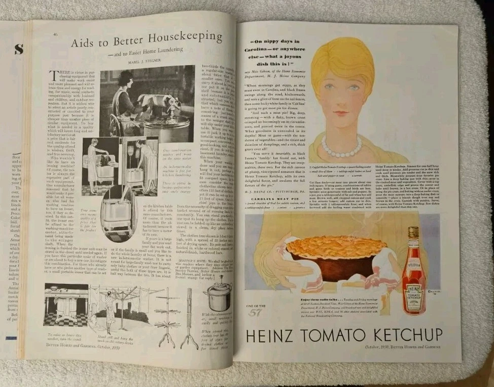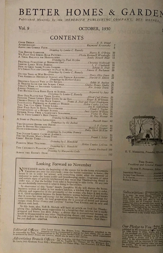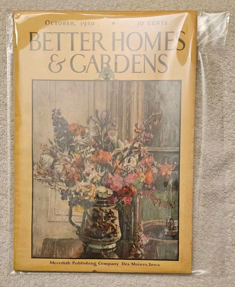 October 1930 Better Homes & Gardens Volume 9 Number 2 'Keeping House' 112 Pages NO MISSING PAGES Complete Very Good with mailing stamp on rear cover Published by Meredith Publishing Company Des Moines, Iowa Cover Flowes by E. B. Bland Poem: Afterthought by Raymond Kresensky Practical Furniture by Christine Holbrook with 4 Photos Globe Tulips Indoors by Edwin D. Hull Wee Beasties Italian Food by Edith M. Barber at Greenwich Village John Dhoe with Photo Home Heating with Photos Palo Alto California with Photos Color Ads for : Heinz Ketchup, Johns-Manville Asbestos Shingles, Swift Brookfield Butter, GE Refrigerator Monitor Top,Chipso Flakes, Old Dutch Cleanser, Congoleum Rugs, Dutch Boy White Lead Paint, Alcoa Albron Aluminum Paint, Grape Nuts, Creo-Dipt Stained Shingles. Home Laundering Machines by Mabel J. Stegner Fashions Halloween Recipes Home Designs Biography of Emily Dickinson Jackie Jack o'Lantern by Marguerite Gode The Bicycle Club Rides Back To School by Jane and Louise C. Rumely