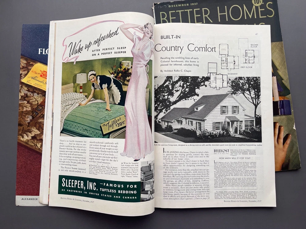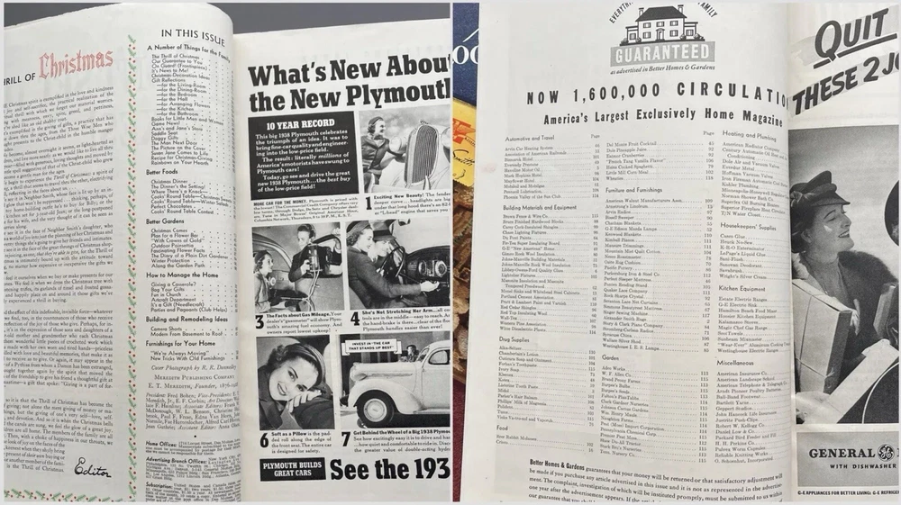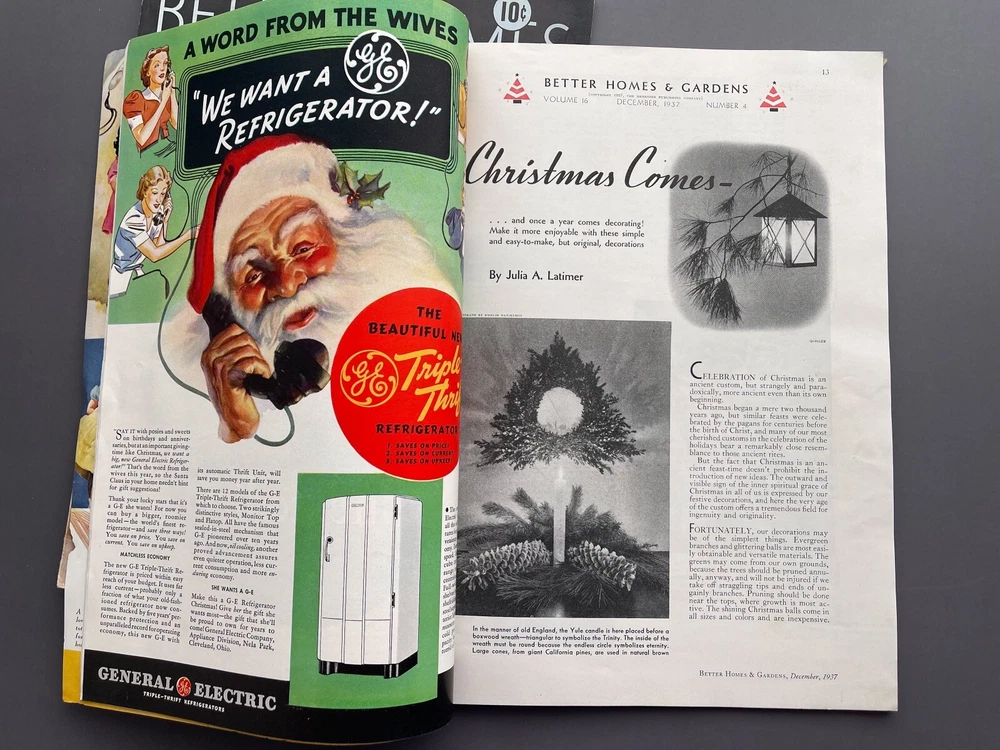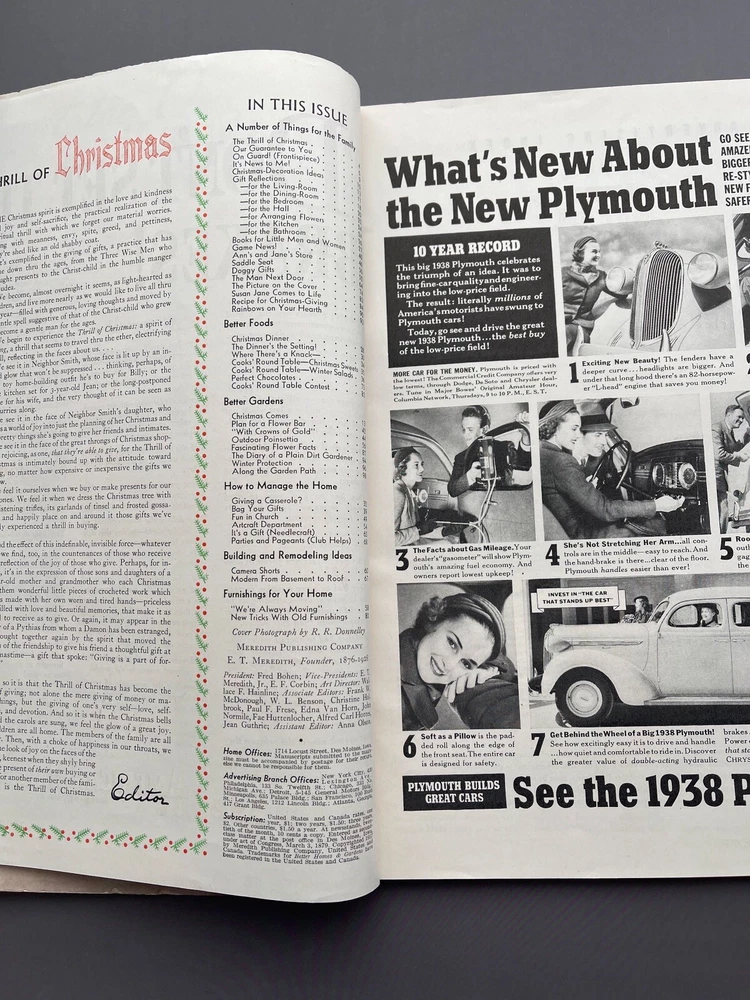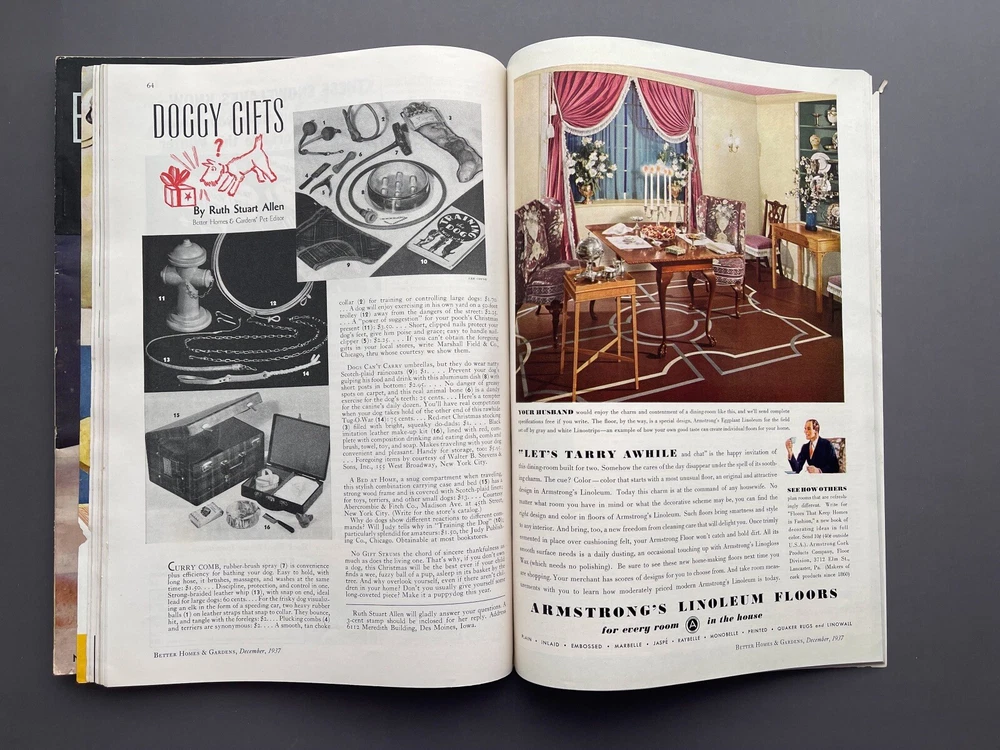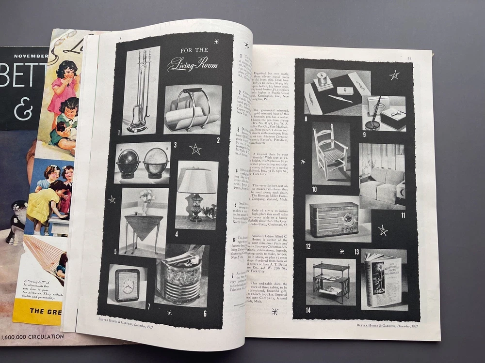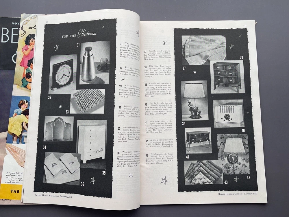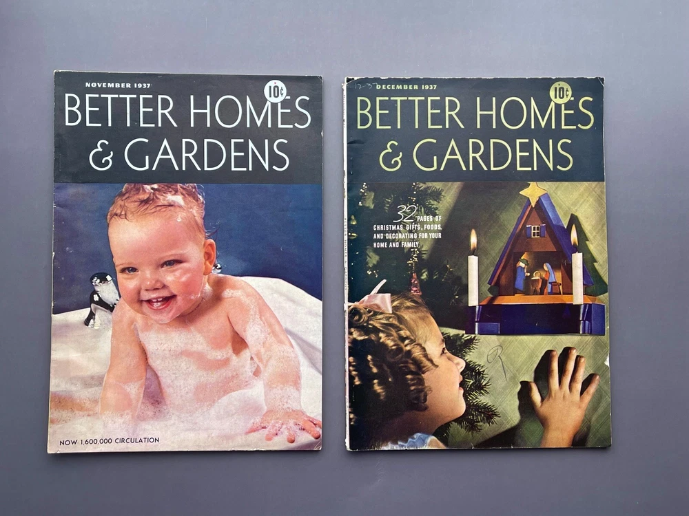 ♡ ♡ ♡ ♡ Here is a wonderful lot of two 1930s vintage Better Homes and Gardens magazines from November and December of 1937. Each magazine comes complete and filled with photos, ads, articles, and all sorts of inspiration for those interested in 1930s home decorating, furniture, interior design, gardening, cooking, and more. I've included several photos of each issue to hopefully help give you a good idea as to all the interesting info these have to offer ♡ Each magazine measures approximately 12" x 8 3/8". The December issue has 98 pages, and the November issue has 116 pages. They show little signs of vintage wear, mostly on the covers and spine, and if you put your nose right up to the pages and take a whiff, you'll notice a bit of a 'vintage' smell that to me smells like fresh printer's ink (probably from the pages being closed for so long) and also faintly of fireplace smoke (likely because these were stored in an attic). With that said, all in all they're in very good condition for their age with no loose or missing pages and no cut-outs. Please see photos for details, and if you have any questions, I’m always happy to help. They ship via USPS and will be wrapped with care and mailed within one business day ♡