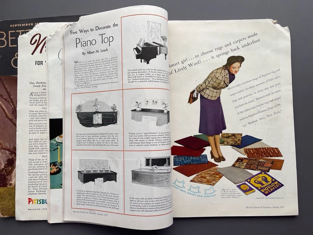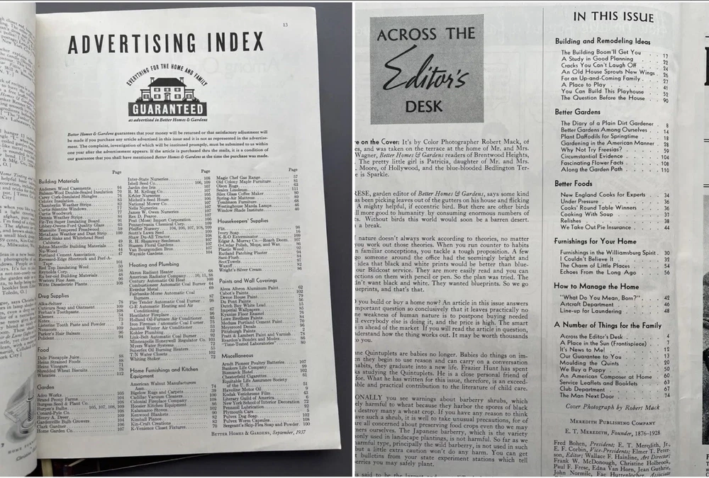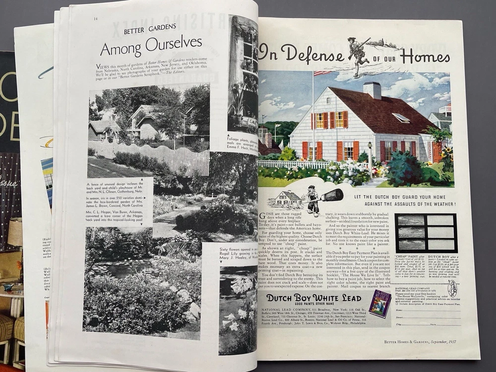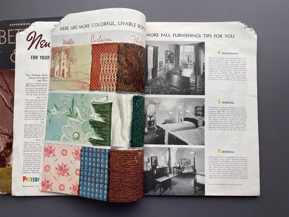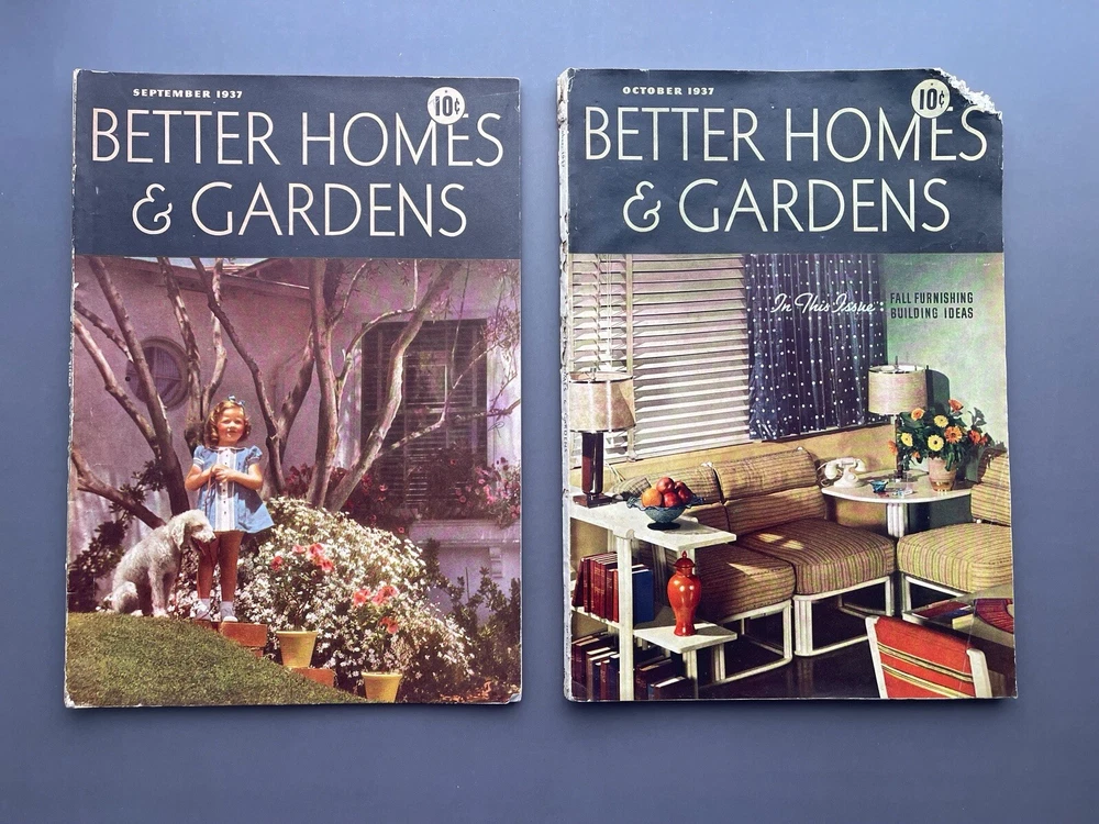 ♡ ♡ ♡ ♡ Here is a lovely lot of two 1930s vintage Better Homes and Gardens magazines for September and October 1937. Each one is filled photos, ads, articles, and all sorts of inspiration for those interested in 1930s home decorating, furniture, interior design, gardening, cooking, and more. I've included several photos for each issue to hopefully help give you a good idea as to all the interesting info these have to offer ♡ Each magazine measures approximately 12" x 8 3/8". The September issue has 110 pages, and the October issue has 166 pages. I've lowered the price because the magazines were stored in an attic where some little critter chewed off the corner of the October issue and also some of the paper covering on the spine. Other than that, the magazines are in good condition for their age with no loose or missing pages. I don't detect any bad smell or cigarette odor, but when I put my nose right up to the pages, I did get a faint whiff of fireplace smoke and printer's ink. It's pretty much imperceptible from a reading distance but worth mentioning because I only want you to be pleasantly surprised ♡ Please see photos for details, and if you have any questions, I’m always happy to help. Together, the magazines weigh a little over 1 pound, 8 ounces unpackaged. They ship via USPS and will be wrapped with care and mailed within one business day ♡