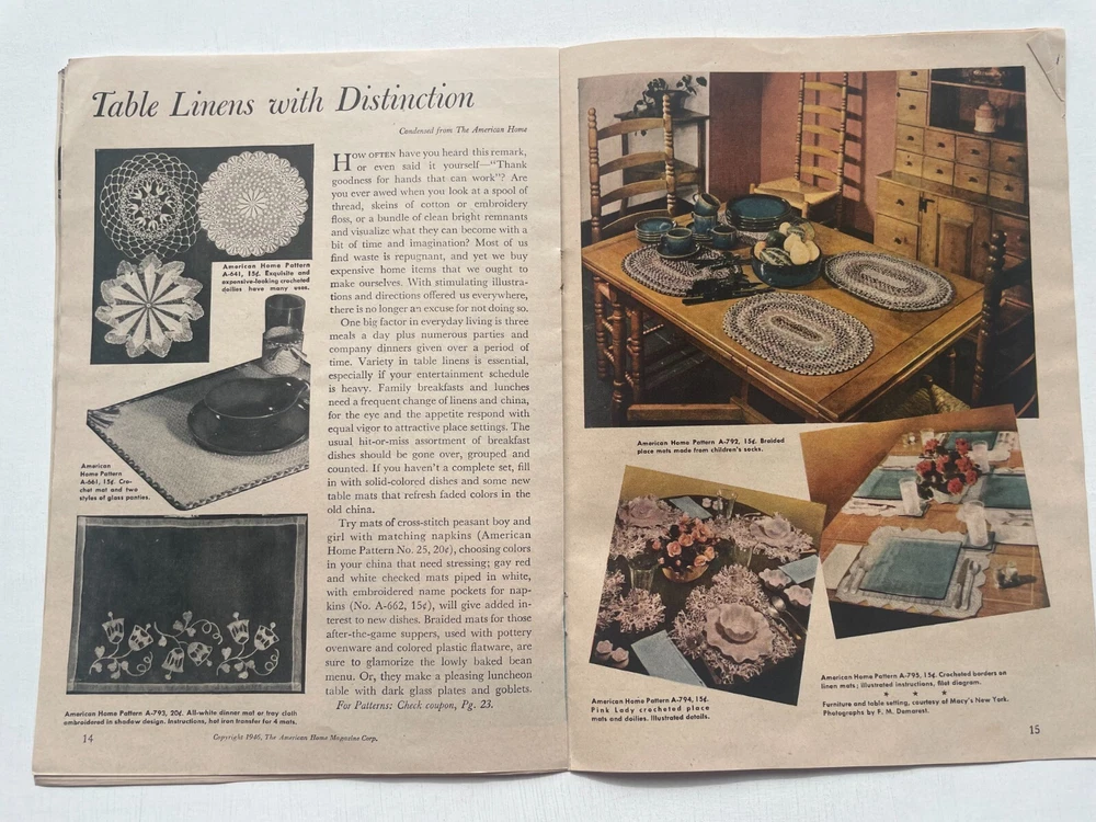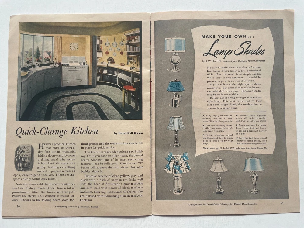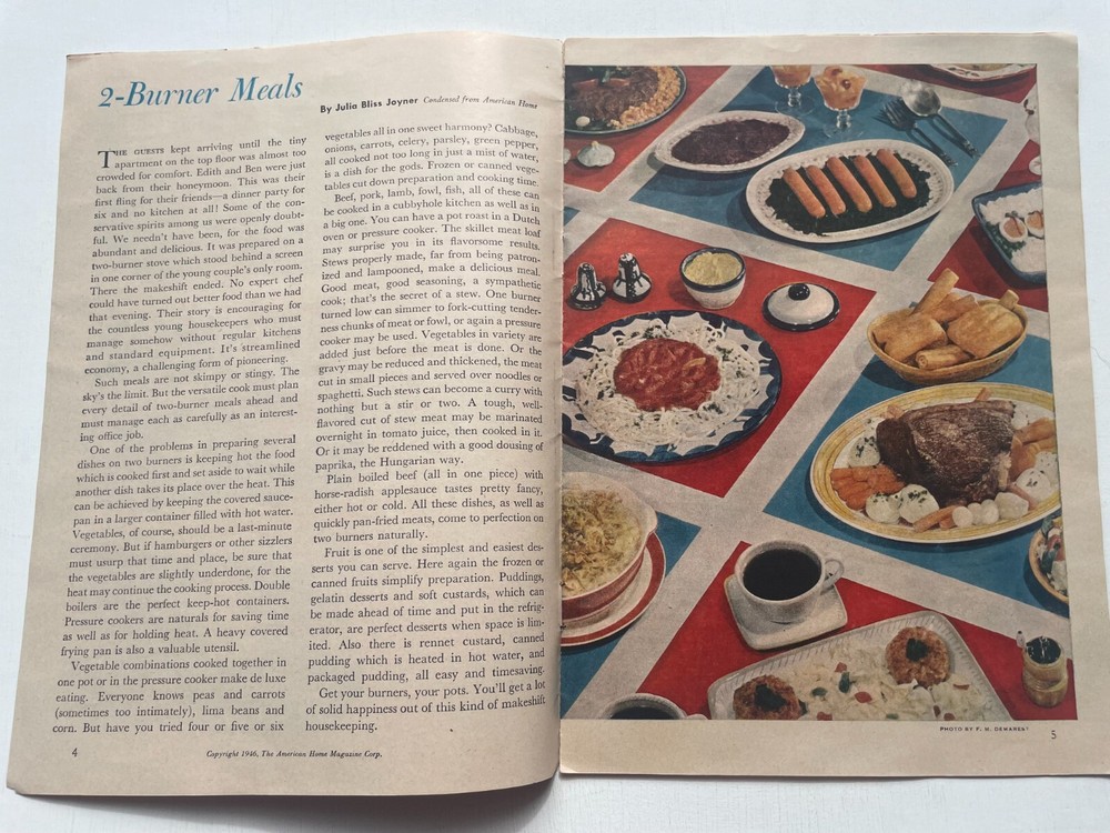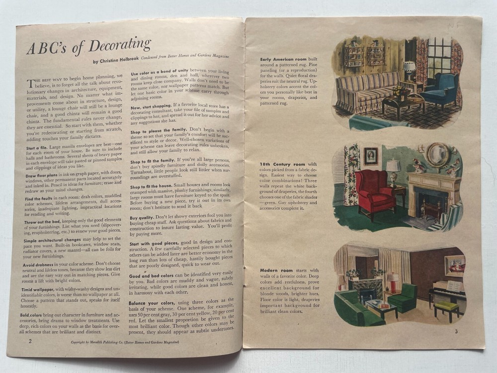 This is a booket with a 1946 copyright date. Printed by Better Homes and Garden. It is a booklet on Homemaking. Sections include.... Decorating Meals Cooking the Easy Way Frozen Food Table Linens Lamp Shades and lots more. Measures 6 x 9 inches. 23 pages. Has some great illustrations and graphics inside of 1940's style. Like what you see? Check out my eBay store Bungalowblondie Store Free shipping in the USA. Guaranteed to be an authentic "old" item. 11/2022