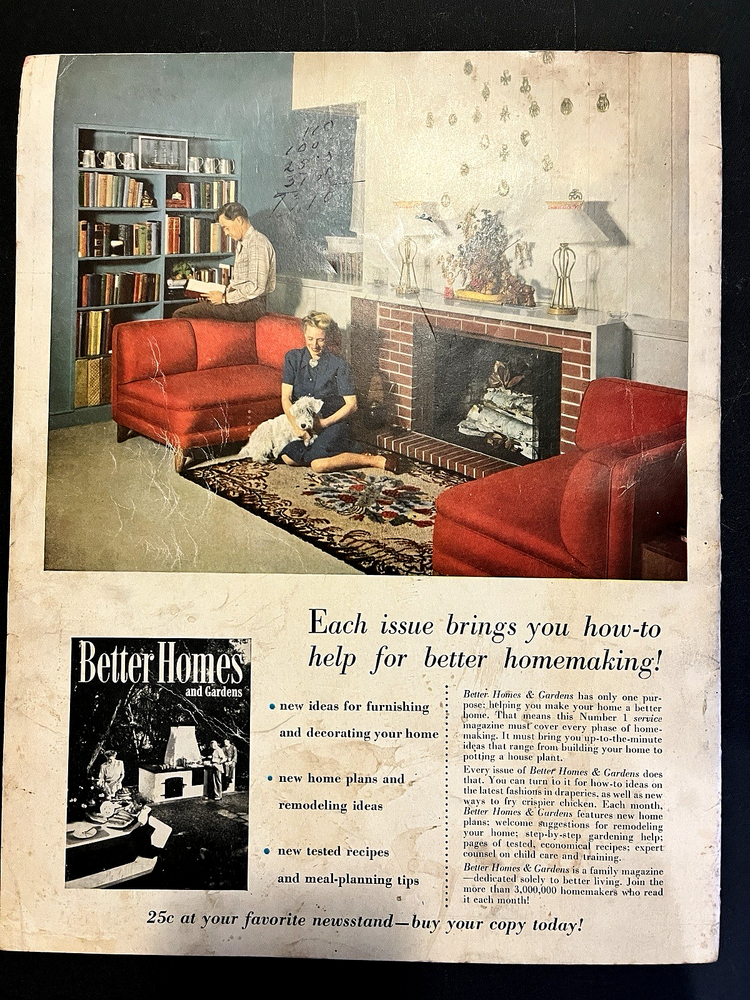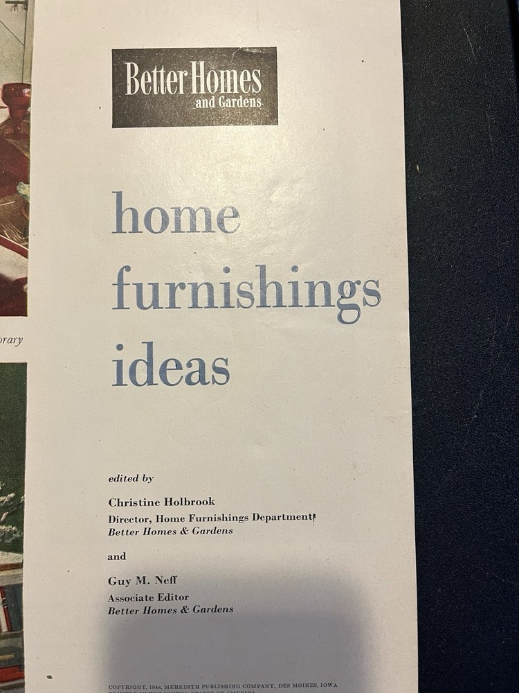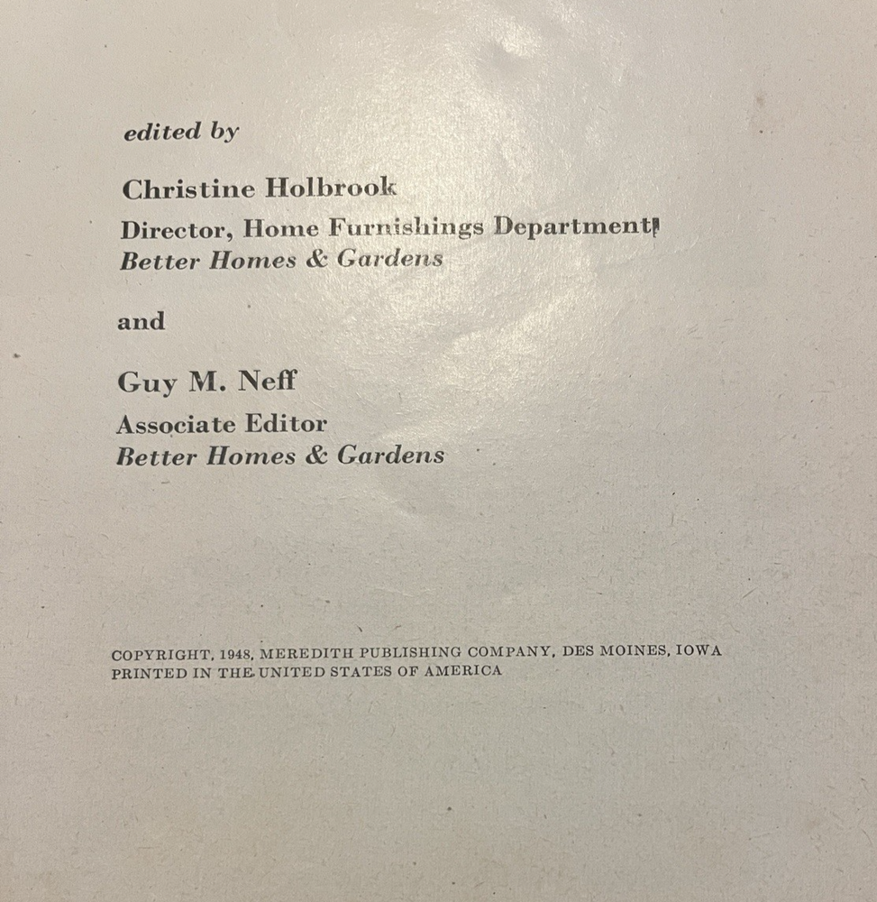 Acceptable Condition: page wear and tanning, cover are worn - all pages intact - no cutouts Stapled Binding is intact 1948 Better Homes and Gardens - Home Furnishings Ideas Color and Black & White Photos Number of Pages: 204 Ships USPS Ground Advantage in a Sturdy Cardboard Mailer