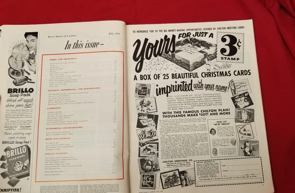 🔴 Rare July 1954 Better Homes and Gardens Magazine ▶ Serving over 3,800,000 Homemaking Families ❗ 🔴 Fun to Read Stories - Great 68yrs Old Ads - Sweet Vintage Magazine [ The Ads & Pictures are Truly an Mid-Century Vintage Art Form 🌐 ] 🆓 Shipped Free & Fast with Priority Media Mail. [ 📷 See Pictures & Zoom 👀 ] ▶ The Better Homes are Rare Memorabilia of a Lifestyle that's gone but not forgotten - Complete ▶ No writing or Highlighting - No missing pages - Great Shape for 68yrs Old. ▶ Some minor nicks stains or creases. The inside pages are in overall good condition. ▶ July 1954 Looks Great - Cover & Back Loose with Small Rips - No Worries ✔ ▶ For magazine highlights please refer to the photo of the Table of Contents ✔ 🌎 See How America & World Has Changed in the past 68yrs and How it Hasn't Changed 🔴 Please Zoom In for More Detail. One Picture is worth a Thousand Words ✔ ✅ 100% Satisfaction Guaranteed ✅