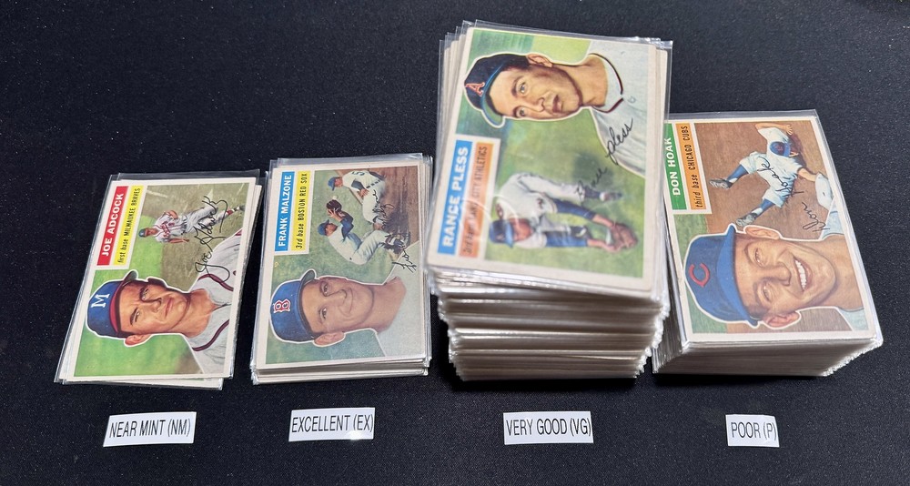 Complete Your Card Set 1956 Topps Baseball Cards 1-340 (P-NM) - You Pick - Complete Your Set Description 1956 Topps Baseball Cards 1-340 (P-NM) - You Pick - Complete Your Set Choose the cards from this listing to complete your set. Please see destails below about card conditions, discounts, combined shipping, packaging, and tracking. Cards available in this set include: Base Cards Please see the separate listing(s) for the other cards in this same set: All cards for this set are included in this single listing. Visit my eBay store to see other sets: Complete Your Card Sets | eBay Stores Discounts Volume Priceing 2 cards - 10% off both 3 cards - 15% off all 3 4+ cards - 20% off all of my "complete your set" listing cards in the cart. Combined Shipping $0.69 cents for the first card and .15 cents for each additional card $5.00 max shipping per order for "complete your set" listings Conditions I have categorized the cards according to the eBay card condition guide so you have a good idea of the condition of each card. The condition is added to the end of each card name and I usually grade more stringent that the condition guide outlines. If more than one card with the same condition specified is available, I will select the best conditioned card for you. NM +: Near Mint or Better Minor issues on corners or edges if any EX : Excellent Excellent shape with some imperfections 1-3 corners may have dings VG : Very Good 3-4 corners are bent or rounded Rarely have 1 wrinkle or crease that doesn’t cross the entire face of the card. No staining or very little (not often) on front or back of card No tears, significantly damaged surfaces, or pen writings on them P : Poor Corners are bent or rounded May have 1 or more wrinkles or creases May have some sort of staining on the front or back of card PM : Poor w/ pen or pencil markings Some sort of pen or pencil marking on the card Typically, the number on the back is crossed out or highlighted Checklists that have boxes checked Examples : See the pictures on the listing for examples that show a good representation of the general conditions. Packaging Your cards will be well protected guaranteed! All cards are packaged in penny sleeves, placed in top loader hard sleeves, and wrapped in a team bag. Orders of 14 cards or less and under $20 will be safely packaged and shipped in a plain white envelope Orders of 15+ cards will be safely packaged in a bubble envelope Shipping Cards will be packaged and shipped the same or next business day. All orders will ship using " eBay Standard Envelope " or " USPS Ground Advantage " Orders under $20 with 14 cards or less will ship in a plain envelope using "eBay Standard Envelope" which includes eBay Tracking Orders over $20 OR include 15+ cards will be packaged in a bubble envelope and shipped using "USPS Ground Advantage" which includes regular USPS Tracking. Tracking NOTE : Cards shipped with the "eBay Standard Envelope" tracking are scanned and the tracking is marked as "Delivered" when they arrive at the destination post office. It will take a couple additional days BEFORE the cards arrive at the your address. Please contact if you are experiencing delays longer than expected.