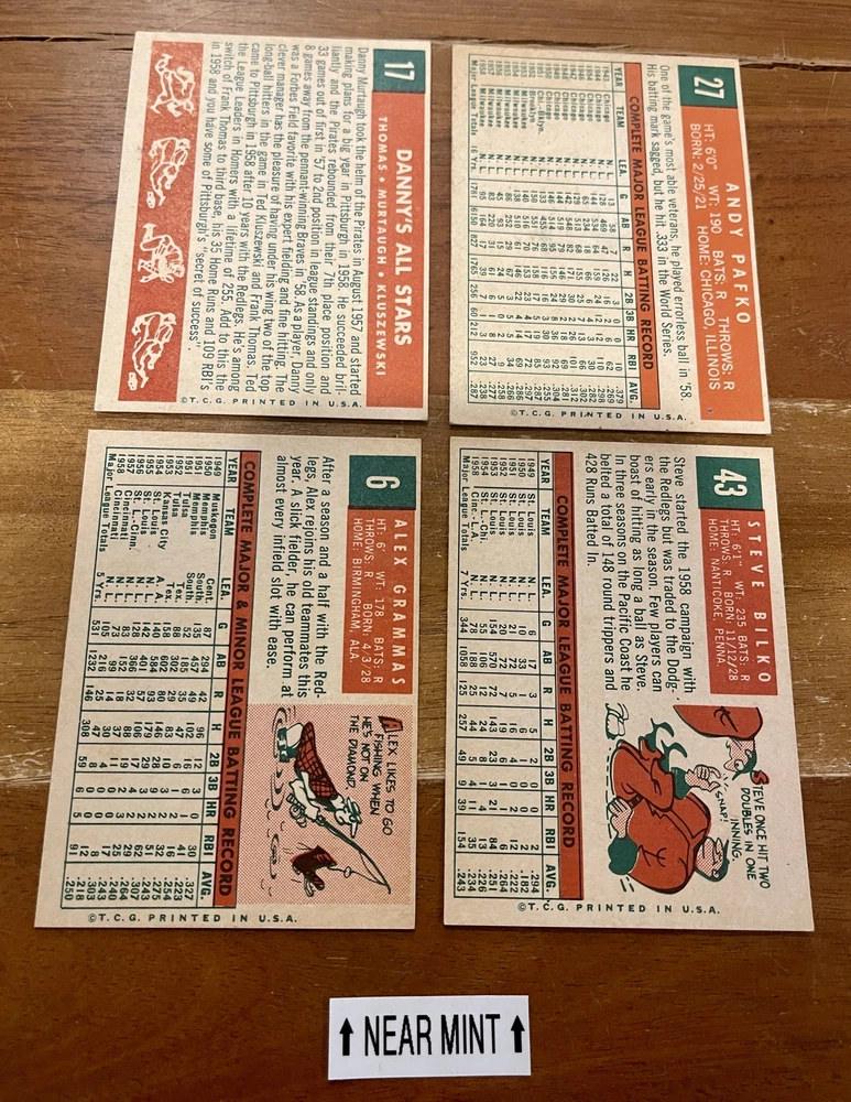 Complete Your Card Set 1959 Topps Baseball Cards 1-200 (P-NM) - You Pick - Complete Your Set Description 1959 Topps Baseball Cards 1-200 (P-NM) - You Pick - Complete Your Set Choose the cards from this listing to complete your set. Please see destails below about card conditions, discounts, combined shipping, packaging, and tracking. Cards available in this set include: Base Cards Please see the separate listing(s) for the other cards in this same set: 1959 Topps Baseball Cards 1-200 (P-NM) - You Pick - Complete Your Set 1959 Topps Baseball Cards 201-400 (P-NM) - You Pick - Complete Your Set 1959 Topps Baseball Cards 401-572 (P-NM) - You Pick - Complete Your Set Visit my eBay store to see other sets: Complete Your Card Sets | eBay Stores Discounts Volume Priceing 2 cards - 10% off both 3 cards - 15% off all 3 4+ cards - 20% off all of my "complete your set" listing cards in the cart. Combined Shipping $0.69 cents for the first card and .15 cents for each additional card $5.00 max shipping per order for "complete your set" listings Conditions I have categorized the cards according to the eBay card condition guide so you have a good idea of the condition of each card. The condition is added to the end of each card name and I usually grade more stringent that the condition guide outlines. If more than one card with the same condition specified is available, I will select the best conditioned card for you. NM +: Near Mint or Better Minor issues on corners or edges if any EX : Excellent Excellent shape with some imperfections 1-3 corners may have dings May have minor wrinkle (not usually) but no creases VG : Very Good 3-4 corners are bent or rounded Rarely have 1 wrinkle or crease that doesn’t cross the entire face of the card. No staining or very little (not often) on front or back of card No tears, significantly damaged surfaces, or pen writings on them P : Poor Corners are bent or rounded May have 1 or more wrinkles or creases May have some sort of staining on the front or back of card PM : Poor w/ pen or pencil markings Some sort of pen or pencil marking on the card Typically, the number on the back is crossed out or highlighted Checklists that have boxes checked Examples : See the pictures on the listing for examples that show a good representation of the general conditions. Packaging Your cards will be well protected guaranteed! All cards are packaged in penny sleeves, placed in top loader hard sleeves, and wrapped in a team bag. Orders of 14 cards or less and under $20 will be safely packaged and shipped in a plain white envelope Orders of 15+ cards will be safely packaged in a bubble envelope Shipping Cards will be packaged and shipped the same or next business day. All orders will ship using " eBay Standard Envelope " or " USPS Ground Advantage " Orders under $20 with 14 cards or less will ship in a plain envelope using "eBay Standard Envelope" which includes eBay Tracking Orders over $20 OR include 15+ cards will be packaged in a bubble envelope and shipped using "USPS Ground Advantage" which includes regular USPS Tracking. Tracking NOTE : Cards shipped with the "eBay Standard Envelope" tracking are scanned and the tracking is marked as "Delivered" when they arrive at the destination post office. It will take a couple additional days BEFORE the cards arrive at the your address. Please contact if you are experiencing delays longer than expected.