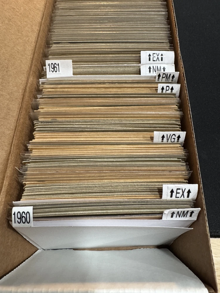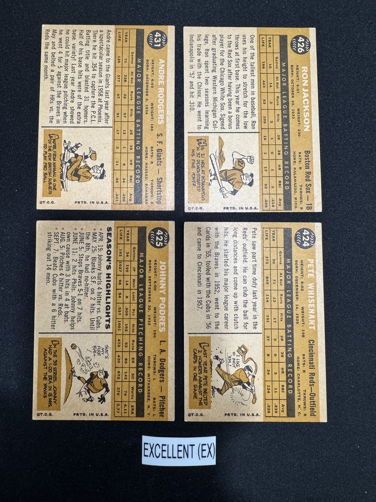 Complete Your Card Set 1960 Topps Baseball Cards 401-572 (P-NM) - You Pick - Complete Your Set Description 1960 Topps Baseball Cards 401-572 (P-NM) - You Pick - Complete Your Set Choose the cards from this listing to complete your set. Please see details below about card conditions, discounts, combined shipping, packaging, and tracking. Cards available in this set include: Base Cards Please see the separate listing(s) for the other cards in this same set: 1960 Topps Baseball Cards 1-200 (P-NM) - You Pick - Complete Your Set 1960 Topps Baseball Cards 201-400 (P-NM) - You Pick - Complete Your Set 1960 Topps Baseball Cards 401-572 (P-NM) - You Pick - Complete Your Set Visit my eBay store to see other sets: Complete Your Card Sets | eBay Stores Discounts Volume Priceing 2 cards - 10% off both 3 cards - 15% off all 3 4+ cards - 20% off all of my "complete your set" listing cards in the cart. Combined Shipping $0.69 cents for the first card and .15 cents for each additional card $5.00 max shipping per order for "complete your set" listings Conditions I have categorized the cards according to the eBay card condition guide so you have a good idea of the condition of each card. The condition is added to the end of each card name and I usually grade more stringent that the condition guide outlines. If more than one card with the same condition specified is available, I will select the best conditioned card for you. NM +: Near Mint or Better Minor issues on corners or edges if any EX : Excellent Excellent shape with some imperfections 1-3 corners may have dings VG : Very Good 3-4 corners are bent or rounded Rarely have 1 wrinkle or crease that doesn’t cross the entire face of the card. No staining or very little (not often) on front or back of card No tears, significantly damaged surfaces, or pen writings on them P : Poor Corners are bent or rounded May have 1 or more wrinkles or creases May have some sort of staining on the front or back of card PM : Poor w/ pen or pencil markings Some sort of pen or pencil marking on the card Typically, the number on the back is crossed out or highlighted Checklists that have boxes checked Examples : See the pictures on the listing for examples that show a good representation of the general conditions. Packaging Your cards will be well protected guaranteed! All cards are packaged in penny sleeves, placed in top loader hard sleeves, and wrapped in a team bag. Orders of 14 cards or less and under $20 will be safely packaged and shipped in a plain white envelope Orders of 15+ cards will be safely packaged in a bubble envelope Shipping Cards will be packaged and shipped the same or next business day. All orders will ship using " eBay Standard Envelope " or " USPS Ground Advantage " Orders under $20 with 14 cards or less will ship in a plain envelope using "eBay Standard Envelope" which includes eBay Tracking Orders over $20 OR include 15+ cards will be packaged in a bubble envelope and shipped using "USPS Ground Advantage" which includes regular USPS Tracking. Tracking NOTE : Cards shipped with the "eBay Standard Envelope" tracking are scanned and the tracking is marked as "Delivered" when they arrive at the destination post office. It will take a couple additional days BEFORE the cards arrive at the your address. Please contact if you are experiencing delays longer than expected.