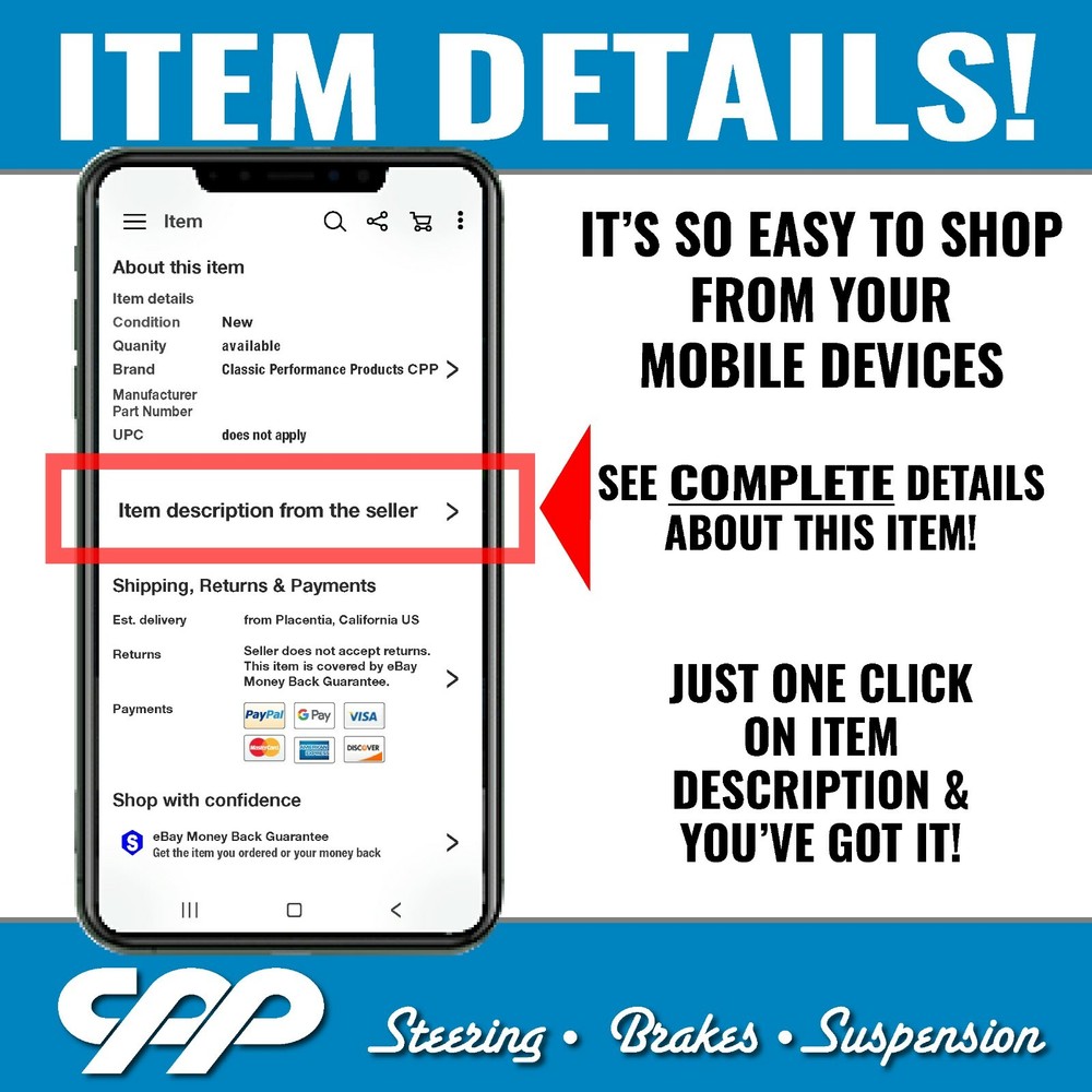Steering • Brakes • Suspension Call the Experts 1963-1987 Chevy 1/2 Ton C-10 Truck 450 LB CPP Coil Springs and Spanner Wrench and Thrust Bearings for the CPP or Viking Coilovers. Features: 450LBS coil springs Cold wound, high tensile U.S spring steel springs Springs are heat treated, shot-peened, and have a silver powder coat finish Spanner Wrench and Thrust Bearings These 450lbs springs is cold wound, high tensile U.S. spring steel that has been heat treated and shot peened with both ends ground and are powder coated a chrome-like silver. Additionally, they are non-binding "high travel" springs and are 25% lighter, on average versus the competition. Transform your Classic Truck from an average driver to a street machine with these coilover Springs (shocks not included) CPP Thrust Bearing And Spanner Wrench Kit for Coil Over Shocks Features : Thrust bearing kit for two (2) coilover shocks Will work with most popular brands such as Viking, Aldan, QA-1, RideTech, Strange, etc! Pre-oiled and ready to install Makes adjusting coilovers much easier Includes two (2) spanner wrenches for adjustment If you've purchased a coilover kit without thrust bearings, you've probably noticed its difficult to adjust, completely defeating the purpose of having an adjustable suspension. Coil over conversions are quickly becoming the standard in classic Truck builds due to their wide range of adjustment and excellent performance on the street and strip but let's face it, nobody likes adjusting their coilovers, especially out at the track or outside of the shop. This thrust bearing and spanner wrench kit will make that task easier and best of all, these come pre-oiled and ready to install on the most popular coilover kits out there! (Part# 81037, CPSPAN-K, SPANNER ) BEFORE LEAVING FEEDBACK If you receive an order that does not meet your expectations, please allow us the opportunity to fix the problem before leaving negative feedback or rating us. We want you to be happy with your purchase! Contact us via the Message Center if you require any assistance. SHIPPING INFORMATION Orders over $599 will be sent out with signature required. You will need to sign for your packages or make arrangements with the carrier to pick up from their nearest hub. Most items (unless noted in the handling time) ship from our warehouse within 2-3 business days from the business day your payment is received and processed in our system. Orders placed Friday and through the weekend will be processed Monday (excluding Holidays). Once your order is processed and shipped from our warehouse you will receive an email with your tracking information. We ship via UPS and FedEx. We only ship to a confirmed PayPal shipping address. All Will Call orders must be placed at least 24 hours in advance for pickup from the showroom, including in showroom or parking lot orders. Local pickup is available upon request. A matching ID, which must correspond to the name on the PayPal payment, is mandatory for picking up items. Will Call orders will not be released and will be refused if the person and ID do not match the PayPal payment. Local pick up requires a 24hr processing time before pick up. We will notify you when the parts are ready for pick up. Local pick up requires a 24hr processing time before pick up. We will notify you when the parts are ready for pick up. CONTACT US Messages via eBay are answered within 24 hours, not including weekends or holidays. WARRANTY All eBay purchases come with a 30-day warranty from the day you receive your order. If you receive an item that is damaged or defective or missing components, please notify us within 3 days of receipt. Any items outside the 30-day warranty will be the responsibility of the customer to pay for any repairs, as well as cover all shipping costs.