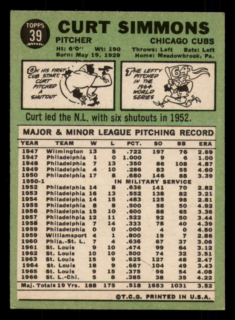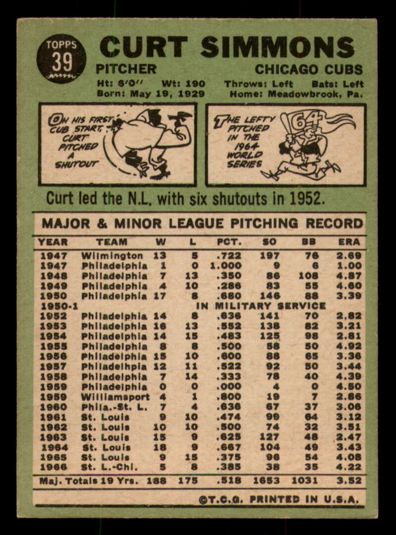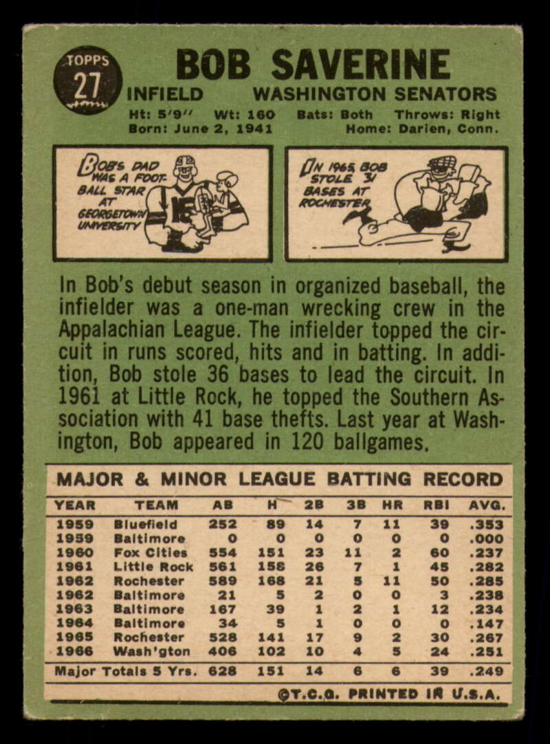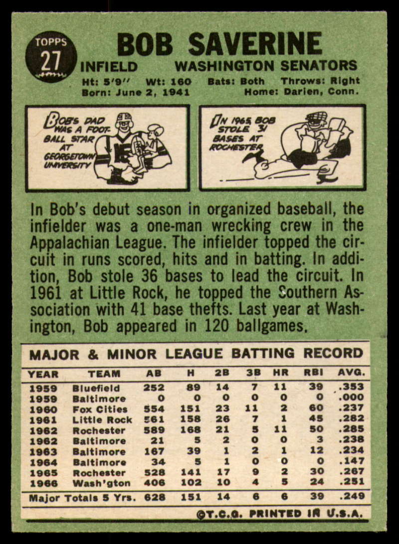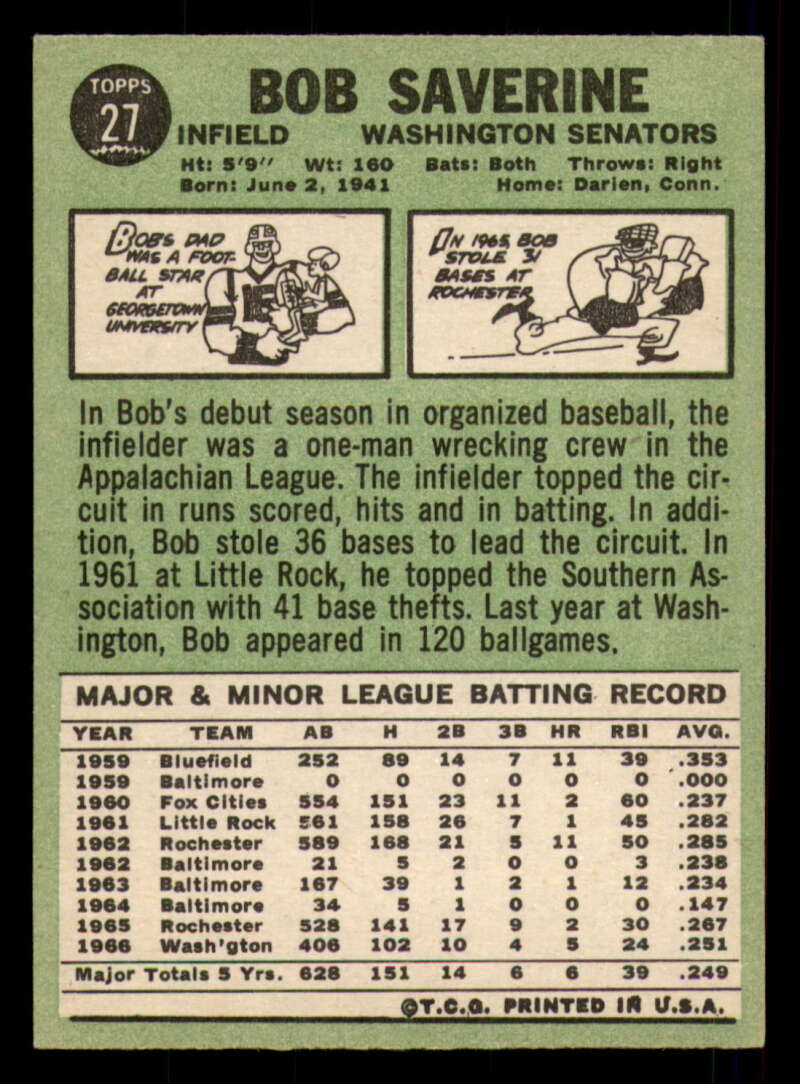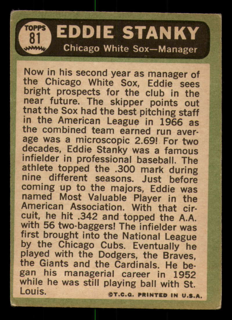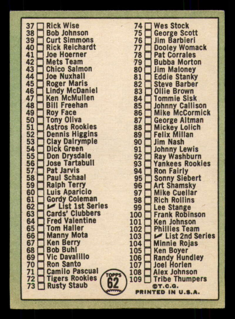 ALL MARTY'S STUFF The card in the scan is the card for sale. Each card has a high quality front and back scan of the item that you will receive. Please check the front and back pictures before buying. For combined shipping, please select all the cards that you would like from all of our many listings and have them in your shopping cart. We have a base shipping charge plus $0.05 for each additional card. Once you have made your selections, go to checkout and make one payment for the entire purchase. Multiple payments will result in multiple shipping charges. I f you have any questions, please ask . 1967 Topps Baseball - #3 - #145 - Complete your set - Pick your card #3 Duke Sims stain creased Indians #4 Hal Lanier paper loss Giants #5 Whitey Ford taped creased Yankees #5 Whitey Ford G VG Good Very Good Yankees #5 Whitey Ford water damaged Yankees #7 Don McMahon VG Very Good Red Sox #8 Chuck Harrison Poor Astros #8 Chuck Harrison VG Very Good Astros #9 Ron Hansen creased White Sox #9 Ron Hansen EX Excellent White Sox #9 Ron Hansen VG Very Good White Sox #11 Barry Moore VG EX Very Good Exce Senators (2)#11 Barry Moore VG EX Very Good Exce Senators (3)#11 Barry Moore VG EX Very Good Exce Senators #13 Joe Sparma VG EX Very Good Exce Tigers #14 Phil Linz EX+ Phillies #15 Earl Battey water damage Twins #17 Jim Gosger EX NM Athletics #18 Gene Oliver EX Excellent Braves #18 Gene Oliver G Good Braves #19 Jim McGlothlin EX NM Angels #19 Jim McGlothlin marked Angels #22 Gene Brabender EX Excellent Orioles #25 Elston Howard EX Excellent Yankees #26a Bob Priddy Poor Senators #26a Bob Priddy VG EX Very Good Exce Senators #27 Bob Saverine EX Excellent Senators (2)#27 Bob Saverine EX Excellent Senators #27 Bob Saverine oc Senators #27 Bob Saverine VG EX Very Good Exce Senators #288 Denny LeMaster tear Braves #29 Tommy McCraw creased White Sox #29 Tommy McCraw EX Excellent White Sox (2)#29 Tommy McCraw EX Excellent White Sox (3)#29 Tommy McCraw EX Excellent White Sox #29 Tommy McCraw VG EX Very Good Exce White Sox #30 Al Kaline creased Tigers #30 Al Kaline G VG Good Very Good Tigers #30 Al Kaline Poor Tigers #31 Jim Brewer EX NM Dodgers #32 Bob Bailey creased Dodgers #32 Bob Bailey EX Excellent Dodgers #32 Bob Bailey VG Very Good Dodgers #32 Bob Bailey water damage creased Dodgers #34 Pete Cimino EX Excellent Angels #38 Bob Johnson creased Orioles (2)#38 Bob Johnson creased Orioles #38 Bob Johnson VG EX Very Good Exce Orioles (2)#38 Bob Johnson VG EX Very Good Exce Orioles #39 Curt Simmons EX Excellent Cubs #39 Curt Simmons EX+ Cubs #39 Curt Simmons miscut back Cubs #39 Curt Simmons VG EX Very Good Exce Cubs (2)#39 Curt Simmons VG EX Very Good Exce Cubs #40 Rick Reichardt creased Angels #40 Rick Reichardt EX Excellent Angels #40 Rick Reichardt G VG Good Very Good Angels #41 Joe Hoerner creased Cardinals #41 Joe Hoerner VG EX Very Good Exce Cardinals #42 Mets Team creased Mets #43 Chico Salmon G Good Indians #44 Joe Nuxhall creased Reds #44 Joe Nuxhall EX Excellent Reds (2)#44 Joe Nuxhall EX Excellent Reds #44 Joe Nuxhall EX NM Reds #44 Joe Nuxhall G VG Good Very Good Reds #46 Lindy McDaniel creased Giants #46 Lindy McDaniel EX Excellent Giants #46 Lindy McDaniel Fair Giants #46 Lindy McDaniel VG Very Good Giants (2)#46 Lindy McDaniel VG Very Good Giants #47 Ken McMullen EX Excellent Senators (2)#47 Ken McMullen EX Excellent Senators (3)#47 Ken McMullen EX Excellent Senators #47 Ken McMullen EX NM Senators (2)#47 Ken McMullen EX NM Senators #47 Ken McMullen VG EX Very Good Exce Senators #48 Bill Freehan creased Tigers #49 Roy Face creased Pirates (2)#49 Roy Face creased Pirates #49 Roy Face EX Excellent Pirates #49 Roy Face EX NM Pirates #50 Tony Oliva VG EX Very Good Exce Twins #51 Dave Adlesh Lee Bales VG EX Very Good Exce Ast #52 Dennis Higgins VG EX Very Good Exce White Sox #525 Ron Hunt EX+ Dodgers #53 Clay Dalrymple EX Excellent Phillies #55 Don Drysdale creased Dodgers #55 Don Drysdale miscut creased Dodgers #55 Don Drysdale VG Very Good Dodgers #55 Don Drysdale VG EX Very Good Exce Dodgers #56 Jose Tartabull EX Excellent Red Sox #57 Pat Jarvis creased Braves (2)#57 Pat Jarvis creased Braves #570 Maury Wills EX Excellent Pirates #58a Paul Schaal EX Excellent Angels #58a Paul Schaal VG EX Very Good Exce Angels (2)#58a Paul Schaal VG EX Very Good Exce Angels (3)#58a Paul Schaal VG EX Very Good Exce Angels #59 Ralph Terry EX Excellent Mets #59 Ralph Terry EX+ Mets #59 Ralph Terry VG EX Very Good Exce Mets (2)#59 Ralph Terry VG EX Very Good Exce Mets (3)#59 Ralph Terry VG EX Very Good Exce Mets #61 Gordy Coleman VG EX Very Good Exce Reds #62a Checklist 1-109 c Orioles #62a Checklist 1-109 marked Orioles (2)#62a Checklist 1-109 marked Orioles #62a Checklist 1-109 marked creased Orioles #65 Tom Haller creased Giants #65 Tom Haller EX Excellent Giants #65 Tom Haller EX NM Giants (2)#65 Tom Haller EX NM Giants #65 Tom Haller VG EX Very Good Exce Giants #66 Manny Mota EX+ oc Pirates #66 Manny Mota EX+ Pirates #66 Manny Mota NM Near Mint Pirates #66 Manny Mota VG EX Very Good Exce Pirates (2)#66 Manny Mota VG EX Very Good Exce Pirates #67 Ken Berry creased White Sox #67 Ken Berry EX Excellent White Sox #67 Ken Berry VG Very Good White Sox (2)#67 Ken Berry VG Very Good White Sox (3)#67 Ken Berry VG Very Good White Sox #72 George Korince Tom Matchick VG EX Very Good Ex (2)#72 George Korince Tom Matchick VG EX Very Good #74 Wes Stock Poor Athletics #76 Jim Barbieri creased Dodgers #76 Jim Barbieri marked Dodgers #76 Jim Barbieri VG Very Good Dodgers #76 Jim Barbieri VG EX Very Good Exce Dodgers #77 Dooley Womack creased Yankees #77 Dooley Womack EX Excellent Yankees (2)#77 Dooley Womack EX Excellent Yankees #77 Dooley Womack VG EX Very Good Exce Yankees #78 Pat Corrales EX Excellent Cardinals (2)#78 Pat Corrales EX Excellent Cardinals #78 Pat Corrales EX++ Excellent++ Cardinals #78 Pat Corrales VG Very Good Cardinals #79 Bubba Morton creased Angels #79 Bubba Morton EX Excellent Angels #80 Jim Maloney EX Excellen