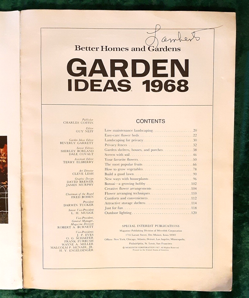 Here we have a vintage copy of the Better Homes And Gardnes 1968 "Garden Ideas" edition of the magazzine. Inside are articles on bed building, greenouse construction, fruit care and more. No mailing label or glue residue. Cover does have some scuffing from shelf wear, and some corner rounding. Also has my grandparents last name at the top of the cover and on the contents page (see photos). Spine is straight and square and all pages are firmly attached. Been in my family many years, and it's time for it to join your collection! The photos are of the very magazine you are bidding on, not a "similar" item. I will gladly provide further photos or information about this piece until you are comfortable. If you do have any concern with a purchase from me, please contact me. I offer good quality merchandise, and I think my Ebay rating speaks for itself. If you purchase multiple items I will gladly combine shipping and refund a portion of your shipping cost. Orders received between 12:00 PM on Friday and Monday morning will ship Monday. All other orders will ship within 24 hours, and I will provide a tracking number at time of shipment. I will ship to Alaska and Hawaii on request but shipping would have to be computed. I do not ship internationally. We ship only to Ebay verified addresses. Shipping via US Post.