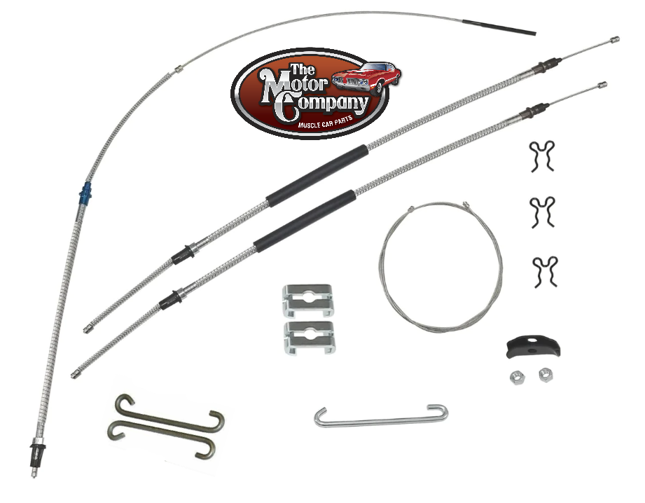 1968-72 GM A-body Parking brake cable kits with Hardware for turbo 400 trans. This set is for the T400 trans cars. This is the long transmission cross mount hook and the 2 side floor pan hooks, connectors, equalizer with nuts, and cable clips.