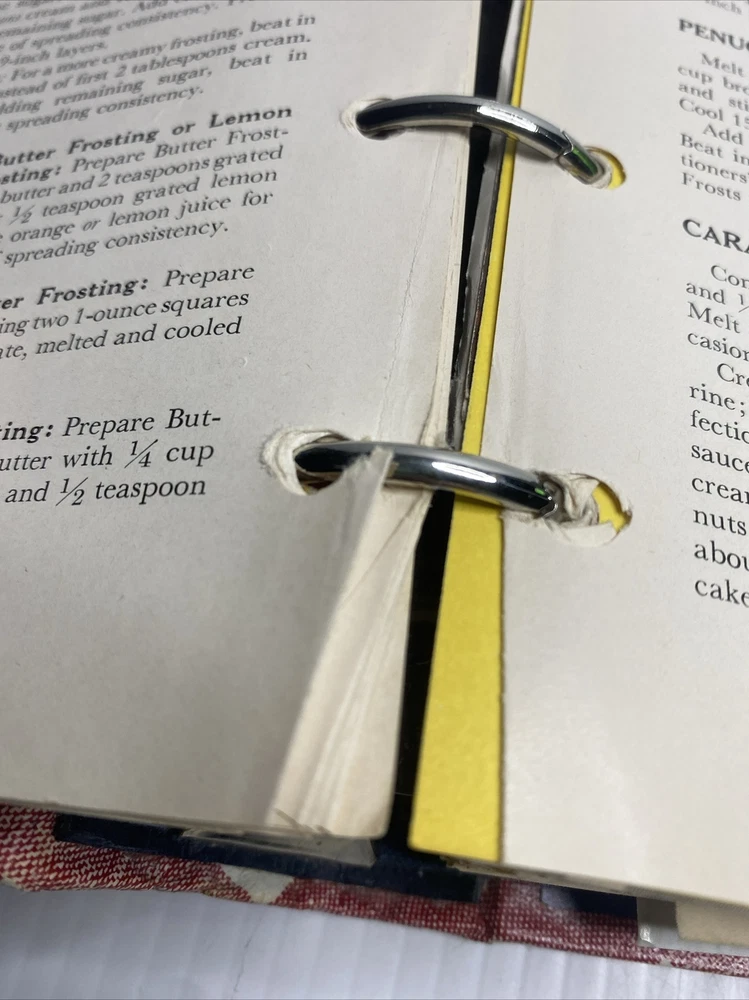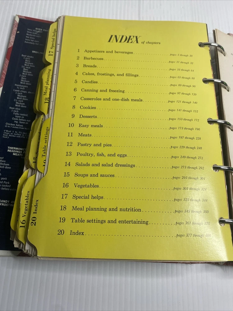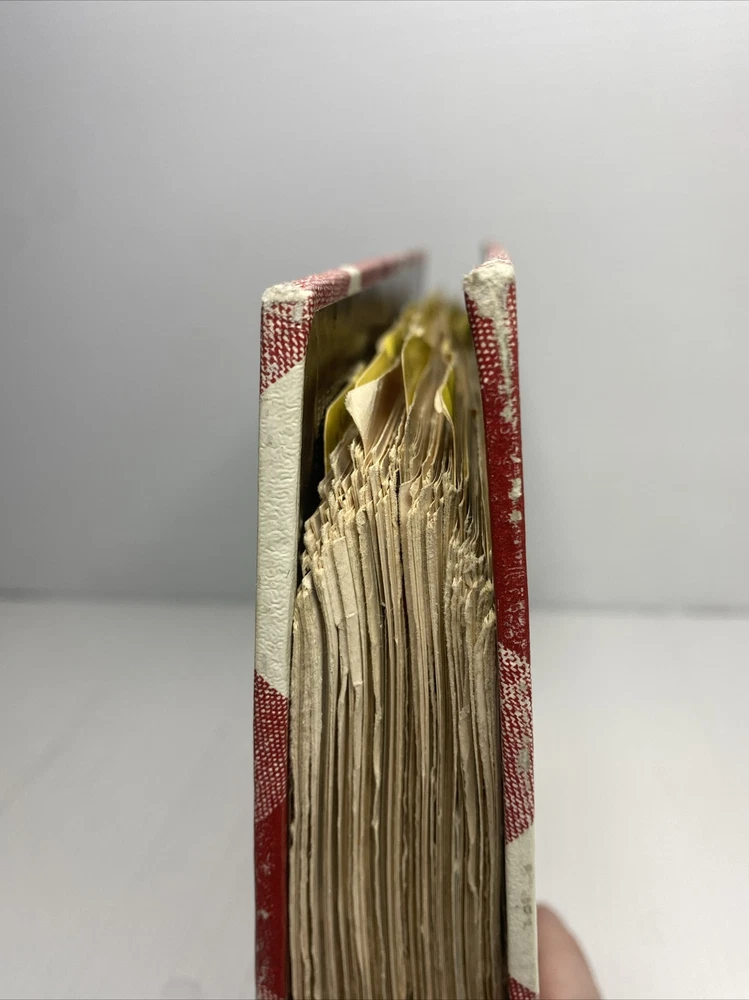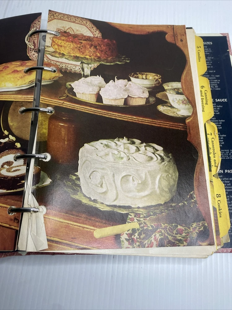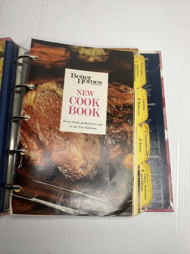 This hardback cookbook features 400 pages of recipes, cooking tips, and beautiful images. The 1969 Better Homes & Gardens New Cookbook is a vintage treasure for any collector or cooking enthusiast. It comes in a 5 ring binder format, making it easy to flip through and find your favorite recipes. This book has stains and a few scratches on the cover. Pages almost all are folded on the bottom inside. Please see pictures for a better assessment of condition.