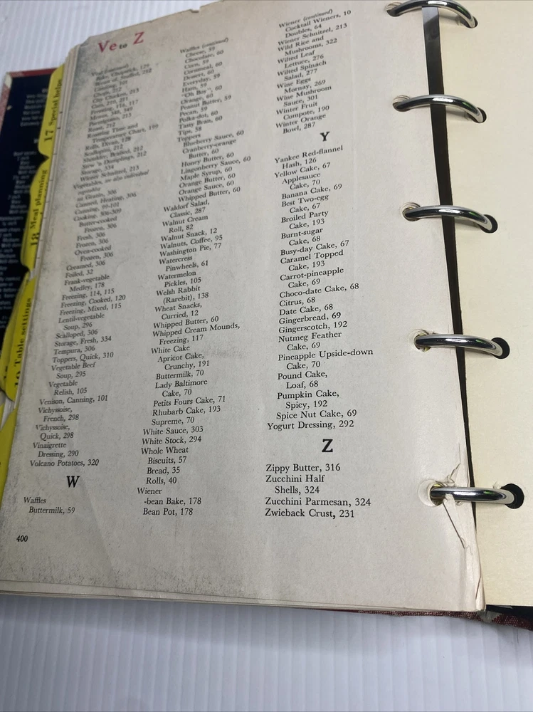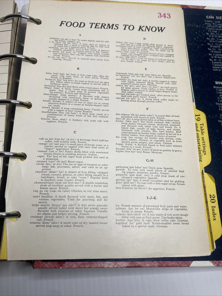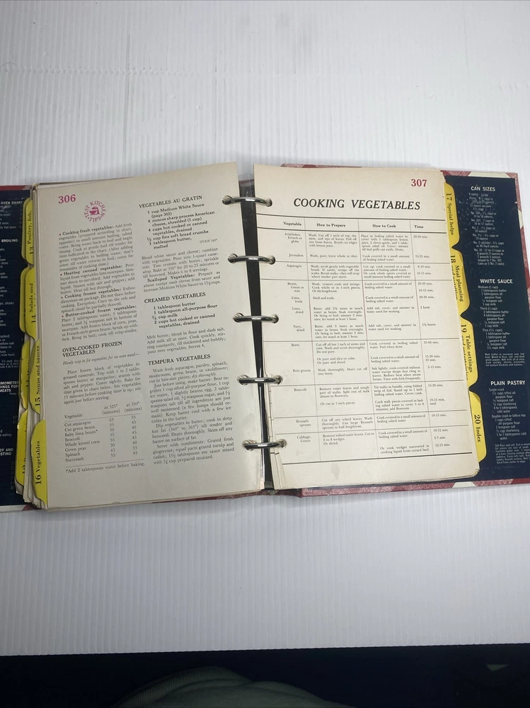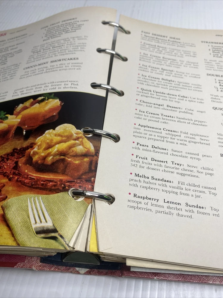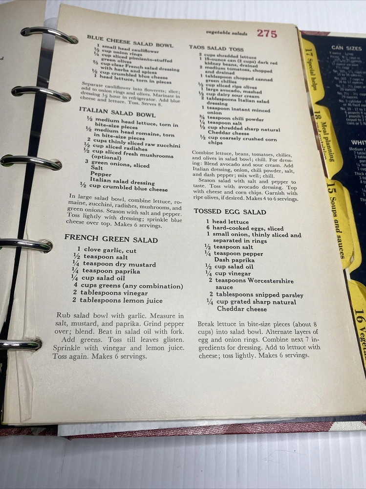 This hardback cookbook features 400 pages of recipes, cooking tips, and beautiful images. The 1969 Better Homes & Gardens New Cookbook is a vintage treasure for any collector or cooking enthusiast. It comes in a 5 ring binder format, making it easy to flip through and find your favorite recipes. This book has stains and a few scratches on the cover. Pages almost all are folded on the bottom inside. Please see pictures for a better assessment of condition.