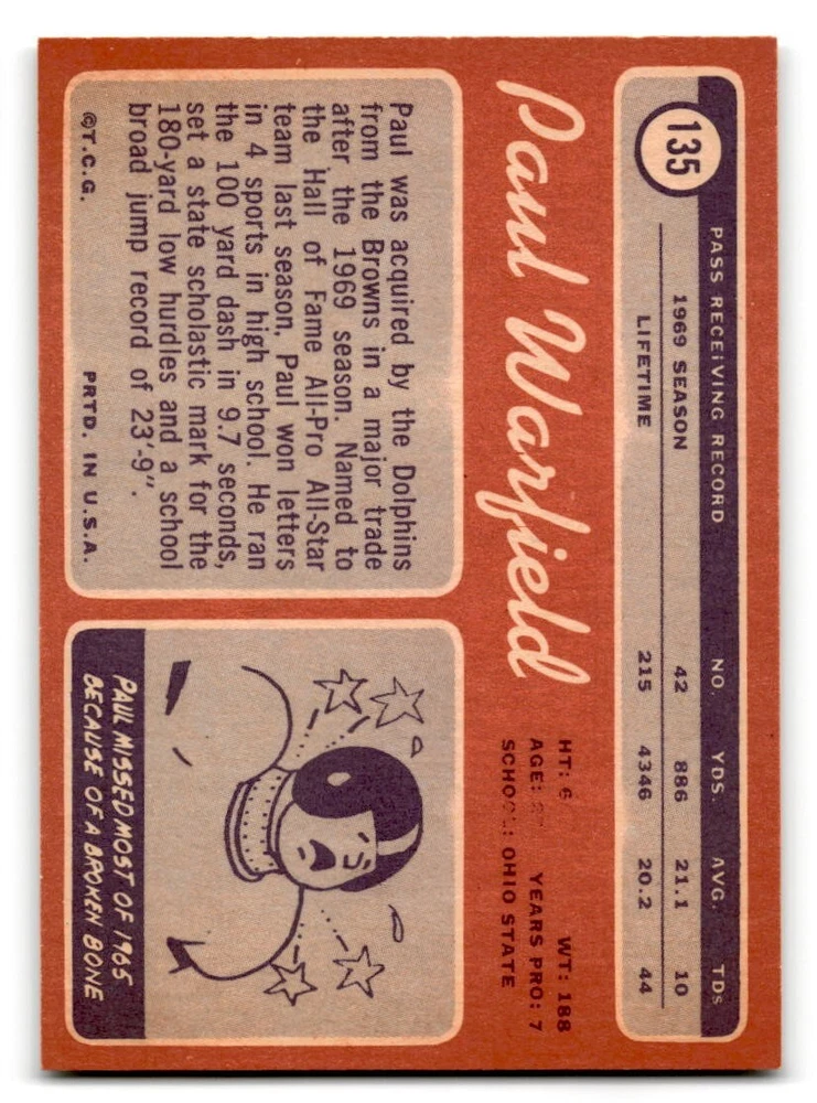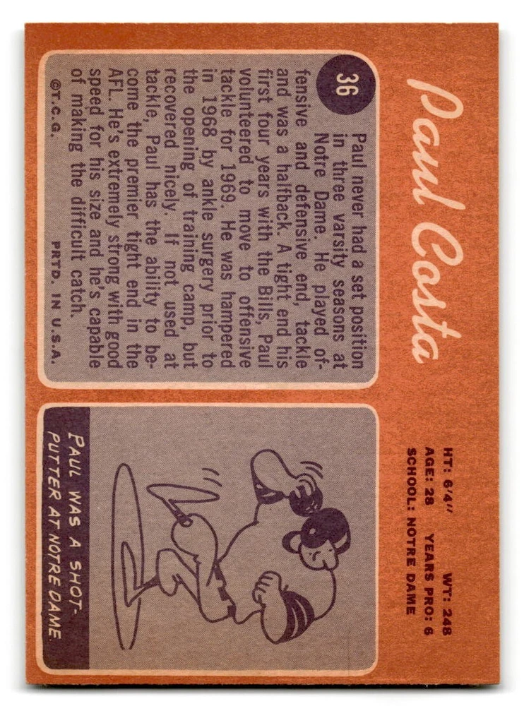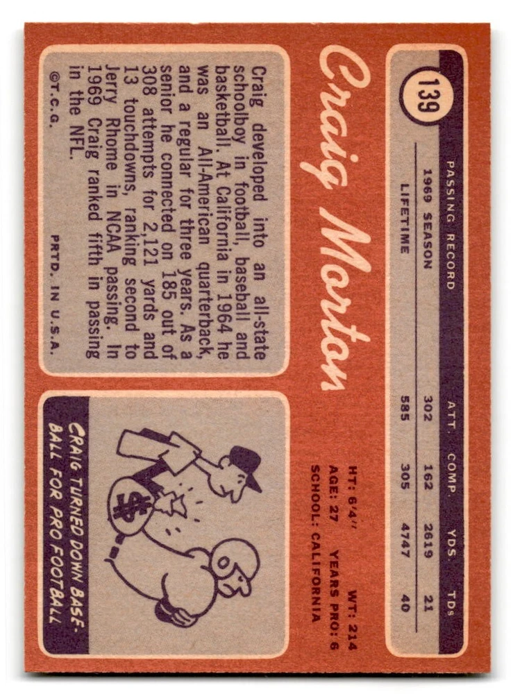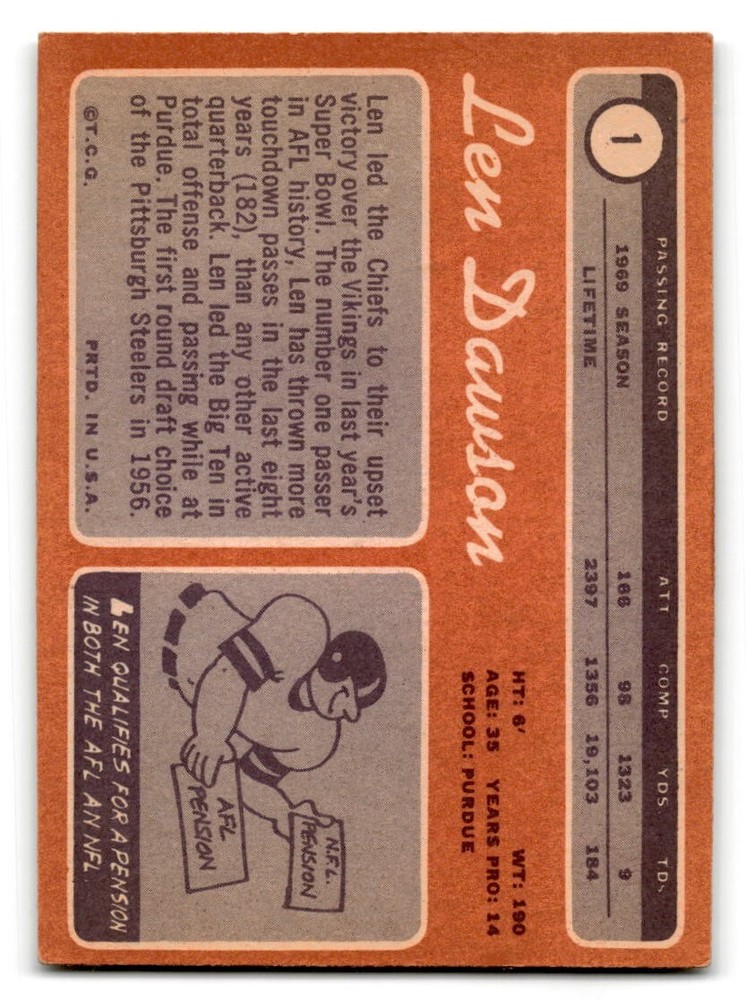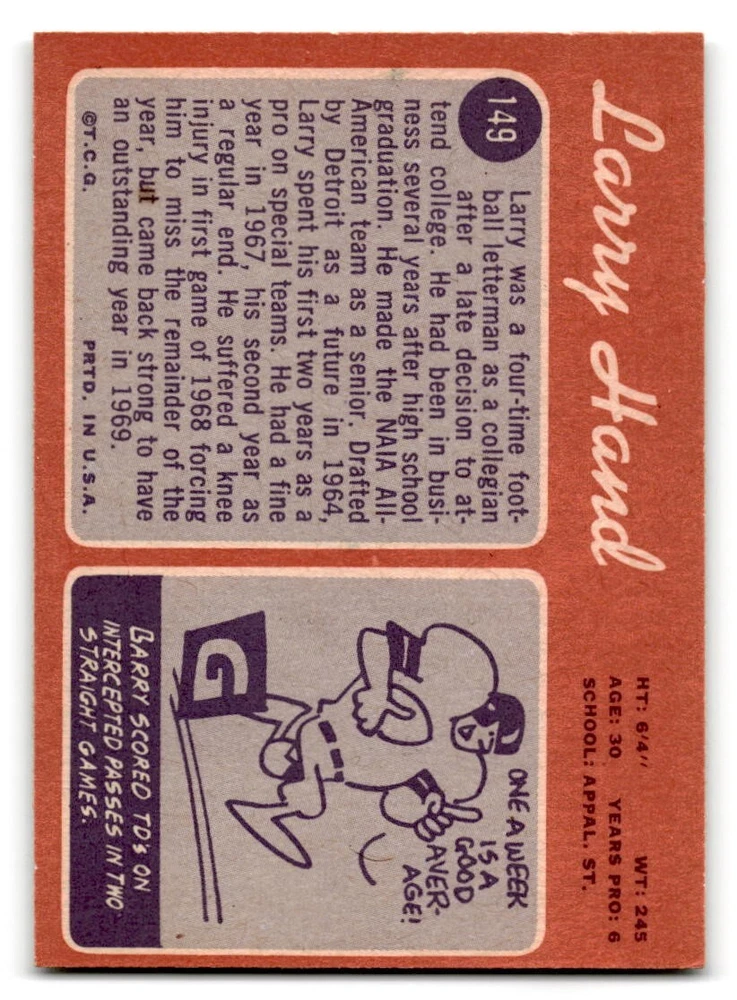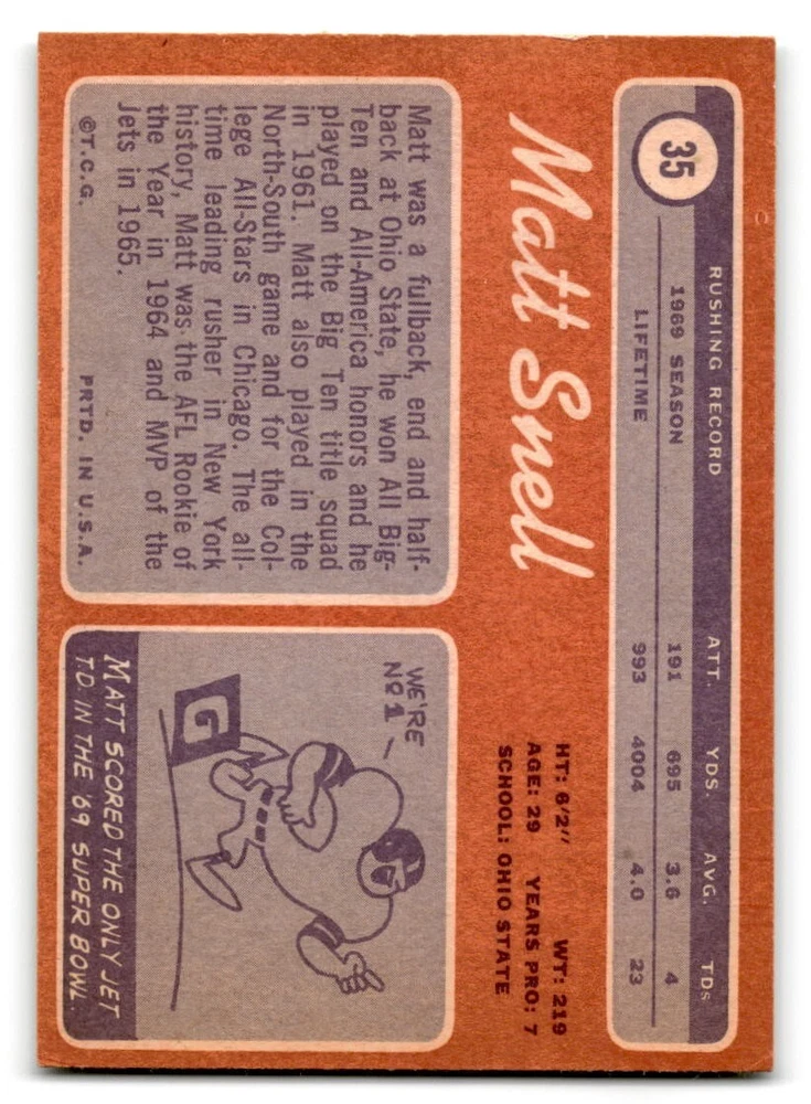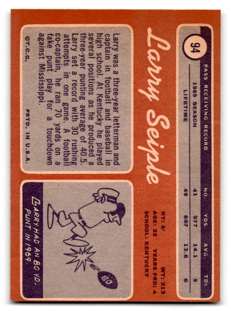 Hello, This listing is for single cards from the 1970 Topps Football Set. The cards are in EX to EX/MT unless there is a grade next to the name. I also have noted if the card has wax on the card (front of the card, none of the cards have wax stains on the back). I have generically graded all wax cards as a VG. If there is a card in VG with no notes saying there is wax, then there is damage to the card. The card in the picture is the card you will receive! Grading: NM = 7 EX/MT = 6 EX = 5 VG/EX = 4 VG = 3 G = 2 Shipping: 1st card costs $1.00 using eBay Standard Envelope and .50cents for each additional card. If you buy 7 cards or more, the shipping cost is $4 for Ground Advantage (just check the boxes for Ground Advantage in the check out and no matter how many cards you are buying the cost will be $4 max! When buying 7 cards, they will be shipped in a padded envelope or box. (Ground Advantage or Priority Mail for larger orders) The last thing I am trying to do is make a profit off of Shipping. When using eBay Standard Envelope, I will put up to 2 cards in 1 top loader to ship. Unfortunately that is the max I can put in a top loader because of the thickness of these cards. I can fit 3 top loaders in one started letter sized envelope. If you have any questions about shipping please don't hesitate to ask.
