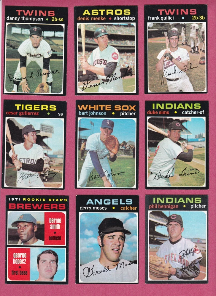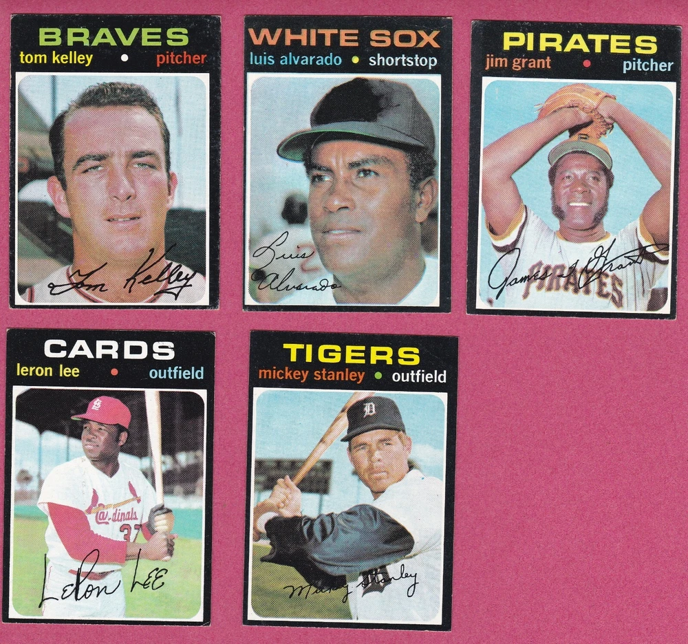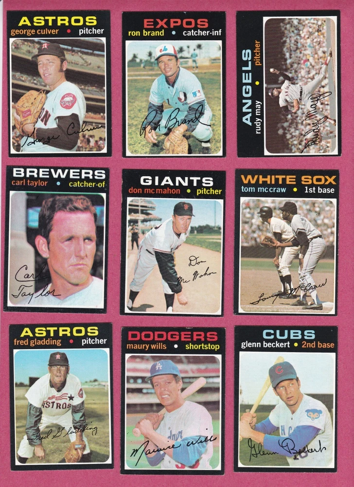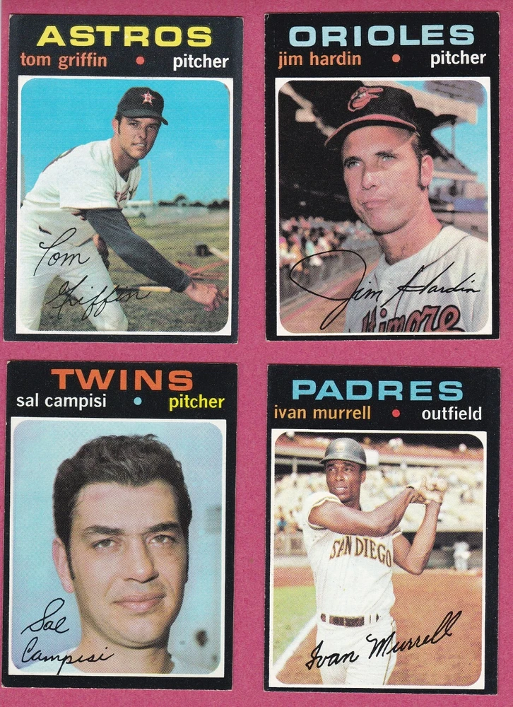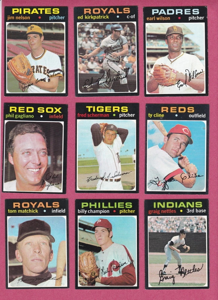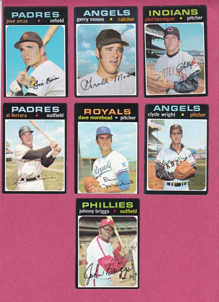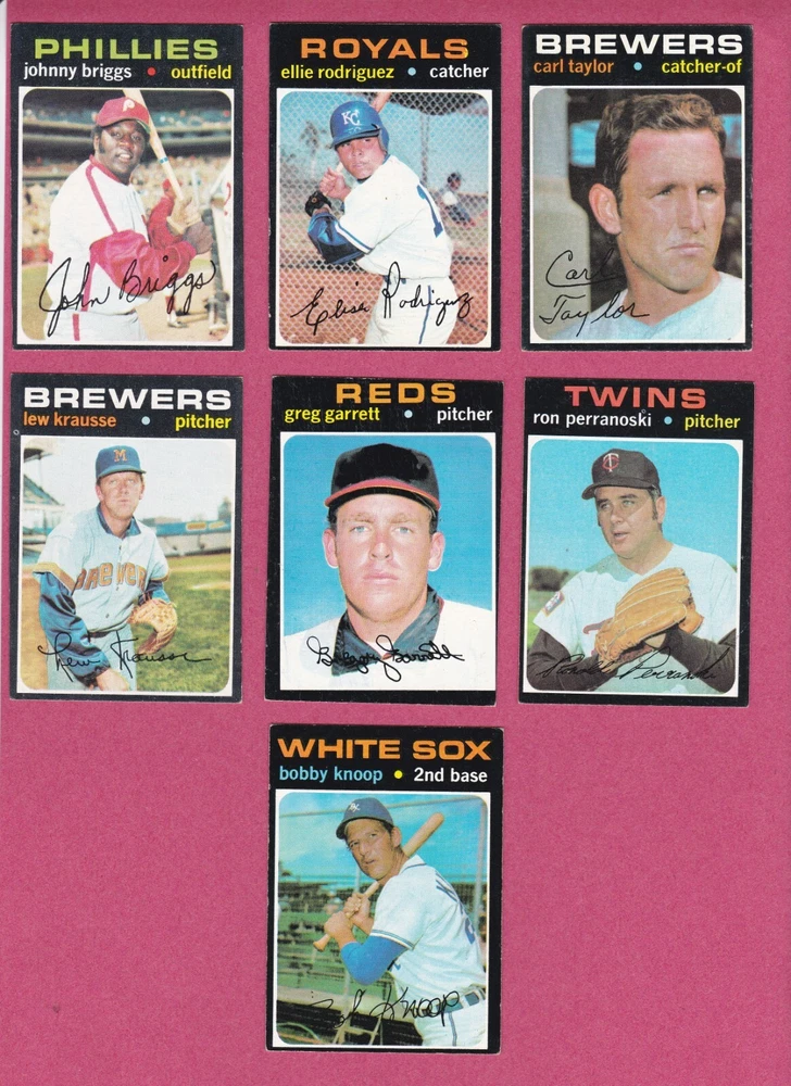1971 Topps baseball common cards in EX+ to EXMT condition. Photos are of the actual cards for sale. Backs are not shown in photos but there are no creases, bends or writing on either side of the cards. Cards #7 and #168 and #568 have a very small stain on the back. Shipping is $0.75 for the first card and $.25 per card for the 2nd and subsequent cards ordered. If you purchase more than one card in the same order, there is a 15% discount on all of your cards (85 cents each instead of $1 each).