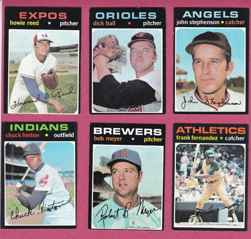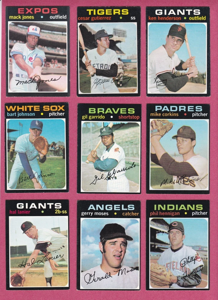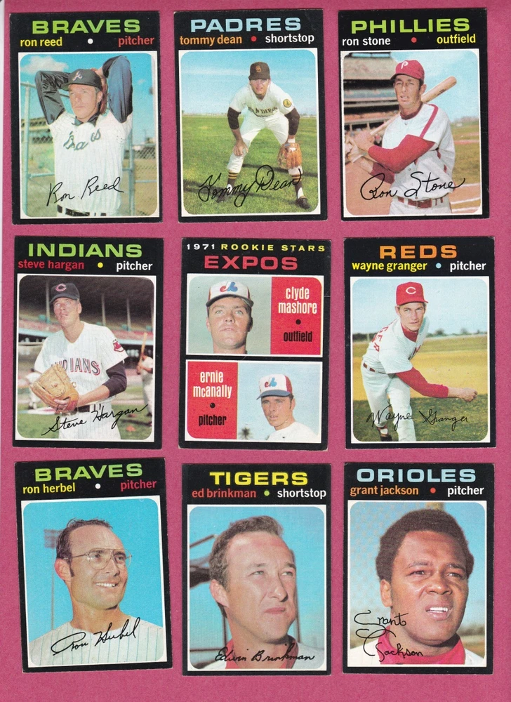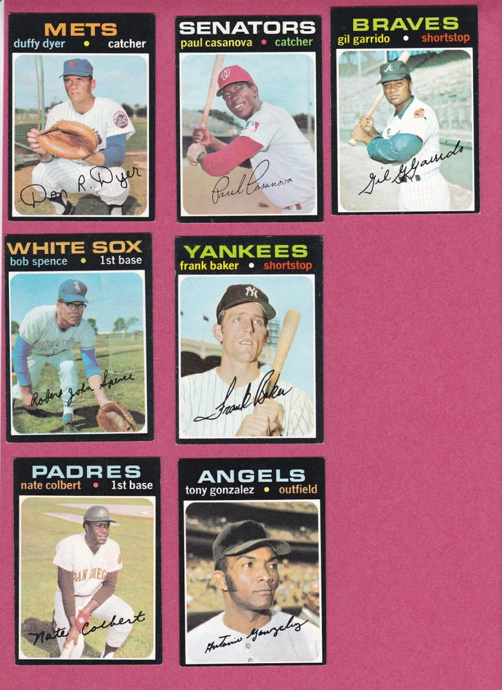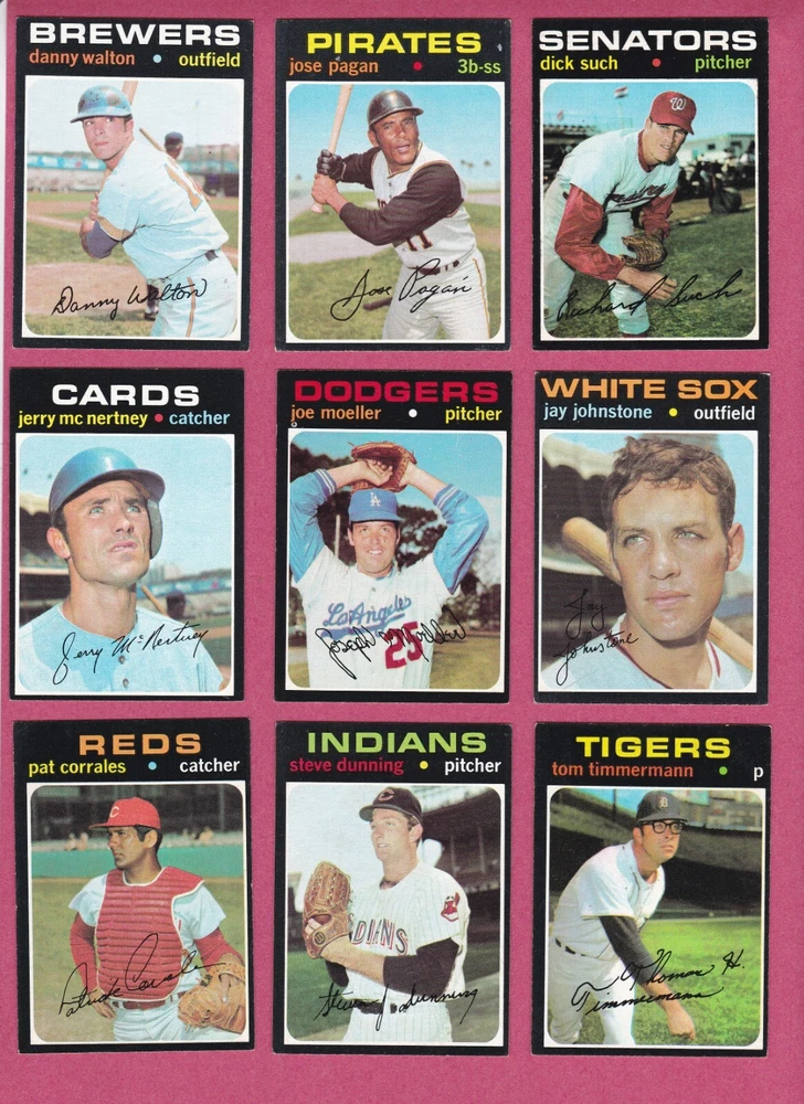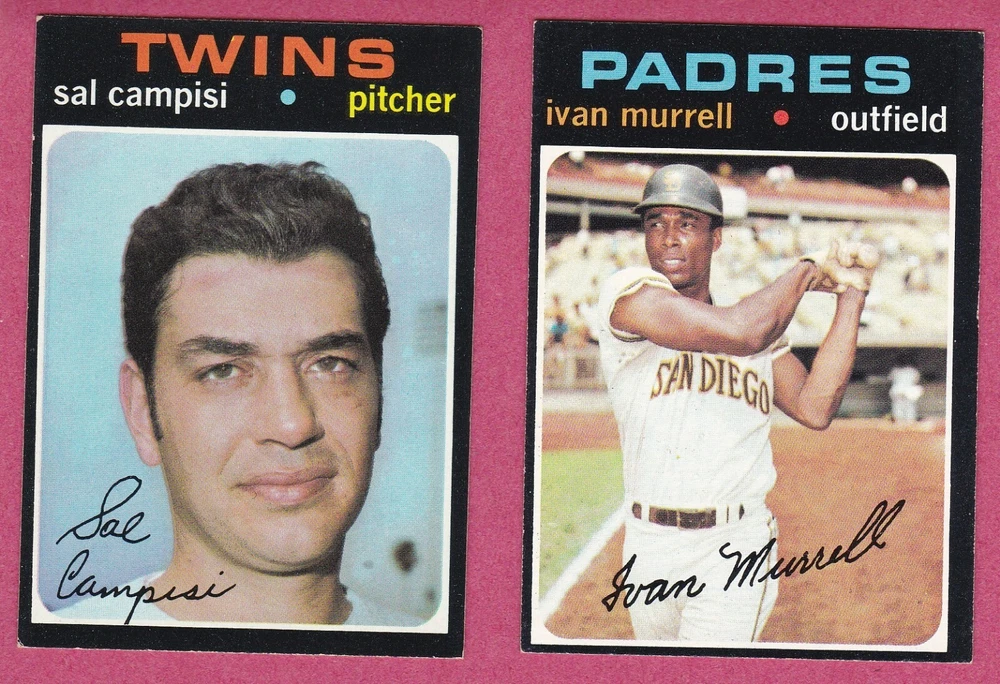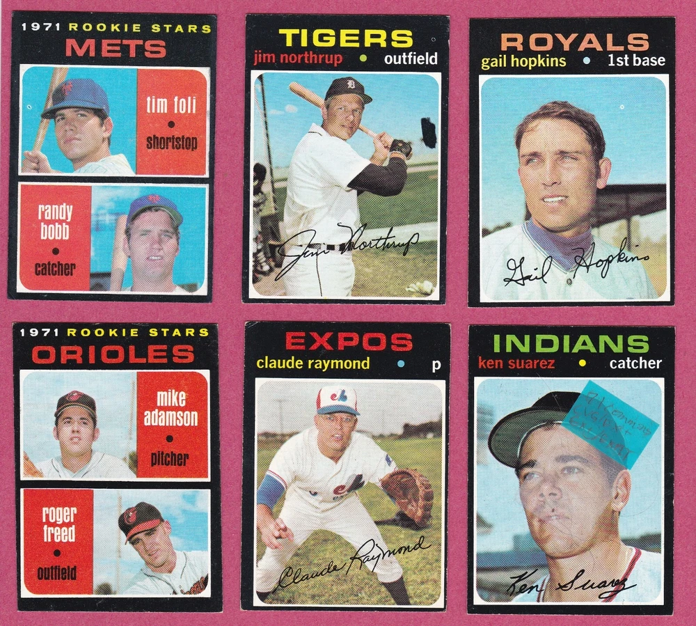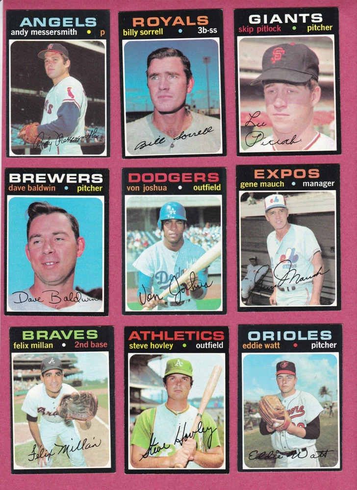 1971 Topps baseball common cards in EX+ to EXMT condition. Photos are of the actual cards for sale. Backs are not shown in photos but there are no creases, bends or writing on either side of the cards. Cards #7 and #168 and #568 have a very small stain on the back. Shipping is $0.75 for the first card and $.25 per card for the 2nd and subsequent cards ordered. If you purchase more than one card in the same order, there is a 15% discount on all of your cards (85 cents each instead of $1 each).