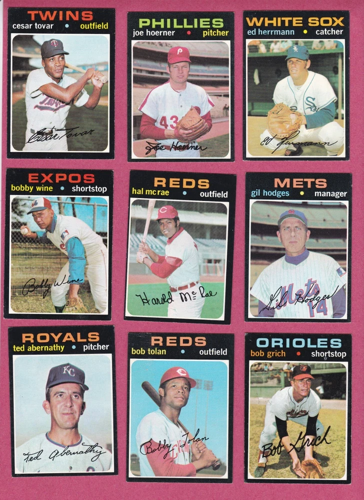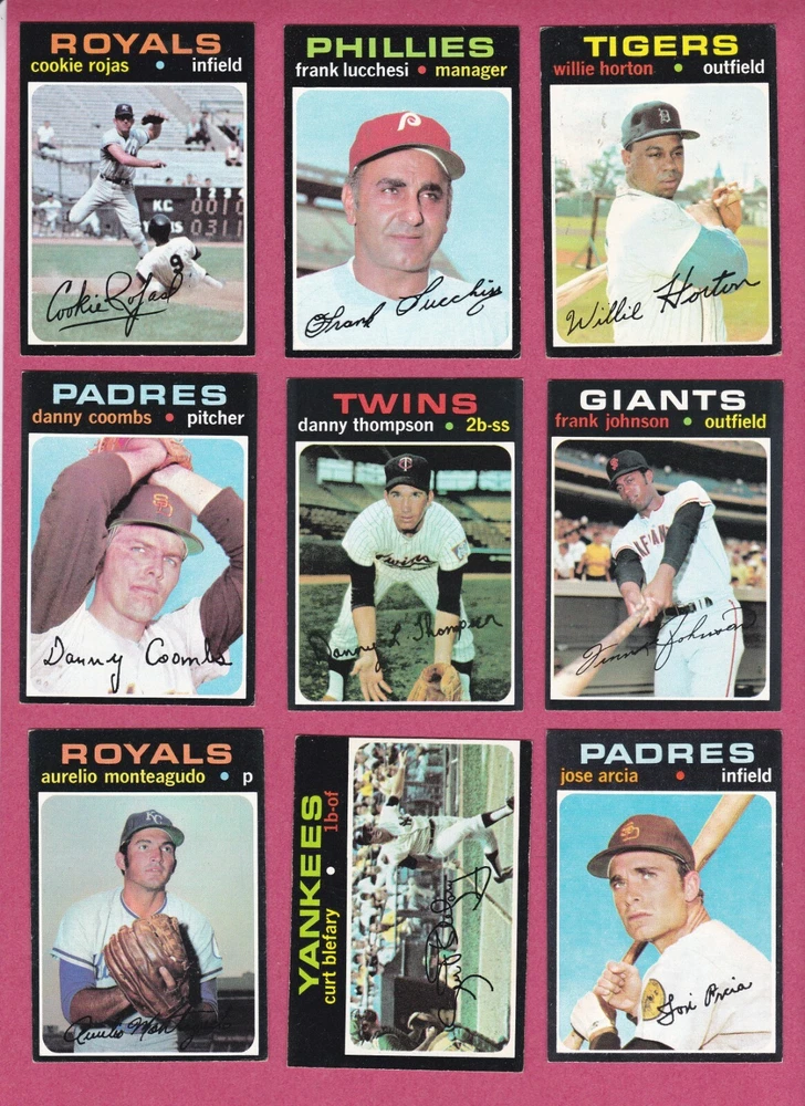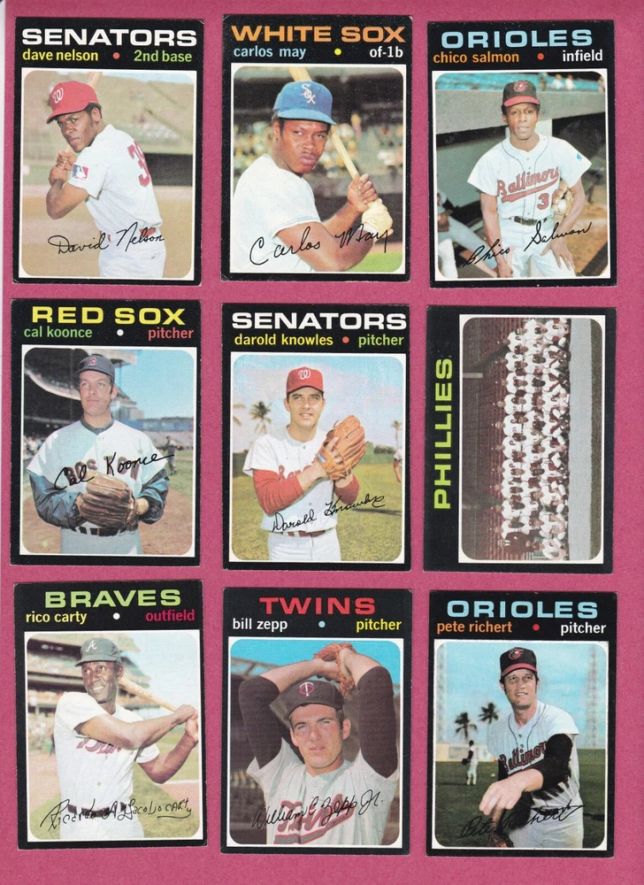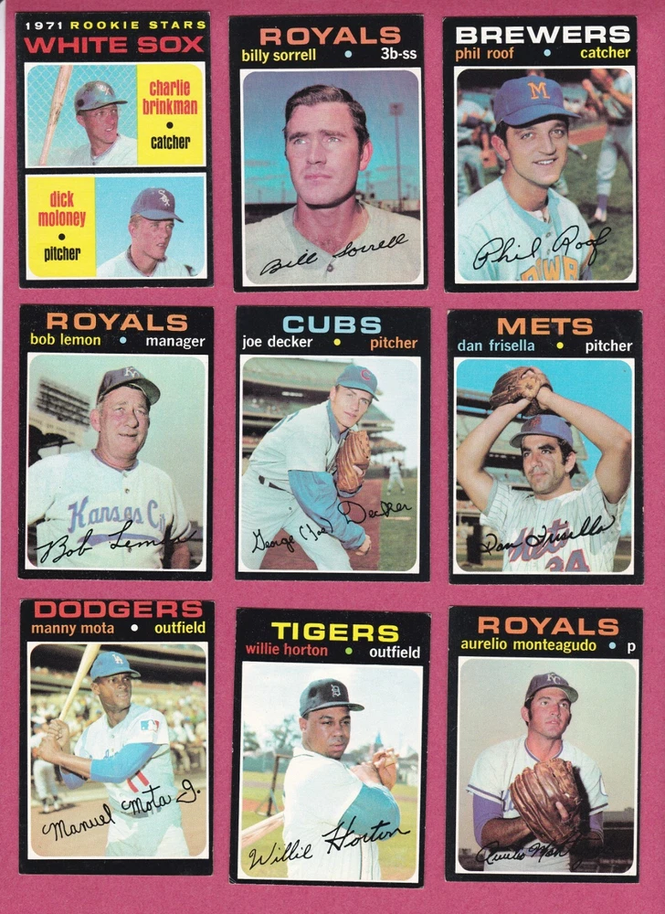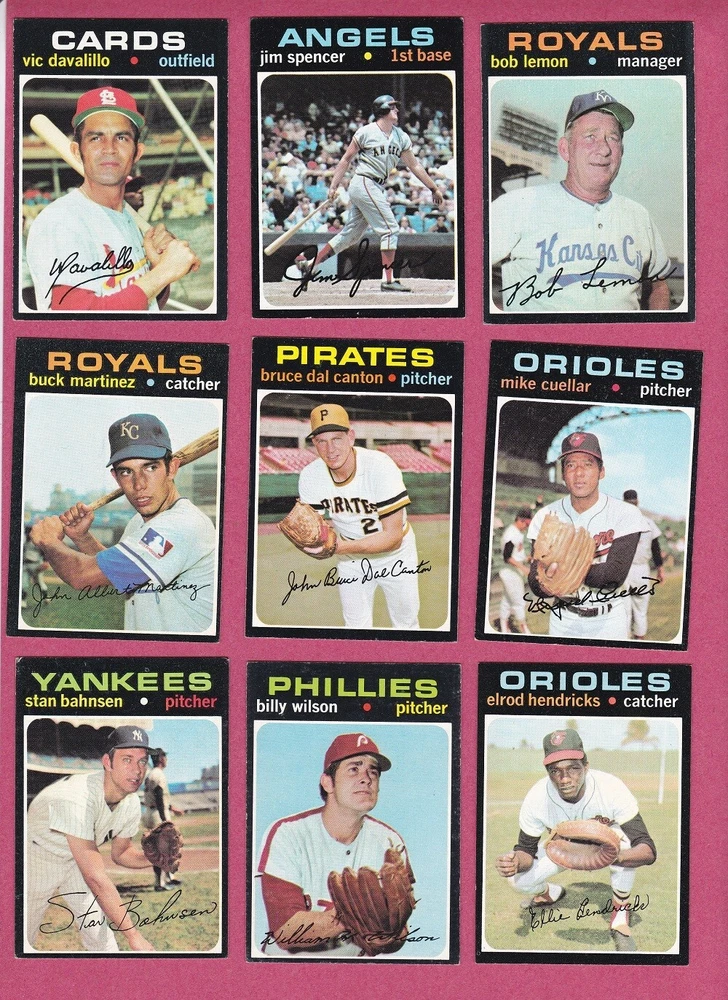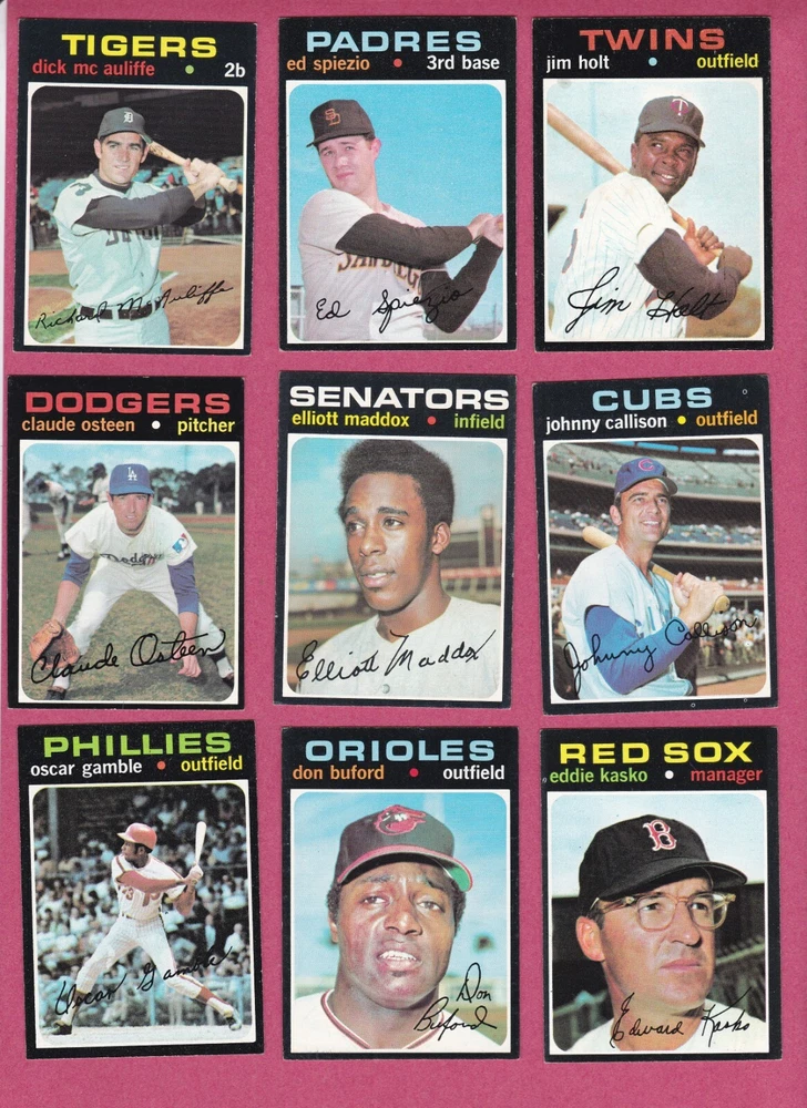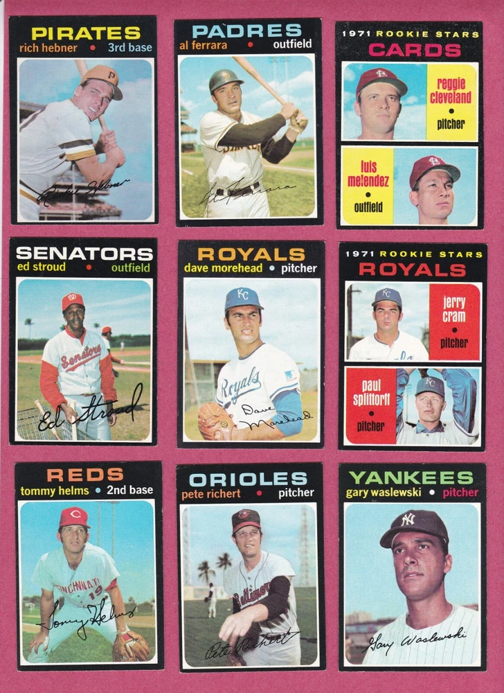 1971 Topps baseball common cards in EX+ to EXMT condition. Photos are of the actual cards for sale. Backs are not shown in photos but there are no creases, bends or writing on either side of the cards. Cards #7 and #168 and #568 have a very small stain on the back. Shipping is $0.75 for the first card and $.25 per card for the 2nd and subsequent cards ordered. If you purchase more than one card in the same order, there is a 15% discount on all of your cards (85 cents each instead of $1 each).