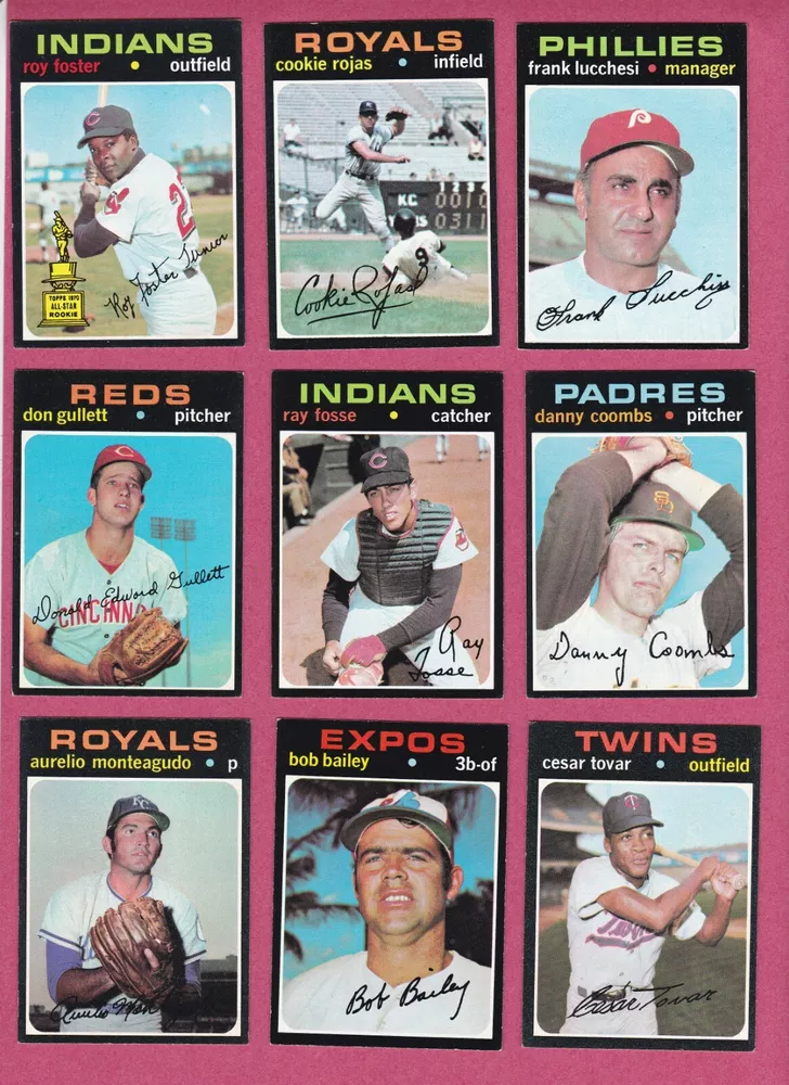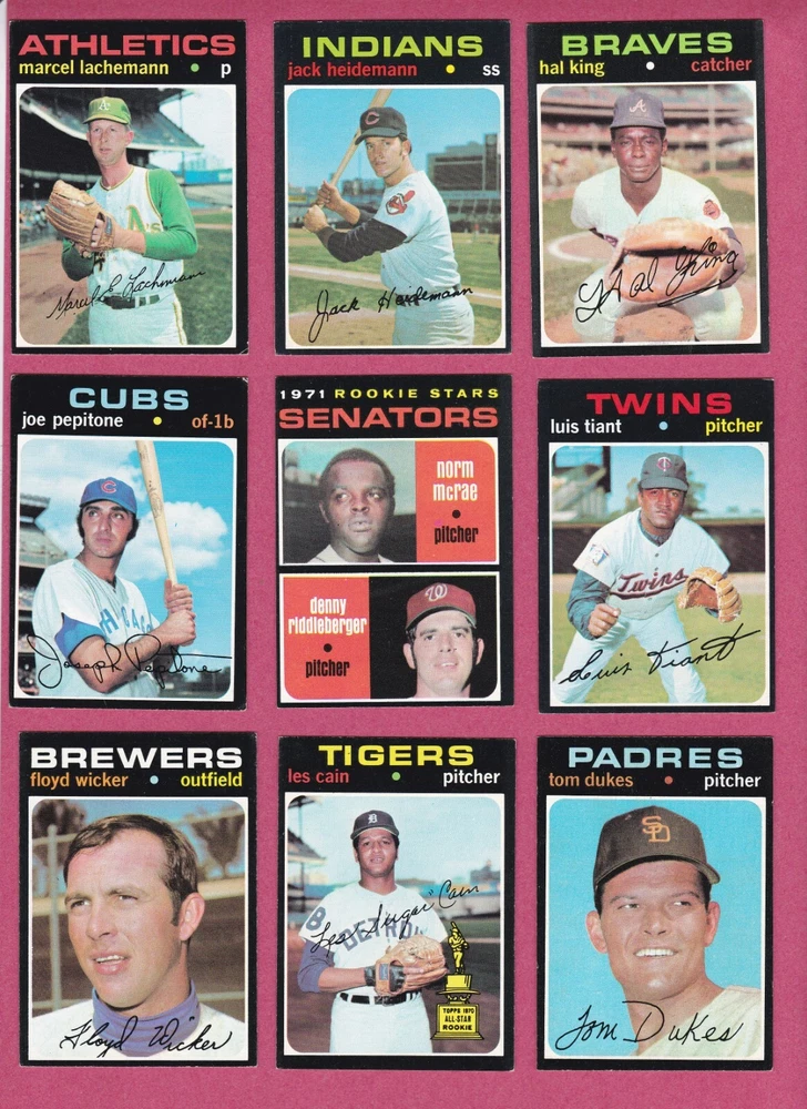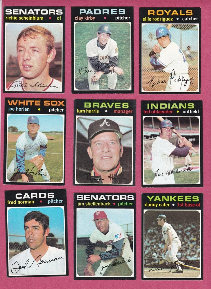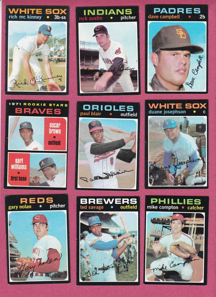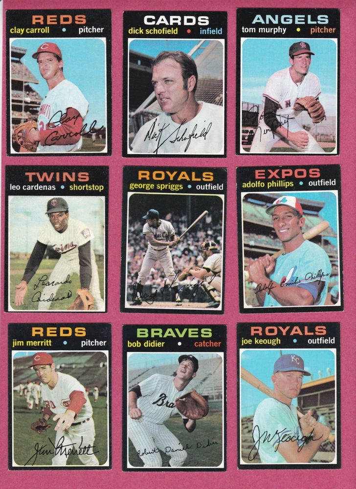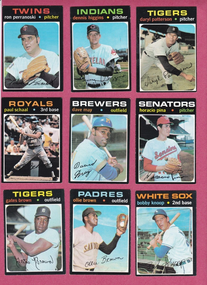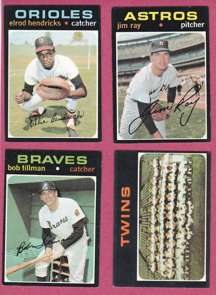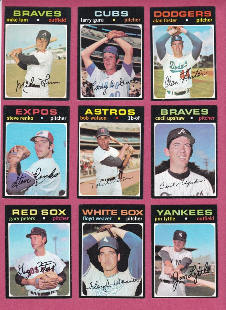 1971 Topps baseball common cards in EX+ to EXMT condition. Photos are of the actual cards for sale. Backs are not shown in photos but there are no creases, bends or writing on either side of the cards. Cards #7 and #168 and #568 have a very small stain on the back. Shipping is $0.75 for the first card and $.25 per card for the 2nd and subsequent cards ordered. If you purchase more than one card in the same order, there is a 15% discount on all of your cards (85 cents each instead of $1 each).