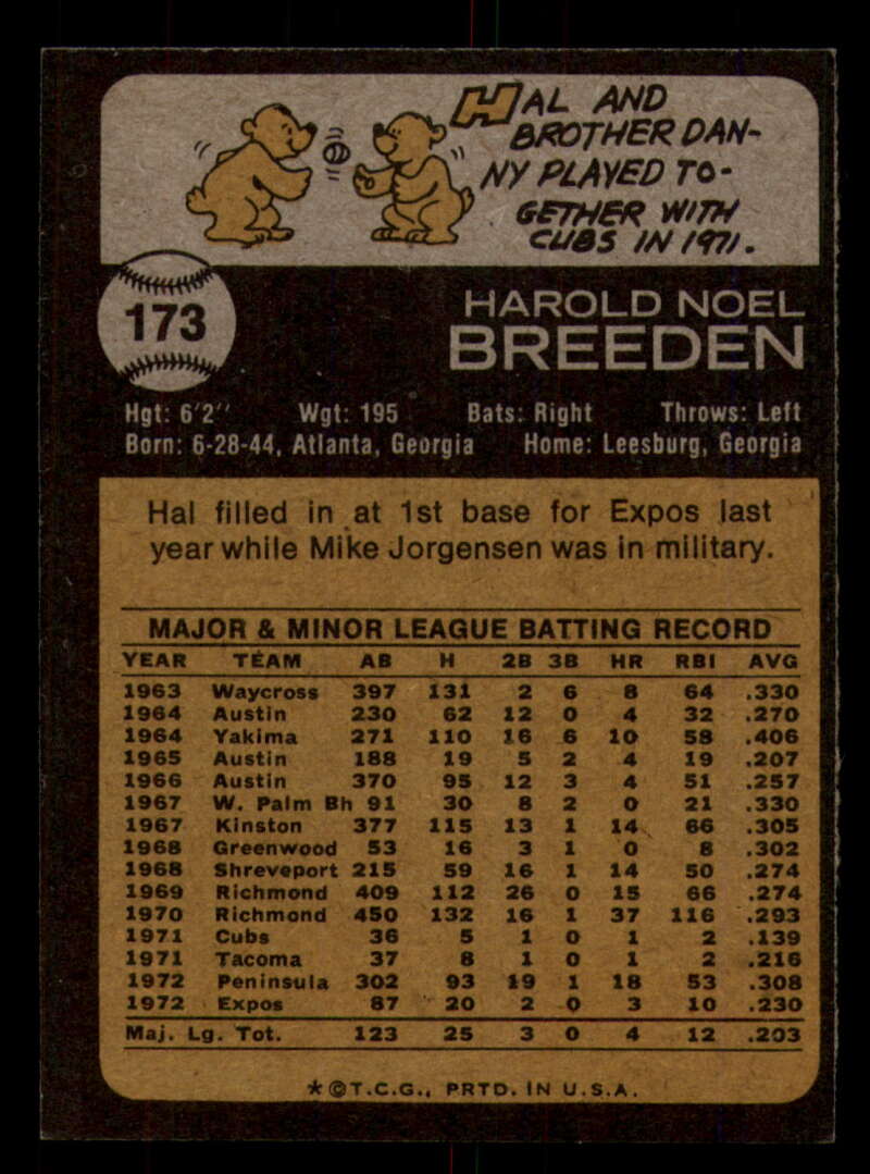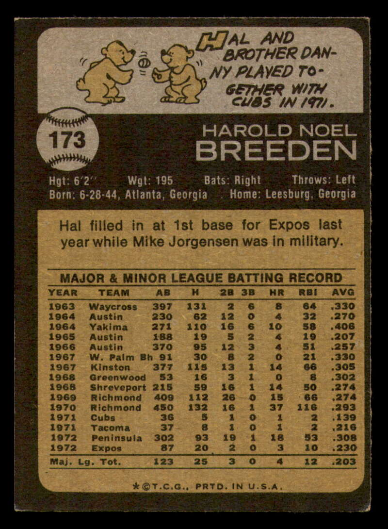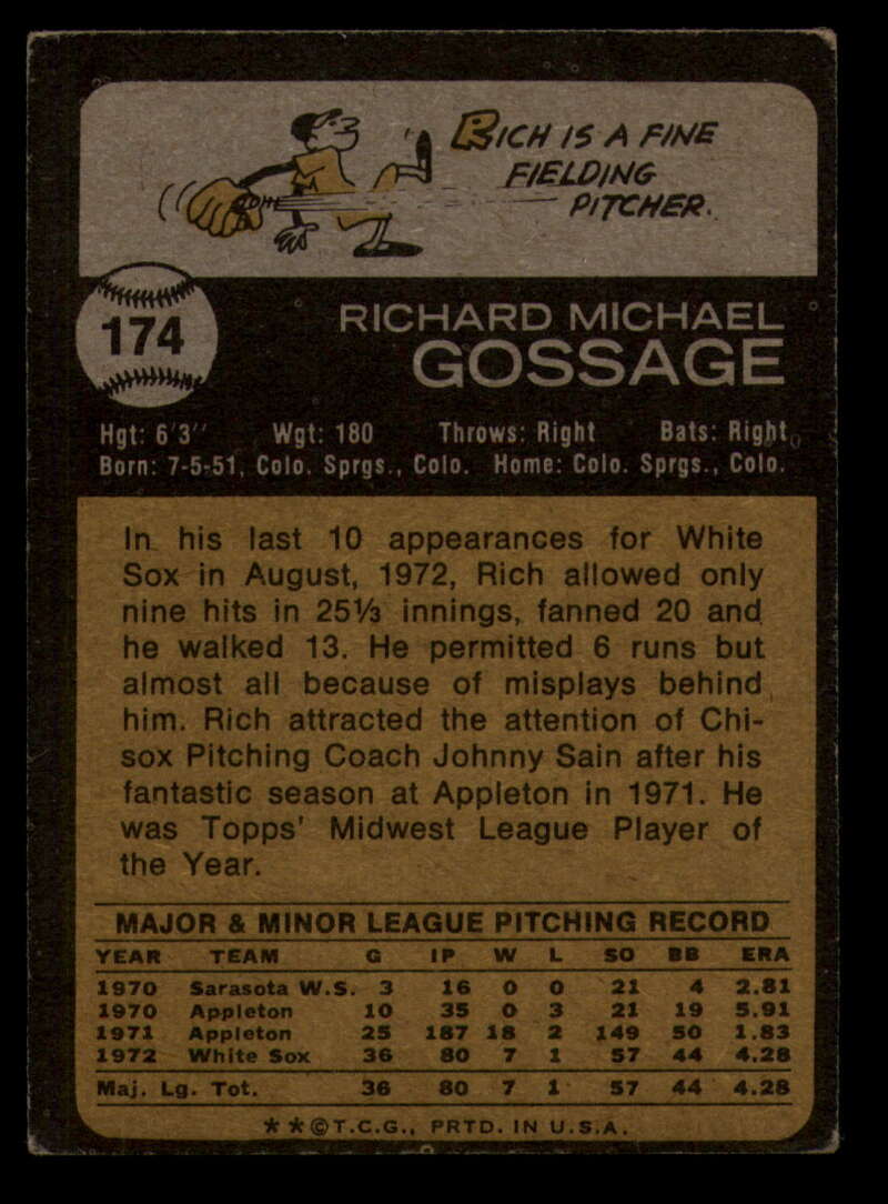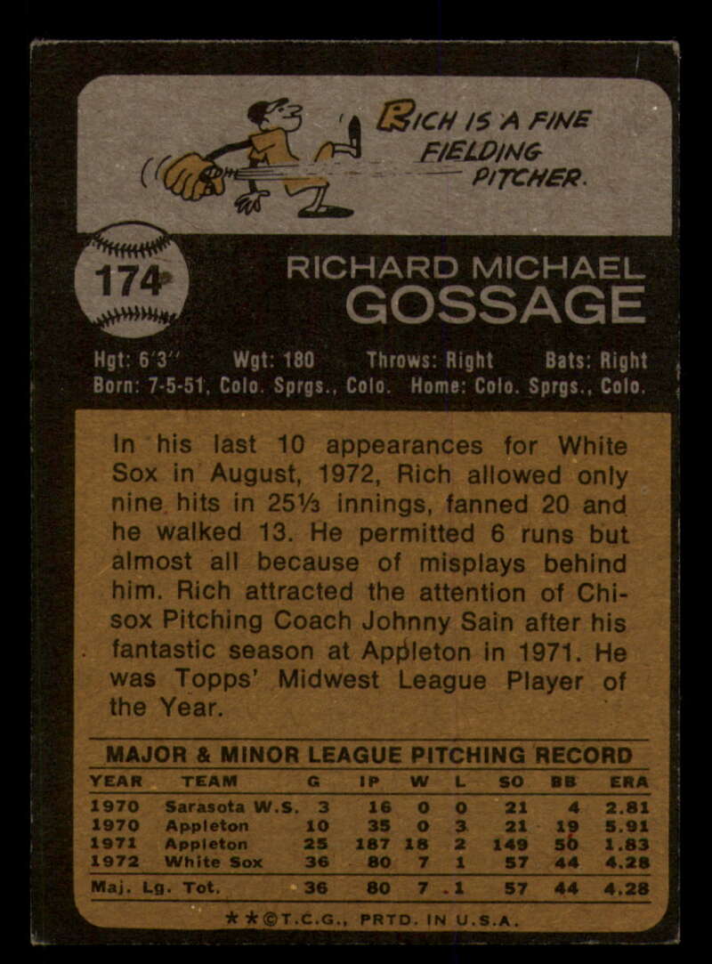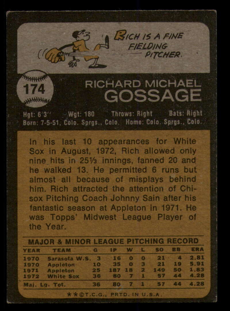 ALL MARTY'S STUFF The card in the scan is the card for sale. Each card has a high quality front and back scan of the item that you will receive. Please check the front and back pictures before buying. For combined shipping, please select all the cards that you would like from all of our many listings and have them in your shopping cart. We have a base shipping charge plus $0.05 for each additional card. Once you have made your selections, go to checkout and make one payment for the entire purchase. Multiple payments will result in multiple shipping charges. I f you have any questions, please ask . 1973 Topps Baseball #151 to #200 - Complete your set - Pick your card #151 Wes Parker G Good Dodgers #151 Wes Parker VG EX Very Good Exce Dodgers #151 Wes Parker creased Dodgers (2)#151 Wes Parker VG EX Very Good Exce Dodgers (3)#151 Wes Parker VG EX Very Good Exce Dodgers #152 Dave May EXNM oc Brewers #152 Dave May EX Excellent Brewers #152 Dave May VG Very Good Brewers #152 Dave May NM Near Mint Brewers #152 Dave May VG EX Very Good Exce Brewers #153 Al Hrabosky creased Cardinals #153 Al Hrabosky VG EX Very Good Exce Cardinals (2)#153 Al Hrabosky creased Cardinals (3)#153 Al Hrabosky creased Cardinals #153 Al Hrabosky Print spots Cardinals #154 Jeff Torborg NM Near Mint Angels #154 Jeff Torborg EX Excellent Angels #154 Jeff Torborg NM-MT Angels (2)#154 Jeff Torborg EX NM Angels #154 Jeff Torborg EX NM Angels #155 Sal Bando VG Very Good Athletics #155 Sal Bando VG EX Very Good Exce Athletics #155 Sal Bando creased Athletics #155 Sal Bando G VG Good Very Good Athletics (2)#155 Sal Bando VG Very Good Athletics (2)#156 Cesar Geronimo creased Reds #156 Cesar Geronimo G VG Good Very Good Reds #156 Cesar Geronimo EX NM Reds #156 Cesar Geronimo creased Reds #156 Cesar Geronimo creased Reds .. #157 Denny Riddleberger VG Very Good Indians #157 Denny Riddleberger EX+ oc Indians #157 Denny Riddleberger NMMT oc Indians (2)#157 Denny Riddleberger EX Excellent Indians #157 Denny Riddleberger EX Excellent Indians #158 Astros Team VG Very Good Astros #158 Astros Team VG EX Very Good Exce Astros (2)#158 Astros Team VG EX Very Good Exce Astros (2)#158 Astros Team EX Excellent Astros #158 Astros Team EX Excellent Astros #159 Cito Gaston VG EX Very Good Exce Padres #159 Cito Gaston EX Excellent Padres (2)#159 Cito Gaston VG EX Very Good Exce Padres (3)#159 Cito Gaston VG EX Very Good Exce Padres #159 Cito Gaston EX NM Padres #160 Jim Palmer Fair Orioles (2)#160 Jim Palmer Fair Orioles #160 Jim Palmer missing corner Orioles #160 Jim Palmer EX Excellent Orioles #160 Jim Palmer VG EX Very Good Exce Orioles #161 Ted Martinez VG EX Very Good Exce Mets #161 Ted Martinez EX Excellent Mets (2)#161 Ted Martinez EX Excellent Mets #161 Ted Martinez NM Near Mint Mets #161 Ted Martinez NM+ Mets #162 Pete Broberg VG EX Very Good Exce Rangers #162 Pete Broberg EX NM Rangers #162 Pete Broberg creased Rangers (2)#162 Pete Broberg VG EX Very Good Exce Rangers #162 Pete Broberg NM+ Rangers #163 Vic Davalillo NM Near Mint Pirates (2)#163 Vic Davalillo NM Near Mint Pirates (2)#163 Vic Davalillo EX Excellent Pirates #163 Vic Davalillo EX Excellent Pirates #163 Vic Davalillo VG EX Very Good Exce Pirates #164 Monty Montgomery creased Royals #164 Monty Montgomery EX NM Royals #164 Monty Montgomery VG EX Very Good Exce Royals (2)#164 Monty Montgomery EX Excellent Royals #164 Monty Montgomery EX Excellent Royals #165 Luis Aparicio NRMT-OC Red Sox (2)#165 Luis Aparicio NM Near Mint Red Sox #165 Luis Aparicio NM Near Mint Red Sox #165 Luis Aparicio VG EX Very Good Exce Red Sox (2)#165 Luis Aparicio VG EX Very Good Exce Red Sox #166 Terry Harmon EX Excellent Phillies #166 Terry Harmon miscut back Phillies #166 Terry Harmon VG EX Very Good Exce Phillies #166 Terry Harmon EX NM Phillies #166 Terry Harmon NM Near Mint Phillies #167 Steve Stone EX Excellent Giants (2)#167 Steve Stone EX NM Giants (2)#167 Steve Stone VG EX Very Good Exce Giants #167 Steve Stone EX NM Giants #167 Steve Stone VG EX Very Good Exce Giants #168 Jim Northrup NM Near Mint Tigers .. (2)#168 Jim Northrup NM Near Mint Tigers #168 Jim Northrup EX NM Tigers #168 Jim Northrup VG EX Very Good Exce Tigers #168 Jim Northrup NM Near Mint Tigers #169 Ron Schueler NM Near Mint Braves #169 Ron Schueler NM Near Mint Braves .. #169 Ron Schueler EX++ Excellent++ Braves #169 Ron Schueler EX NM Braves #169 Ron Schueler NM+ Braves #170 Harmon Killebrew creased Twins #170 Harmon Killebrew EX Excellent Twins #170 Harmon Killebrew EX NM Twins #170 Harmon Killebrew VG EX Very Good Exce Twins #170 Harmon Killebrew creased Twins .. #171 Bernie Carbo VG EX Very Good Exce Cardinals #171 Bernie Carbo EX Excellent Cardinals #171 Bernie Carbo G Good Cardinals (2)#171 Bernie Carbo VG EX Very Good Exce Cardinal #171 Bernie Carbo off-centered Cardinals #172 Steve Kline EX Excellent Yankees #172 Steve Kline EX+ oc Yankees #172 Steve Kline NM Near Mint Yankees #172 Steve Kline VG EX Very Good Exce Yankees (2)#172 Steve Kline VG EX Very Good Exce Yankees #173 Hal Breeden EX NM Expos #173 Hal Breeden NM Near Mint Expos #173 Hal Breeden EX Excellent Expos #173 Hal Breeden VG EX Very Good Exce Expos #173 Hal Breeden off-centered Expos #174 Rich Gossage VG EX Very Good Exce White Sox #174 Rich Gossage EX Excellent White Sox #174 Rich Gossage off-centered White Sox #174 Rich Gossage VG Very Good White Sox #174 Rich Gossage NRMT-OC White Sox #174 Rich Gossage miscut back White Sox #175 Frank Robinson creased Angels #175 Frank Robinson off-centered Angels #175 Frank Robinson miscut Angels #175 Frank Robinson EX+ Angels #175 Frank Robinson EX+ oc Angels #176 Chuck Taylor NM Near Mint Brewers #176 Chuck Taylor EX NM Brewers (2)#176 Chuck Taylor NM Near Mint Brewers #176 Chuck Taylor VG EX Very Good Exce Brewers #176 Chuck Taylor NRMT oc Brewers (2)#177 Bill Plummer EX Excellent Reds #177 Bill Plummer EX NM Reds #177 Bill Plummer VG EX Very Good Exce Reds #177 Bill Plummer creased Reds #177 Bill Plummer EX Excellent