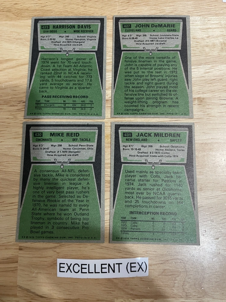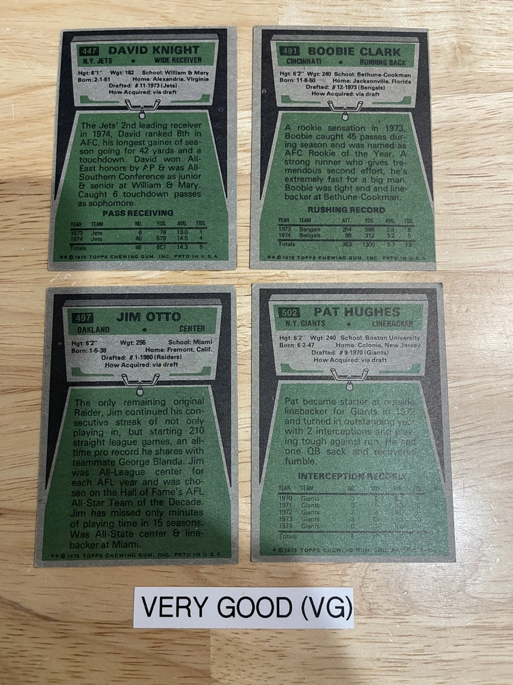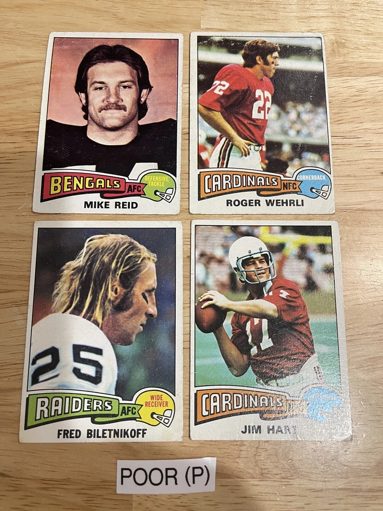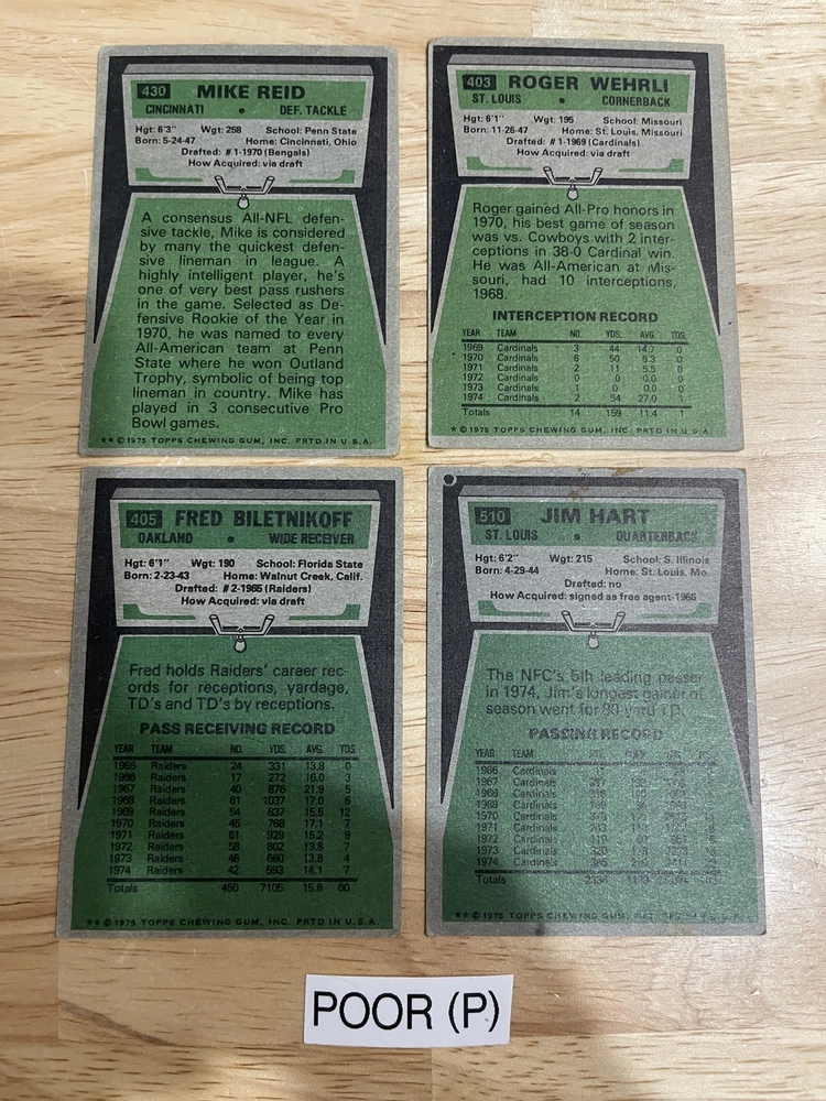 Complete Your Card Set 1975 Topps Football Cards 1-150 (P-NM) - You Pick - Complete Your Set Description 1975 Topps Football Cards 1-150 (P-NM) - You Pick - Complete Your Set Choose the cards from this listing to complete your set. Please see destails below about card conditions, discounts, combined shipping, packaging, and tracking. Cards available in this set include: Cards available in this set include: Base Cards Please see the separate listing(s) for the other cards in this same set: 1975 Topps Football Cards 1-150 (P-NM) - You Pick - Complete Your Set 1975 Topps Football Cards 151-275 (P-NM) - You Pick - Complete Your Set 1975 Topps Football Cards 276-400 (P-NM) - You Pick - Complete Your Set 1975 Topps Football Cards 401-528 (P-NM) - You Pick - Complete Your Set Visit my eBay store to see other sets: Complete Your Card Sets | eBay Stores Discounts Volume Priceing 2 cards - 5% off both 3 cards - 10% off all 3 4+ cards - 15% off all of my "complete your set" listing cards in the cart. Combined Shipping $0.69 cents for the first card and .15 cents for each additional card $5.00 max shipping per order for "complete your set" listings Conditions I have categorized the cards according to the eBay card condition guide so you have a good idea of the condition of each card. The condition is added to the end of each card name and I usually grade more stringent that the condition guide outlines. If more than one card with the same condition specified is available, I will select the best conditioned card for you. NM +: Near Mint or Better Minor issues on corners or edges if any EX : Excellent Excellent shape with some imperfections 1-3 corners may have dings May have minor wrinkle (not usually) but no creases VG : Very Good 3-4 corners are bent or rounded Rarely have 1 wrinkle or crease that doesn’t cross the entire face of the card. No staining or very little (not often) on front or back of card No tears, significantly damaged surfaces, or pen writings on them P : Poor Corners are bent or rounded May have 1 or more wrinkles or creases May have some sort of staining on the front or back of card PM : Poor w/ pen or pencil markings Some sort of pen or pencil marking on the card Typically, the number on the back is crossed out or highlighted Checklists that have boxes checked Examples : See the pictures on the listing for examples that show a good representation of the general conditions. Packaging Your cards will be well protected guaranteed! All cards are packaged in penny sleeves, placed in top loader hard sleeves, and wrapped in a team bag. Orders of 14 cards or less and under $20 will be safely packaged and shipped in a plain white envelope Orders of 15+ cards will be safely packaged in a bubble envelope Shipping Cards will be packaged and shipped the same or next business day. All orders will ship using " eBay Standard Envelope " or " USPS Ground Advantage " Orders under $20 with 14 cards or less will ship in a plain envelope using "eBay Standard Envelope" which includes eBay Tracking Orders over $20 OR include 15+ cards will be packaged in a bubble envelope and shipped using "USPS Ground Advantage" which includes regular USPS Tracking. Tracking NOTE : Cards shipped with the "eBay Standard Envelope" tracking are scanned and the tracking is marked as "Delivered" when they arrive at the destination post office. It will take a couple additional days BEFORE the cards arrive at the your address. Please contact if you are experiencing delays longer than expected.