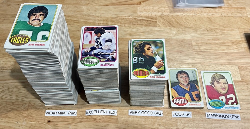 Complete Your Card Set 1976 Topps Football Cards 101-200 (P-NM) - You Pick - Complete Your Set Description 1976 Topps Football Cards 101-200 (P-NM) - You Pick - Complete Your Set Choose the cards from this listing to complete your set. Cards available in this set include: Cards available in this set include: Please see the separate listing(s) for the other cards in this same set: 1976 Topps Football Cards 1-100 (P-NM) - You Pick - Complete Your Set 1976 Topps Football Cards 101-200 (P-NM) - You Pick - Complete Your Set 1976 Topps Football Cards 201-300 (P-NM) - You Pick - Complete Your Set 1976 Topps Football Cards 301-400 (P-NM) - You Pick - Complete Your Set 1976 Topps Football Cards 401-528 (P-NM) - You Pick - Complete Your Set Visit my eBay store to see other sets: Complete Your Card Sets | eBay Stores Discounts Volume Priceing 2 cards - 10% off both 3 cards - 15% off all 3 4+ cards - 20% off all of my "complete your set" listing cards in the cart. Combined Shipping $0.69 cents for the first card and .15 cents for each additional card $5.00 max shipping per order for "complete your set" listings Conditions I have categorized the cards according to the eBay card condition guide so you have a good idea of the condition of each card. The condition is added to the end of each card name and I usually grade more stringent that the condition guide outlines. If more than one card with the same condition specified is available, I will select the best conditioned card for you. NM +: Near Mint or Better Minor issues on corners or edges if any EX : Excellent Excellent shape with some imperfections 1-3 corners may have dings May have minor wrinkle (not usually) but no creases VG : Very Good 3-4 corners are bent or rounded Rarely have 1 wrinkle or crease that doesn’t cross the entire face of the card. No staining or very little (not often) on front or back of card No tears, significantly damaged surfaces, or pen writings on them P : Poor Corners are bent or rounded May have 1 or more wrinkles or creases May have some sort of staining on the front or back of card PM : Poor w/ pen or pencil markings Some sort of pen or pencil marking on the card Typically, the number on the back is crossed out or highlighted Checklists that have boxes checked Examples : See the pictures on the listing for examples that show a good representation of the general conditions. Packaging Your cards will be well protected guaranteed! All cards are packaged in penny sleeves, placed in top loader hard sleeves, and wrapped in a team bag. Orders of 14 cards or less and under $20 will be safely packaged and shipped in a plain white envelope Orders of 15+ cards will be safely packaged in a bubble envelope Shipping Cards will be packaged and shipped the same or next business day. All orders will ship using " eBay Standard Envelope " or " USPS Ground Advantage " Orders under $20 with 14 cards or less will ship in a plain envelope using "eBay Standard Envelope" which includes eBay Tracking Orders over $20 OR include 15+ cards will be packaged in a bubble envelope and shipped using "USPS Ground Advantage" which includes regular USPS Tracking. Tracking NOTE : Cards shipped with the "eBay Standard Envelope" tracking are scanned and the tracking is marked as "Delivered" when they arrive at the destination post office. It will take a couple additional days BEFORE the cards arrive at the your address. Please contact if you are experiencing delays longer than expected.