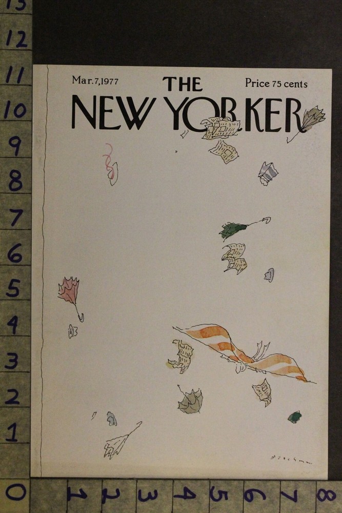 <p> <p> <p>1977 NEW YORKER VINTAGE ART COVER BLECHMAN SEASON DREAM HUMOR WIND NYO42<p> DESCRIPTION OF ITEM - AN ORIGINAL ILLUSTRATED COVER (cover only) FROM VINTAGE NEW YORKER PERIODICAL... COVER IS BEING SOLD AS IS WITH ALL FAULTS AS SEEN IN PHOTO(S). IMAGE SIZE - PLEASE SEE THE PHOTO AND USE MEASUREMENTS ON EDGES. DATE OF ORIGINAL COVER - SEE TITLE THE COLLECTING OF MAGAZINE COVER ART IS INTRIGUING IN THE SENSE OF "THE FIND" AND ALSO "THE BRAG"... BEING IN EVERY SENSE OF THE WORD - EPHEMERAL, MOST MAGAZINES WHERE NOT INTENDED FOR LONG TERM SURVIVAL. STARTING WITH THE FIRST MAG (ie: The Gentleman's Magazine, first published in 1731 , in London,considered to have been the first general-interest magazine) MOST WERE READ, + REREAD AS THEY WERE PASSED ALONG BUT EVENTUALLY MOST WOULD END UP IN THE TRASH OR THE SCRAP PAPER BUYERS CART... AND SO THE ENJOYMENT OF COLLECTION MAGAZINES AND THEIR SUPERLATIVE COVER ART BEGAN. WARS, HATE MONGERS, BOOK BINDERS, SCRAP DRIVES, RODENTS, MOLD AND FIRE HAVE TAKEN THEIR TOLL UPON SURVIVAL... ALONG WITH FLOODS, TORNADOES AND OTHER NATURAL DISASTERS WHICH CONTINUALLY REDUCE THE AVAILABLE NUMBER OF COLLECTIBLE COVERS TO ENJOY, PURCHASE AND SHOW OFF.. AS WITH ALL EPHEMERA - CONDITION SCARCITY, CONDITION, DESIRABILITY, CONDITION, AND.... DID I MENTION ... CONDITION... ARE THE PRIME FACTORS INVOLVED IN PRICE.. PERFECT COVER ARE IS RARE --- AND PRICED ACCORDINGLY ! MOST COVERS PRIOR TO 1880 WERE PRINTED ON ACID FREE PAPER... AFTER THAT PAPER QUALITY CONTINUES TO DECLINE.. IT IS ALWAYS BEST TO USED ACID - FREE STORAGE + MOUNTING PRACTICES IN COLLECTING MAG COVERS.. Cover art it is either an artwork as illustration or photograph on the outside of a published product such as a book (often on a dust jacket ), magazine , comic book , ......... ). The art has a primarily commercial function, i.e. to promote the product it is displayed on, but can also have an aesthetic function, and may be artistically connected to the product, such as with art by the creator of the product. The New Yorker is an American weekly magazine featuring journalism , commentary, criticism, essays, fiction, satire, cartoons, and poetry. Started as a weekly in 1925, the magazine is now published 47 times annually, with five of these issues covering two-week spans. The New Yorker has a wide audience and is read internationally. It is well known for its illustrated and often topical covers BY SOME OF THE BEST ARTISTS OF THE TIME PERIOD.... The New Yorker was founded by Harold Ross and his wife Jane Grant , a New York Times reporter, and debuted on February 21, 1925. Ross wanted to create a sophisticated humor magazine that would be different from perceivably "corny" humor publications such as Judge , where he had worked, or the old Life . The New Yorker is one of the last few periodicals to continue using artistically wonderful design covers. MOST COVER ART COLLECTORS PURCHASE WITH THE VIEW OF COLLECTING PER PERIODICAL NAME, ARTIST, STYLE, SUBJECT MATTER, OR DATE... OUR LISTINGS THUS STRIVE TO USE IN THE TITLE THESE SEARCHABLE PARAMETERS We ship in .... CUSTOM MAILER TUBES..... WE SHIP COVERS ROLLED + PROTECTED BY PLASTIC BAG For multiple purchases ..... please wait for our invoice... OTHERWISE WE CANNOT DISCOUNT THE SHIPPING COST......THANKS. We ask that payment be made within 3 days or to notify us via email otherwise. We send out reminder payment emails once and then proceed with unpaid item report on the 7th day. We carry thru with reporting and neg feedback if auction is not completed. We pride ourselves on quality product, service and shipping. Powered by SixBit's eCommerce Solution