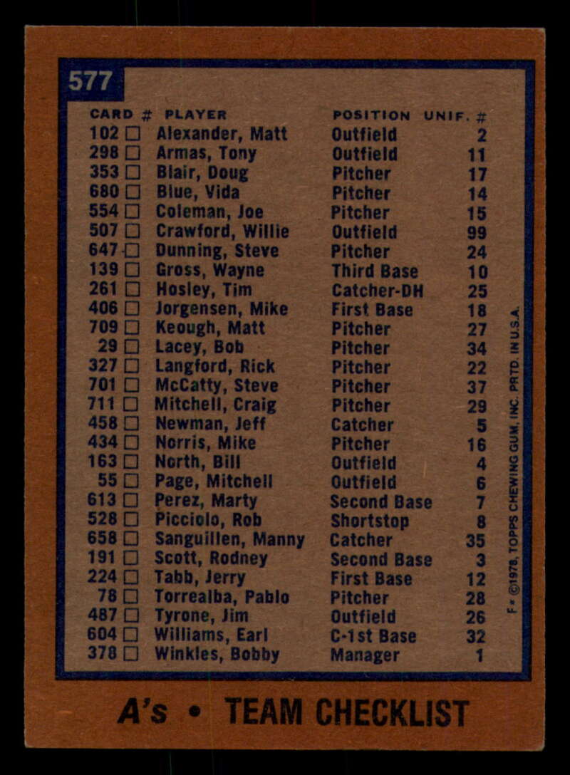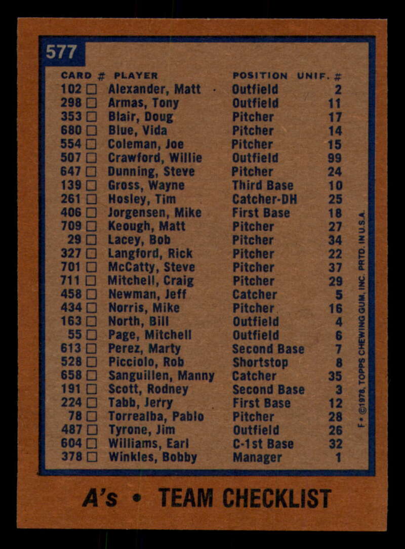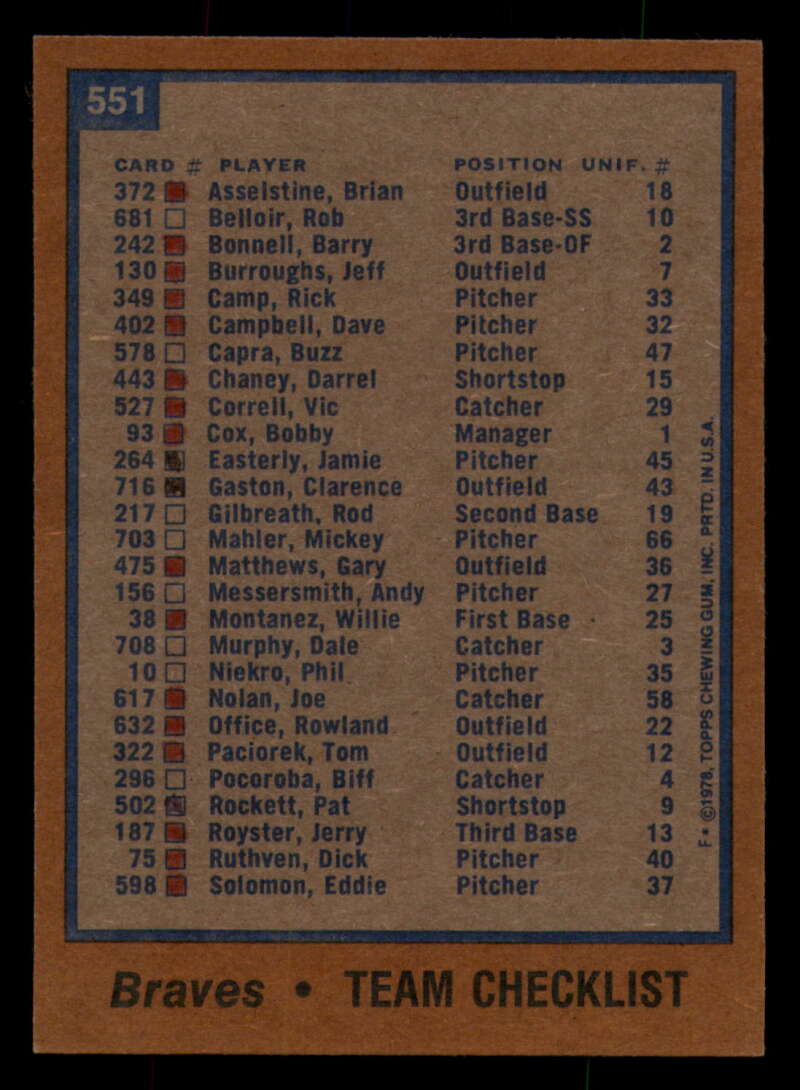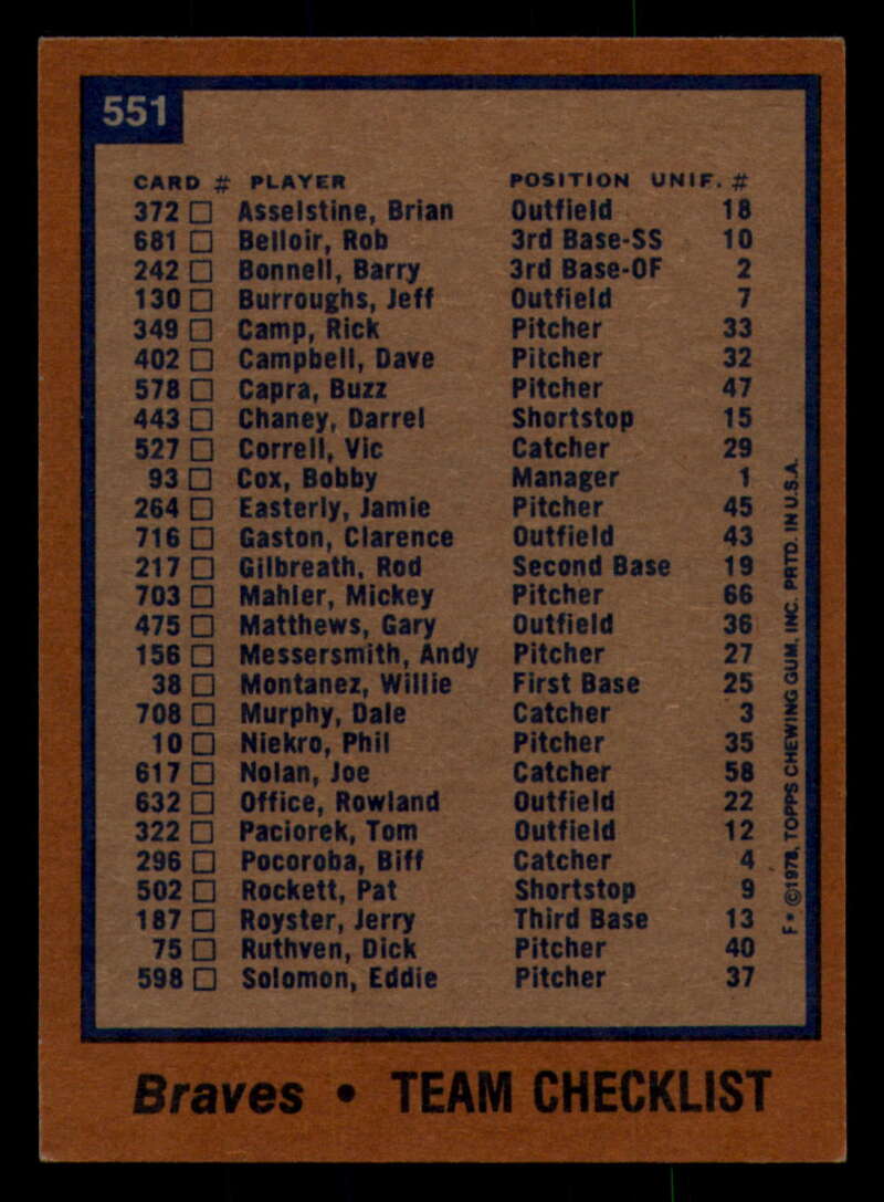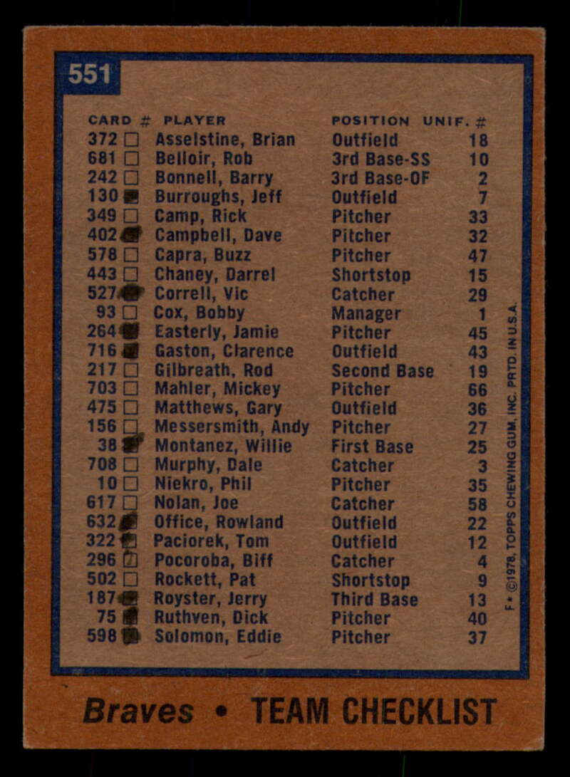 ALL MARTY'S STUFF The card in the scan is the card for sale. Each card has a high quality front and back scan of the item that you will receive. Please check the front and back pictures before buying. For combined shipping, please select all the cards that you would like from all of our many listings and have them in your shopping cart. We have a base shipping charge plus $0.05 for each additional card. Once you have made your selections, go to checkout and make one payment for the entire purchase. Multiple payments will result in multiple shipping charges. I f you have any questions, please ask . 1978 Topps Baseball #551 - #600 - Complete your set - Pick your card #551 Braves Team creased Braves #551 Braves Team EX NM Braves #551 Braves Team marked Braves (2)#551 Braves Team marked Braves #551 Braves Team VG EX Very Good Exce Braves #552 Francisco Barrios EX Excellent White Sox (2)#552 Francisco Barrios EX Excellent White Sox #552 Francisco Barrios EX++ Excellent++ White Sox #552 Francisco Barrios NM Near Mint White Sox (2)#552 Francisco Barrios NM Near Mint White Sox #553 Terry Puhl EX Excellent Astros (2)#553 Terry Puhl EX Excellent Astros #553 Terry Puhl NM Near Mint Astros (2)#553 Terry Puhl NM Near Mint Astros (3)#553 Terry Puhl NM Near Mint Astros #554 Joe Coleman EX Excellent Athletics (2)#554 Joe Coleman EX Excellent Athletics (3)#554 Joe Coleman EX Excellent Athletics (4)#554 Joe Coleman EX Excellent Athletics #554 Joe Coleman NM Near Mint Athletics #555 Butch Wynegar EX Excellent Twins (2)#555 Butch Wynegar EX Excellent Twins #555 Butch Wynegar EX++ Excellent++ Twins (2)#555 Butch Wynegar EX++ Excellent++ Twins #555 Butch Wynegar NM Near Mint Twins #556 Ed Armbrister EX Excellent Reds #556 Ed Armbrister NRMT oc Reds #556 Ed Armbrister NRMT-OC Reds #556 Ed Armbrister VG Very Good Reds #557 Tony Solaita NM Near Mint Angels (2)#557 Tony Solaita NM Near Mint Angels (3)#557 Tony Solaita NM Near Mint Angels (4)#557 Tony Solaita NM Near Mint Angels (5)#557 Tony Solaita NM Near Mint Angels #558 Paul Mitchell EX Excellent Mariners #558 Paul Mitchell NM Near Mint Mariners (2)#558 Paul Mitchell NM Near Mint Mariners #558 Paul Mitchell VG Very Good Mariners #558 Paul Mitchell VG EX Very Good Exce Mariners #559 Phil Mankowski EX Excellent Tigers (2)#559 Phil Mankowski EX Excellent Tigers #559 Phil Mankowski NM Near Mint Tigers (2)#559 Phil Mankowski NM Near Mint Tigers (3)#559 Phil Mankowski NM Near Mint Tigers #560 Dave Parker creased Pirates #560 Dave Parker EX Excellent Pirates #560 Dave Parker scratched Pirates #560 Dave Parker stain Pirates #560 Dave Parker VG EX Very Good Exce Pirates #561 Charlie Williams NM Near Mint Giants (2)#561 Charlie Williams NM Near Mint Giants (3)#561 Charlie Williams NM Near Mint Giants #561 Charlie Williams NRMT-OC Giants #561 Charlie Williams VG EX Very Good Exce Giants #562 Glenn Burke EX Excellent Dodgers (2)#562 Glenn Burke EX Excellent Dodgers (3)#562 Glenn Burke EX Excellent Dodgers #562 Glenn Burke NM Near Mint Dodgers #562 Glenn Burke VG EX Very Good Exce Dodgers #563 Dave Rader EX Excellent Cardinals #563 Dave Rader NM Near Mint Cardinals (2)#563 Dave Rader NM Near Mint Cardinals #563 Dave Rader VG Very Good Cardinals #563 Dave Rader VG EX Very Good Exce Cardinals #564 Mick Kelleher EX Excellent Cubs #564 Mick Kelleher NM Near Mint Cubs (2)#564 Mick Kelleher NM Near Mint Cubs #564 Mick Kelleher NRMT-OC Cubs #564 Mick Kelleher VG EX Very Good Exce Cubs #565 Jerry Koosman EX Excellent Mets #565 Jerry Koosman miscut Mets #565 Jerry Koosman NM Near Mint Mets #565 Jerry Koosman VG Very Good Mets #565 Jerry Koosman VG EX Very Good Exce Mets #566 Merv Rettenmund EX Excellent Padres (2)#566 Merv Rettenmund EX Excellent Padres (3)#566 Merv Rettenmund EX Excellent Padres #566 Merv Rettenmund VG Very Good Padres (2)#566 Merv Rettenmund VG Very Good Padres #567 Dick Drago EX Excellent Red Sox #567 Dick Drago NM Near Mint Red Sox (2)#567 Dick Drago NM Near Mint Red Sox (3)#567 Dick Drago NM Near Mint Red Sox #567 Dick Drago NRMT-OC Red Sox #567 Dick Drago VG EX Very Good Exce Red Sox #568 Tom Hutton EX Excellent Phillies #568 Tom Hutton NM Near Mint Phillies (2)#568 Tom Hutton NM Near Mint Phillies #568 Tom Hutton VG EX Very Good Exce Phillies (2)#568 Tom Hutton VG EX Very Good Exce Phillies #569 Lary Sorensen NM Near Mint Brewers (2)#569 Lary Sorensen NM Near Mint Brewers #569 Lary Sorensen NRMT-OC Brewers (2)#569 Lary Sorensen NRMT-OC Brewers #569 Lary Sorensen VG Very Good Brewers #570 Dave Kingman NM Near Mint Cubs (2)#570 Dave Kingman NM Near Mint Cubs (3)#570 Dave Kingman NM Near Mint Cubs (4)#570 Dave Kingman NM Near Mint Cubs (5)#570 Dave Kingman NM Near Mint Cubs #571 Buck Martinez NM Near Mint Royals (2)#571 Buck Martinez NM Near Mint Royals (3)#571 Buck Martinez NM Near Mint Royals (4)#571 Buck Martinez NM Near Mint Royals #571 Buck Martinez NRMT-OC Royals #572 Rick Wise EX Excellent Red Sox #572 Rick Wise EX++ Excellent++ Red Sox #572 Rick Wise NM Near Mint Red Sox #572 Rick Wise NRMT-OC Red Sox #572 Rick Wise VG EX Very Good Exce Red Sox #573 Luis Gomez EX NM Blue Jays #573 Luis Gomez NM Near Mint Blue Jays (2)#573 Luis Gomez NM Near Mint Blue Jays #573 Luis Gomez NRMT-OC Blue Jays (2)#573 Luis Gomez NRMT-OC Blue Jays #574 Bob Lemon EX Excellent White Sox #574 Bob Lemon EX NM White Sox #574 Bob Lemon miscut White Sox #574 Bob Lemon NM Near Mint White Sox #574 Bob Lemon water damage White Sox #575 Pat Dobson EX Excellent Indians #575 Pat Dobson EX NM Indians #575 Pat Dobson EX++ Excellent++ Indians #575 Pat Dobson VG EX Very Good Exce Indians (2)#575 Pat Dobson VG EX Very Good Exce Indians #576 Sam Mejias EX Excellent Expos #576 Sam Mejias EX++ Excellent++ Expos #576 Sam Mejias NM Near Mint Expos #576 Sam Mejias VG EX Very Good Exce Expos (2)#576 Sam Mejias VG EX Very Good Exce Expos #577 A's Team creased Athletics #577 A's Team EX Excellent Athletics #577 A's Team marked Athletics #577 A's Team NM Near Mint Athletics #577 A's Team VG EX Very Good