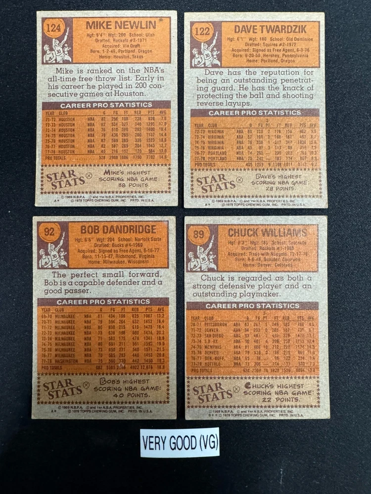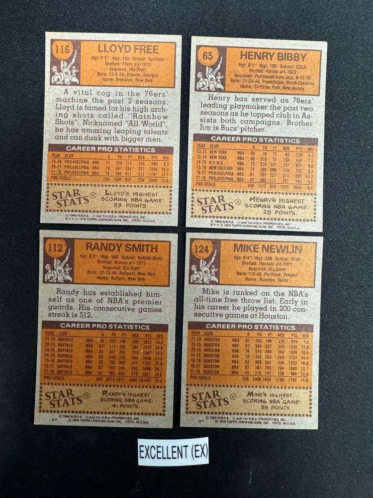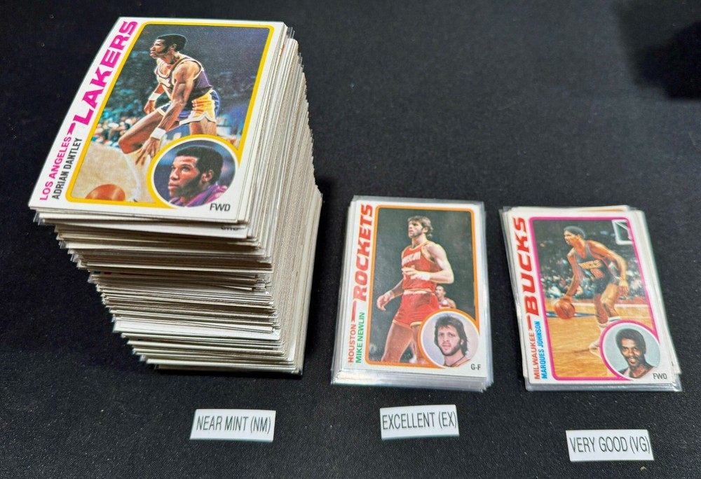 Complete Your Card Set 1978-79 Topps Basketball Cards 1-132 (NM-VG) - You Pick - Complete Your Set Description 1978-79 Topps Basketball Cards 1-132 (NM-VG) - You Pick - Complete Your Set Choose the cards from this listing to complete your set. Please see destails below about card conditions, discounts, combined shipping, packaging, and tracking. Cards available in this set include: Base Cards Please see the separate listing(s) for the other cards in this same set: All cards for this set are included in this single listing. Visit my eBay store to see other sets: Complete Your Card Sets | eBay Stores Discounts Volume Priceing 2 cards - 10% off both 3 cards - 15% off all 3 4+ cards - 20% off all of my "complete your set" listing cards in the cart. Combined Shipping $0.69 cents for the first card and .15 cents for each additional card $5.00 max shipping per order for "complete your set" listings Conditions I have categorized the cards according to the eBay card condition guide so you have a good idea of the condition of each card. The condition is added to the end of each card name and I usually grade more stringent that the condition guide outlines. If more than one card with the same condition specified is available, I will select the best conditioned card for you. NM +: Near Mint or Better Minor issues on corners or edges if any EX : Excellent Excellent shape with some imperfections 1-3 corners may have dings VG : Very Good 3-4 corners are bent or rounded Rarely have 1 wrinkle or crease that doesn’t cross the entire face of the card. No staining or very little (not often) on front or back of card No tears, significantly damaged surfaces, or pen writings on them P : Poor Corners are bent or rounded May have 1 or more wrinkles or creases May have some sort of staining on the front or back of card PM : Poor w/ pen or pencil markings Some sort of pen or pencil marking on the card Typically, the number on the back is crossed out or highlighted Checklists that have boxes checked Examples : See the pictures on the listing for examples that show a good representation of the general conditions. Packaging Your cards will be well protected guaranteed! All cards are packaged in penny sleeves, placed in top loader hard sleeves, and wrapped in a team bag. Orders of 14 cards or less and under $20 will be safely packaged and shipped in a plain white envelope Orders of 15+ cards will be safely packaged in a bubble envelope Shipping Cards will be packaged and shipped the same or next business day. All orders will ship using " eBay Standard Envelope " or " USPS Ground Advantage " Orders under $20 with 14 cards or less will ship in a plain envelope using "eBay Standard Envelope" which includes eBay Tracking Orders over $20 OR include 15+ cards will be packaged in a bubble envelope and shipped using "USPS Ground Advantage" which includes regular USPS Tracking. Tracking NOTE : Cards shipped with the "eBay Standard Envelope" tracking are scanned and the tracking is marked as "Delivered" when they arrive at the destination post office. It will take a couple additional days BEFORE the cards arrive at the your address. Please contact if you are experiencing delays longer than expected.