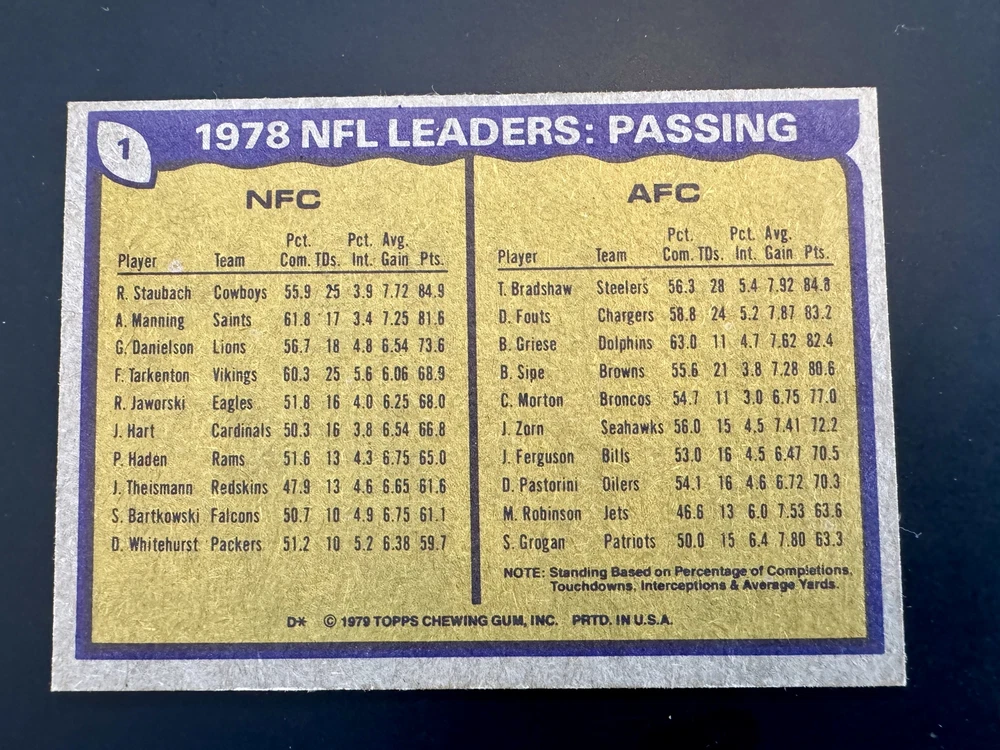 Complete Your Card Set 1979 Topps Football Cards 1-250 (EX-NM) - You Pick - Complete Your Set Description 1979 Topps Football Cards 1-250 (EX-NM) - You Pick - Complete Your Set Choose the cards from this listing to complete your set. Please see destails below about card conditions, discounts, combined shipping, packaging, and tracking. Cards available in this set include: Base Cards Please see the separate listing(s) for the other cards in this same set: 1979 Topps Football Cards 1-250 (EX-NM) - You Pick - Complete Your Set 1979 Topps Football Cards 251-500 (EX-NM) - You Pick - Complete Your Set 1979 Topps Football Cards 501-528 (EX-NM) - You Pick - Complete Your Set Visit my eBay store to see other sets: Complete Your Card Sets | eBay Stores Discounts Volume Priceing 2 cards - 10% off both 3 cards - 15% off all 3 4+ cards - 20% off all of my "complete your set" listing cards in the cart. Combined Shipping $0.69 cents for the first card and .15 cents for each additional card $5.00 max shipping per order for "complete your set" listings Conditions All cards are in Excellent (EX) to Near Mint (NM) condition. Due to the age of the cards some may have minor corner dings or surface imperfections. Packaging Your cards will be well protected guaranteed! All cards are packaged in penny sleeves, placed in top loader hard sleeves, and wrapped in a team bag. Orders of 14 cards or less and under $20 will be safely packaged and shipped in a plain white envelope Orders of 15+ cards will be safely packaged in a bubble envelope Shipping Cards will be packaged and shipped the same or next business day. All orders will ship using " eBay Standard Envelope " or " USPS Ground Advantage " Orders under $20 with 14 cards or less will ship in a plain envelope using "eBay Standard Envelope" which includes eBay Tracking Orders over $20 OR include 15+ cards will be packaged in a bubble envelope and shipped using "USPS Ground Advantage" which includes regular USPS Tracking. Tracking NOTE : Cards shipped with the "eBay Standard Envelope" tracking are scanned and the tracking is marked as "Delivered" when they arrive at the destination post office. It will take a couple additional days BEFORE the cards arrive at the your address. Please contact if you are experiencing delays longer than expected.