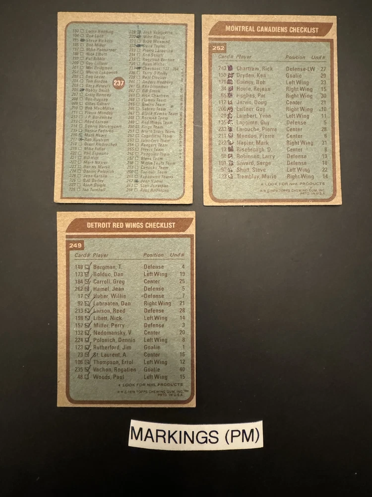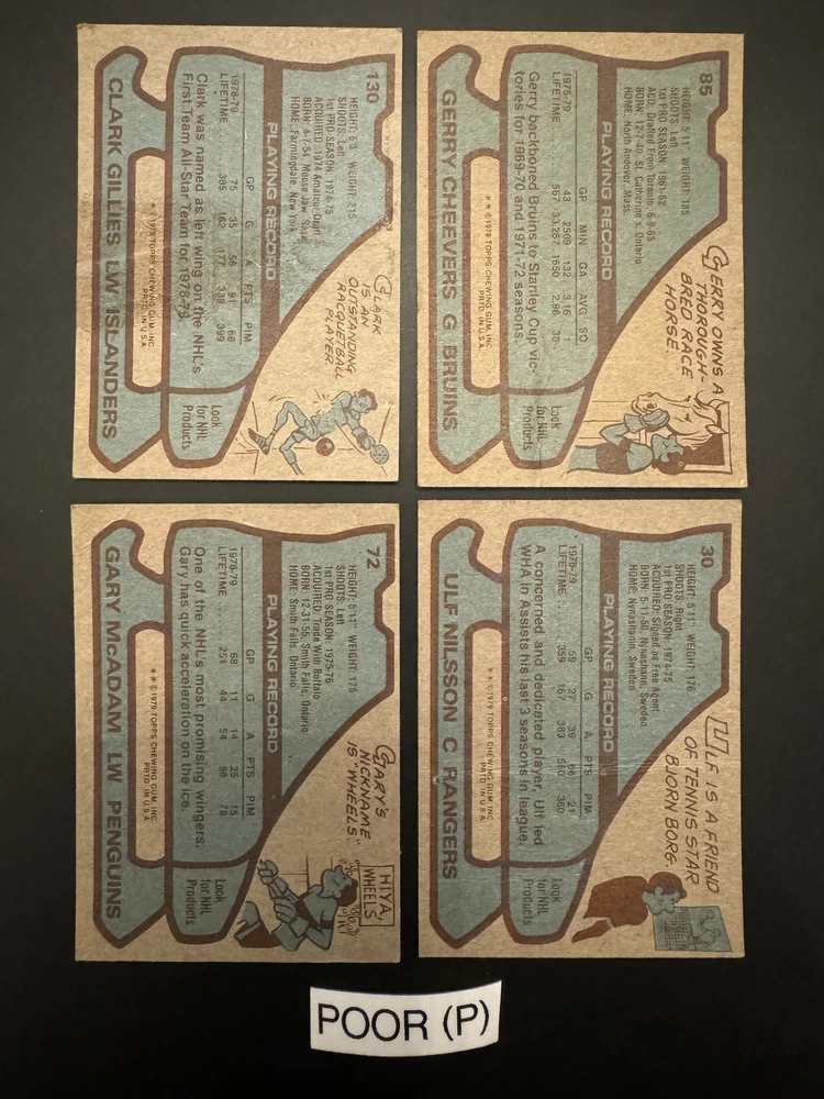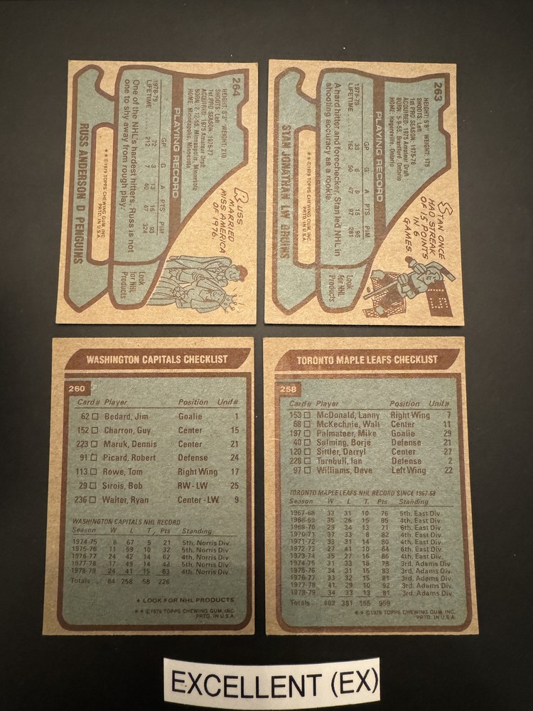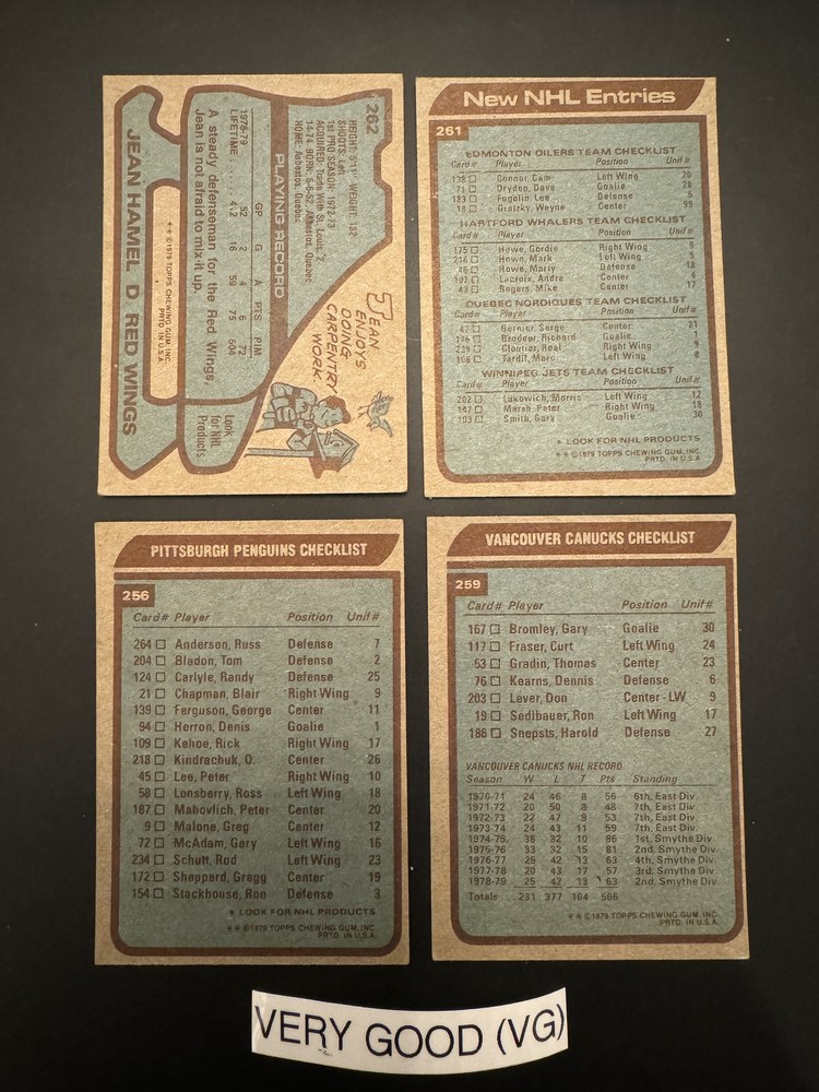Complete Your Card Set 1979-80 Topps Hockey Cards 1-250 (P-NM) - You Pick - Complete Your Set Description 1979-80 Topps Hockey Cards 1-250 (P-NM) - You Pick - Complete Your Set Choose the cards from this listing to complete your set. Please see destails below about card conditions, discounts, combined shipping, packaging, and tracking. Cards available in this set include: Base Cards Please see the separate listing(s) for the other cards in this same set: 1979-80 Topps Hockey Cards 1-250 (P-NM) - You Pick - Complete Your Set 1979-80 Topps Hockey Cards 251-264 (P-NM) - You Pick - Complete Your Set Visit my eBay store to see other sets: Complete Your Card Sets | eBay Stores Discounts Volume Priceing 2 cards - 5% off both 3 cards - 10% off all 3 4+ cards - 15% off all of my "complete your set" listing cards in the cart. Combined Shipping $0.69 cents for the first card and .15 cents for each additional card $5.00 max shipping per order for "complete your set" listings Conditions I have categorized the cards according to the eBay card condition guide so you have a good idea of the condition of each card. The condition is added to the end of each card name and I usually grade more stringent that the condition guide outlines. If more than one card with the same condition specified is available, I will select the best conditioned card for you. NM +: Near Mint or Better Minor issues on corners or edges if any EX : Excellent Excellent shape with some imperfections 1-3 corners may have dings VG : Very Good 3-4 corners are bent or rounded Rarely have 1 wrinkle or crease that doesn’t cross the entire face of the card. No staining or very little (not often) on front or back of card No tears, significantly damaged surfaces, or pen writings on them P : Poor Corners are bent or rounded May have 1 or more wrinkles or creases May have some sort of staining on the front or back of card PM : Poor w/ pen or pencil markings Some sort of pen or pencil marking on the card Typically, the number on the back is crossed out or highlighted Checklists that have boxes checked Examples : See the pictures on the listing for examples that show a good representation of the general conditions. Packaging Your cards will be well protected guaranteed! All cards are packaged in penny sleeves, placed in top loader hard sleeves, and wrapped in a team bag. Orders of 14 cards or less and under $20 will be safely packaged and shipped in a plain white envelope Orders of 15+ cards will be safely packaged in a bubble envelope Shipping Cards will be packaged and shipped the same or next business day. All orders will ship using " eBay Standard Envelope " or " USPS Ground Advantage " Orders under $20 with 14 cards or less will ship in a plain envelope using "eBay Standard Envelope" which includes eBay Tracking Orders over $20 OR include 15+ cards will be packaged in a bubble envelope and shipped using "USPS Ground Advantage" which includes regular USPS Tracking. Tracking NOTE : Cards shipped with the "eBay Standard Envelope" tracking are scanned and the tracking is marked as "Delivered" when they arrive at the destination post office. It will take a couple additional days BEFORE the cards arrive at the your address. Please contact if you are experiencing delays longer than expected.