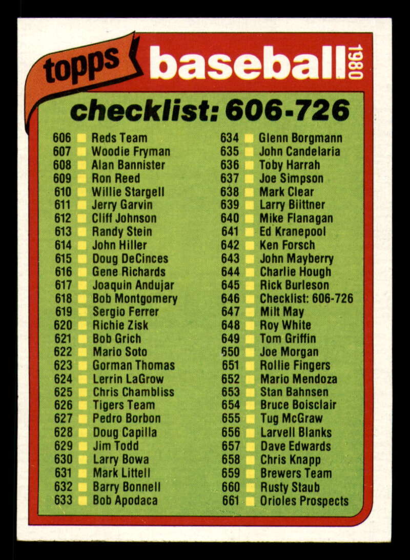 ALL MARTY'S STUFF The card in the scan is the card for sale. Each card has a high quality front and back scan of the item that you will receive. Please check the front and back pictures before buying. For combined shipping, please select all the cards that you would like from all of our many listings and have them in your shopping cart. We have a base shipping charge plus $0.05 for each additional card. Once you have made your selections, go to checkout and make one payment for the entire purchase. Multiple payments will result in multiple shipping charges. I f you have any questions, please ask . 1980 Topps Baseball #601 - #650 - Complete your set - Pick your card #601 Buddy Schultz EX Excellent Cardinals #601 Buddy Schultz NM Near Mint Cardinals (2)#601 Buddy Schultz NM Near Mint Cardinals (3)#601 Buddy Schultz NM Near Mint Cardinals #601 Buddy Schultz VG EX Very Good Exce Cardinals #602 Brian Downing NRMT oc Angels #602 Brian Downing NM Near Mint Angels (2)#602 Brian Downing NRMT oc Angels #602 Brian Downing EX+ oc Angels #603 Jack Billingham EX++ Excellent++ Tigers #603 Jack Billingham NM Near Mint Tigers (2)#603 Jack Billingham NM Near Mint Tigers (3)#603 Jack Billingham NM Near Mint Tigers (4)#603 Jack Billingham NM Near Mint Tigers #604 Glenn Adams NM Near Mint Twins #604 Glenn Adams NRMT oc Twins (2)#604 Glenn Adams NM Near Mint Twins (3)#604 Glenn Adams NM Near Mint Twins #605 Terry Forster NRMT-OC Dodgers #605 Terry Forster NM Near Mint Dodgers (2)#605 Terry Forster NM Near Mint Dodgers (3)#605 Terry Forster NM Near Mint Dodgers #605 Terry Forster EX+ oc Dodgers #606 John McNamara EX Excellent Reds #606 John McNamara NM Near Mint Reds (2)#606 John McNamara NM Near Mint Reds (3)#606 John McNamara NM Near Mint Reds (4)#606 John McNamara NM Near Mint Reds #607 Woodie Fryman NM Near Mint Expos #607 Woodie Fryman oc Expos (2)#607 Woodie Fryman NM Near Mint Expos #607 Woodie Fryman NRMT oc Expos (3)#607 Woodie Fryman NM Near Mint Expos #608 Alan Bannister EX NM White Sox #608 Alan Bannister EX+ oc White Sox #608 Alan Bannister NM Near Mint White Sox (2)#608 Alan Bannister NM Near Mint White Sox (3)#608 Alan Bannister NM Near Mint White Sox #609 Ron Reed NM Near Mint Phillies (2)#609 Ron Reed NM Near Mint Phillies (3)#609 Ron Reed NM Near Mint Phillies #609 Ron Reed miscut Phillies (4)#609 Ron Reed NM Near Mint Phillies #610 Willie Stargell NM Near Mint Pirates #610 Willie Stargell NRMT oc Pirates #610 Willie Stargell EX+ oc Pirates (2)#610 Willie Stargell NM Near Mint Pirates #610 Willie Stargell EX NM Pirates #611 Jerry Garvin VG EX Very Good Exce Blue Jays #611 Jerry Garvin EX+ oc Blue Jays #611 Jerry Garvin NM Near Mint Blue Jays #611 Jerry Garvin miscut Blue Jays (2)#611 Jerry Garvin NM Near Mint Blue Jays #612 Cliff Johnson EX++ Excellent++ Indians #612 Cliff Johnson NM Near Mint Indians (2)#612 Cliff Johnson NM Near Mint Indians (3)#612 Cliff Johnson NM Near Mint Indians #612 Cliff Johnson EX NM Indians #613 Randy Stein EX Excellent Mariners (2)#613 Randy Stein EX Excellent Mariners #613 Randy Stein NM Near Mint Mariners (2)#613 Randy Stein NM Near Mint Mariners (3)#613 Randy Stein NM Near Mint Mariners #614 John Hiller NM Near Mint Tigers (2)#614 John Hiller NM Near Mint Tigers #614 John Hiller miscut Tigers (3)#614 John Hiller NM Near Mint Tigers #615 Doug DeCinces EX Excellent Orioles #615 Doug DeCinces NM Near Mint Orioles (2)#615 Doug DeCinces NM Near Mint Orioles (3)#615 Doug DeCinces NM Near Mint Orioles (4)#615 Doug DeCinces NM Near Mint Orioles #616 Gene Richards EX NM Padres #616 Gene Richards EX Excellent Padres #616 Gene Richards miscut Padres #616 Gene Richards NM Near Mint Padres #617 Joaquin Andujar NRMT oc Astros (2)#617 Joaquin Andujar NRMT oc Astros #617 Joaquin Andujar NM Near Mint Astros (2)#617 Joaquin Andujar NM Near Mint Astros (3)#617 Joaquin Andujar NM Near Mint Astros #618 Bob Montgomery VG EX Very Good Exce Red Sox #618 Bob Montgomery NM Near Mint Red Sox #618 Bob Montgomery EX Excellent Red Sox #618 Bob Montgomery miscut Red Sox (2)#618 Bob Montgomery NM Near Mint Red Sox #619 Sergio Ferrer NRMT-OC Mets #619 Sergio Ferrer NM Near Mint Mets #619 Sergio Ferrer EX Excellent Mets (2)#619 Sergio Ferrer NM Near Mint Mets (3)#619 Sergio Ferrer NM Near Mint Mets #620 Richie Zisk EX+ oc Rangers #620 Richie Zisk NM Near Mint Rangers (2)#620 Richie Zisk NM Near Mint Rangers (2)#620 Richie Zisk EX+ oc Rangers (3)#620 Richie Zisk EX+ oc Rangers #621 Bob Grich NRMT-OC Angels #621 Bob Grich miscut Angels #621 Bob Grich NM Near Mint Angels (2)#621 Bob Grich NM Near Mint Angels (3)#621 Bob Grich NM Near Mint Angels #622 Mario Soto NM Near Mint Reds (2)#622 Mario Soto NM Near Mint Reds (3)#622 Mario Soto NM Near Mint Reds #622 Mario Soto VG EX Very Good Exce Reds (4)#622 Mario Soto NM Near Mint Reds #623 Gorman Thomas NM Near Mint Brewers (2)#623 Gorman Thomas NM Near Mint Brewers (3)#623 Gorman Thomas NM Near Mint Brewers (4)#623 Gorman Thomas NM Near Mint Brewers #624 Lerrin LaGrow NRMT oc Dodgers #624 Lerrin LaGrow VG EX Very Good Exce Dodgers #624 Lerrin LaGrow miscut Dodgers #624 Lerrin LaGrow NM Near Mint Dodgers #624 Lerrin LaGrow dent Dodgers #625 Chris Chambliss EX NM Yankees #625 Chris Chambliss EX+ oc Yankees #625 Chris Chambliss NM Near Mint Yankees #625 Chris Chambliss oc Yankees (2)#625 Chris Chambliss NM Near Mint Yankees #626 Sparky Anderson NM Near Mint Tigers (2)#626 Sparky Anderson NM Near Mint Tigers (3)#626 Sparky Anderson NM Near Mint Tigers #626 Sparky Anderson EX Excellent Tigers #627 Pedro Borbon miscut Giants #627 Pedro Borbon oc Giants #627 Pedro Borbon dent Giants #627 Pedro Borbon NRMT oc Giants #627 Pedro Borbon VG EX Very Good Exce Giants #628 Doug Capilla EX NM Cubs #628 Doug Capilla NM Near Mint Cubs #628 Doug Capilla roller mark Cubs (2)#628 Doug Capilla NM Near Mint Cubs (3)#628 Doug Capilla NM Near Mint Cubs #629 Jim Todd NM Near Mint Athletics (2)#629 Jim Todd NM Near Mint Athletics (3)#629 Jim Todd NM Near Mint Athletics #629 Jim 